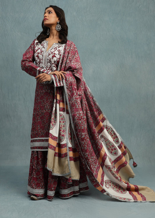 Red Rose Jaal Cotton Silk Hand Block Printed Sharara- (3 Pcs Set)