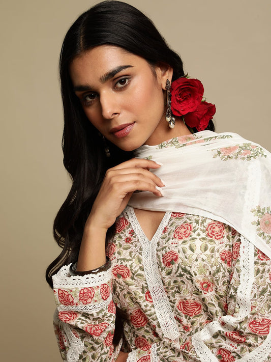 Coral Jaal Organic Cotton Hand Block Printed Kurta - (3 Pcs Set)