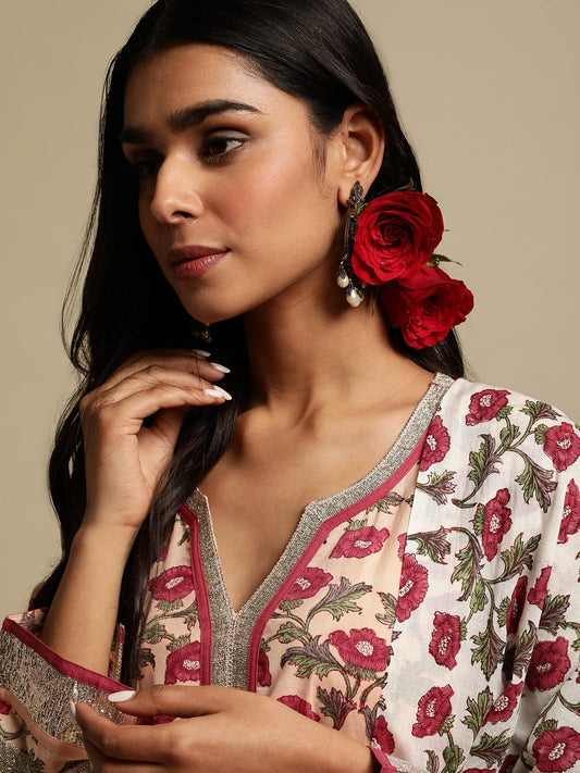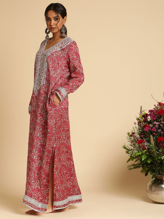 Red Rose Jaal Cotton Silk Hand Block Printed Kaftan