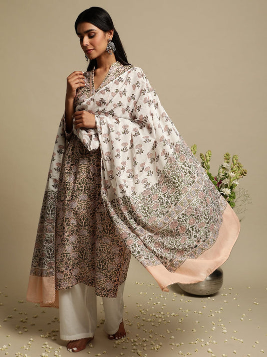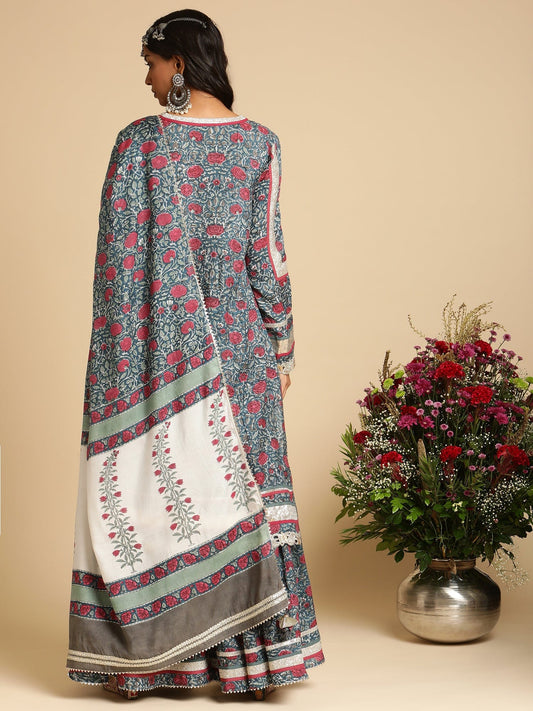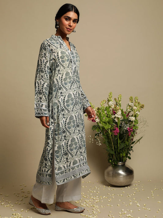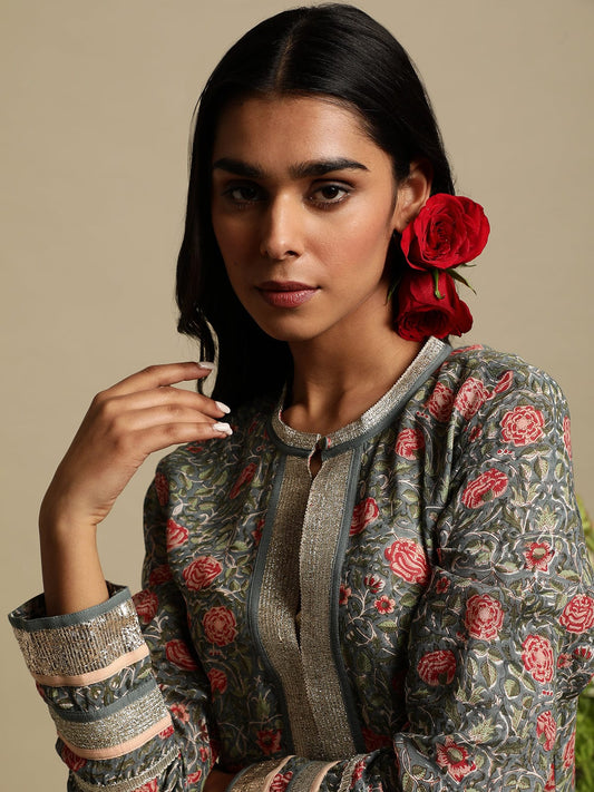 Grey Rose Jaal Cotton Silk Hand Block Printed Kurta- (3 Pcs Set)