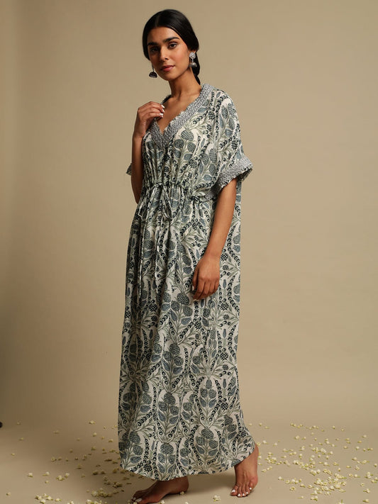 Grey Rose Jaal Cotton Silk Hand Block Printed Kaftan