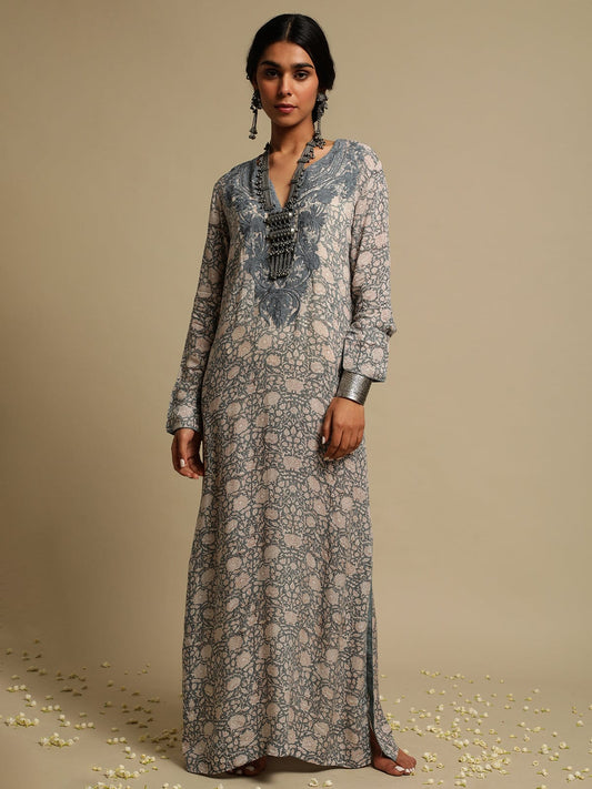 Grey/Brown Block Printed Cotton Silk Embroidered Kaftan