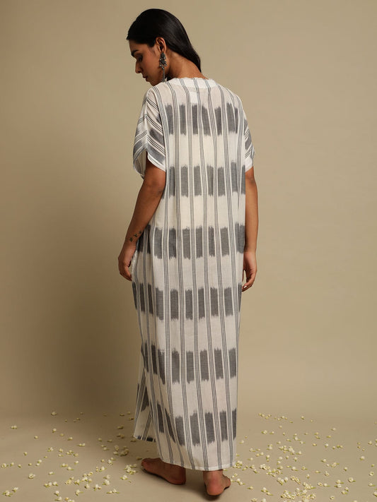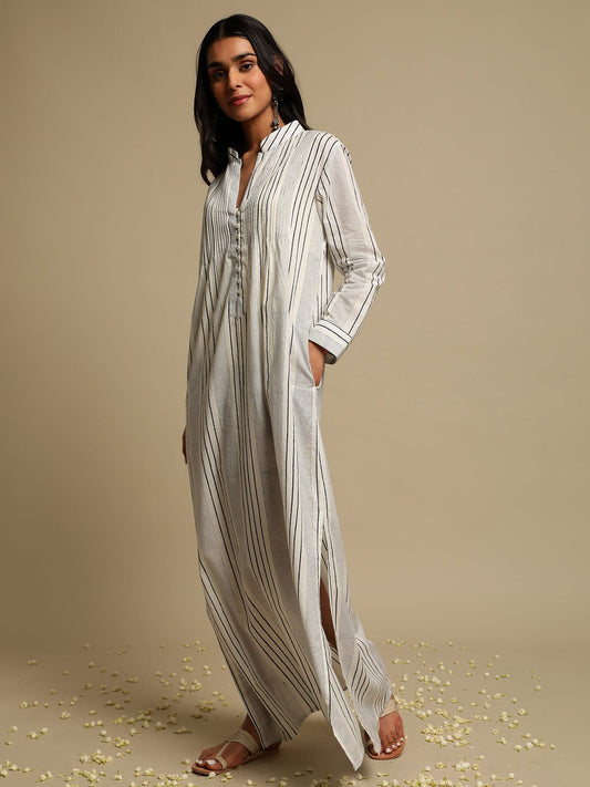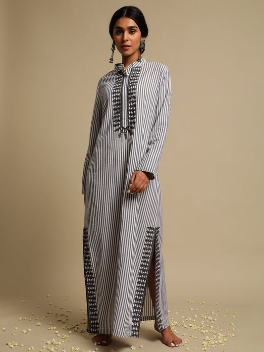 Grey Stripes Woven Cotton Embroidered Kaftan