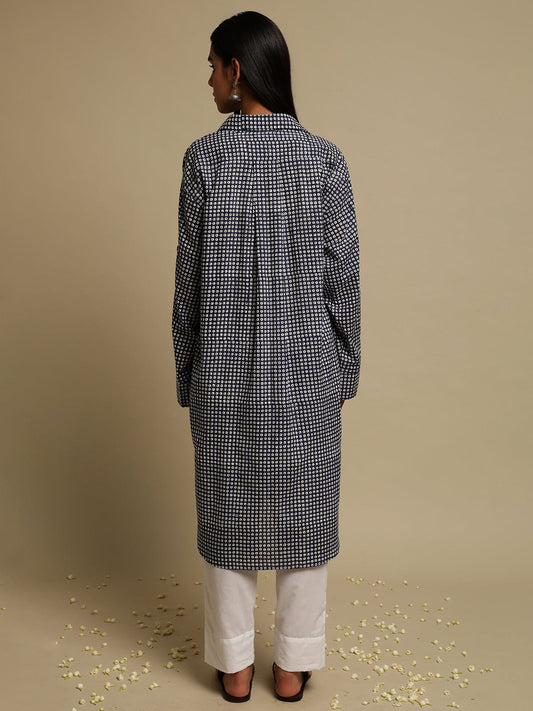 INDIGO POLKA ORGANIC COTTON HAND BLOCK PRINTED SHIRT DRESS