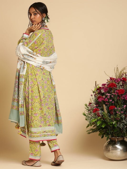 Light Green Peony Cotton Silk Hand Block Printed Kurta- (3 Pcs Set)
