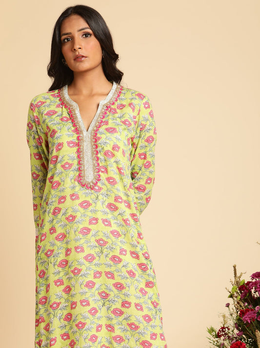 Lime Peony Organic Cotton Hand Block Printed Sharara- (3 Pcs Set)
