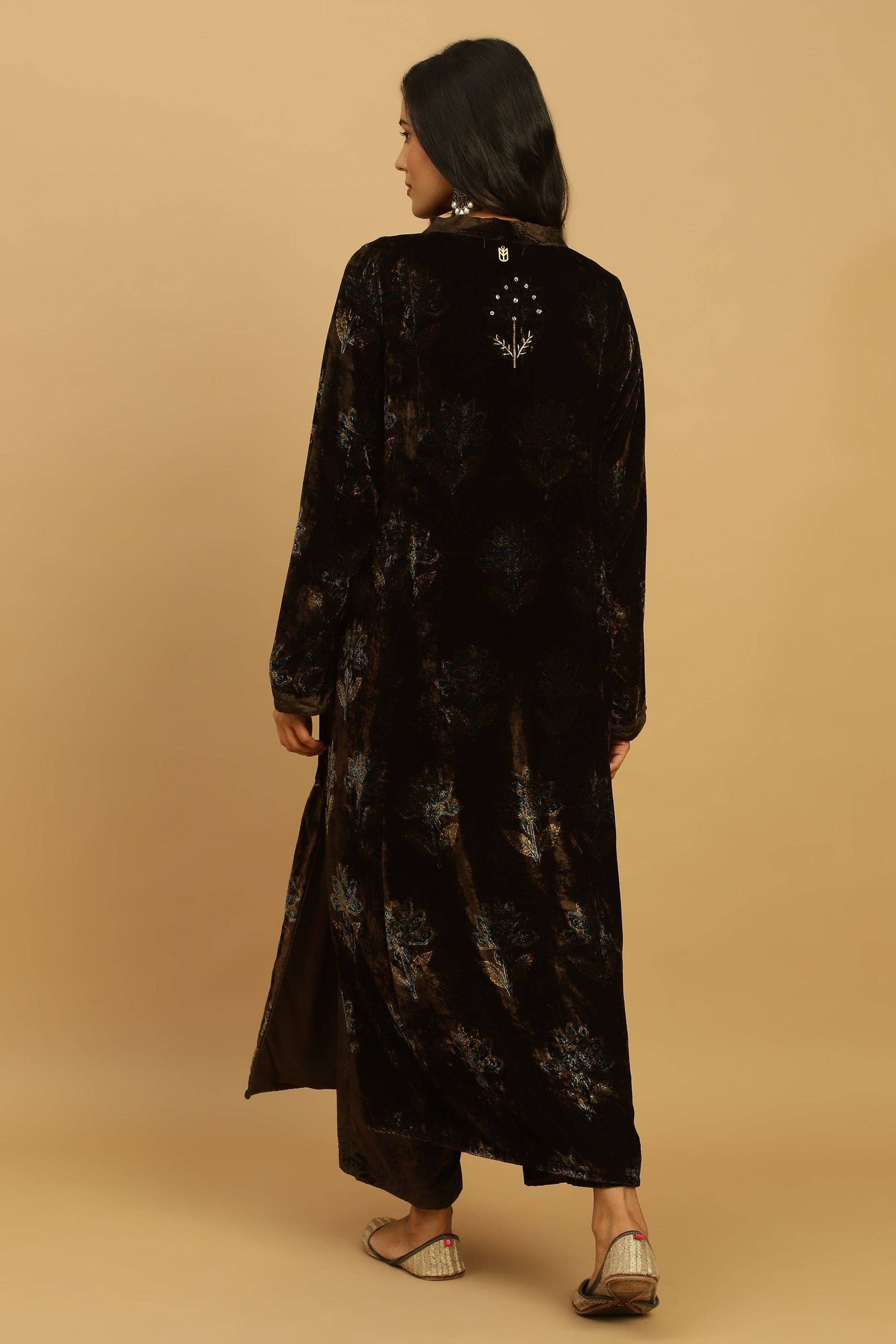 The chocolate bootie ajrakh printed tunic on velvet is detailed with antique hand embroidery. It has a plain velvet bottom