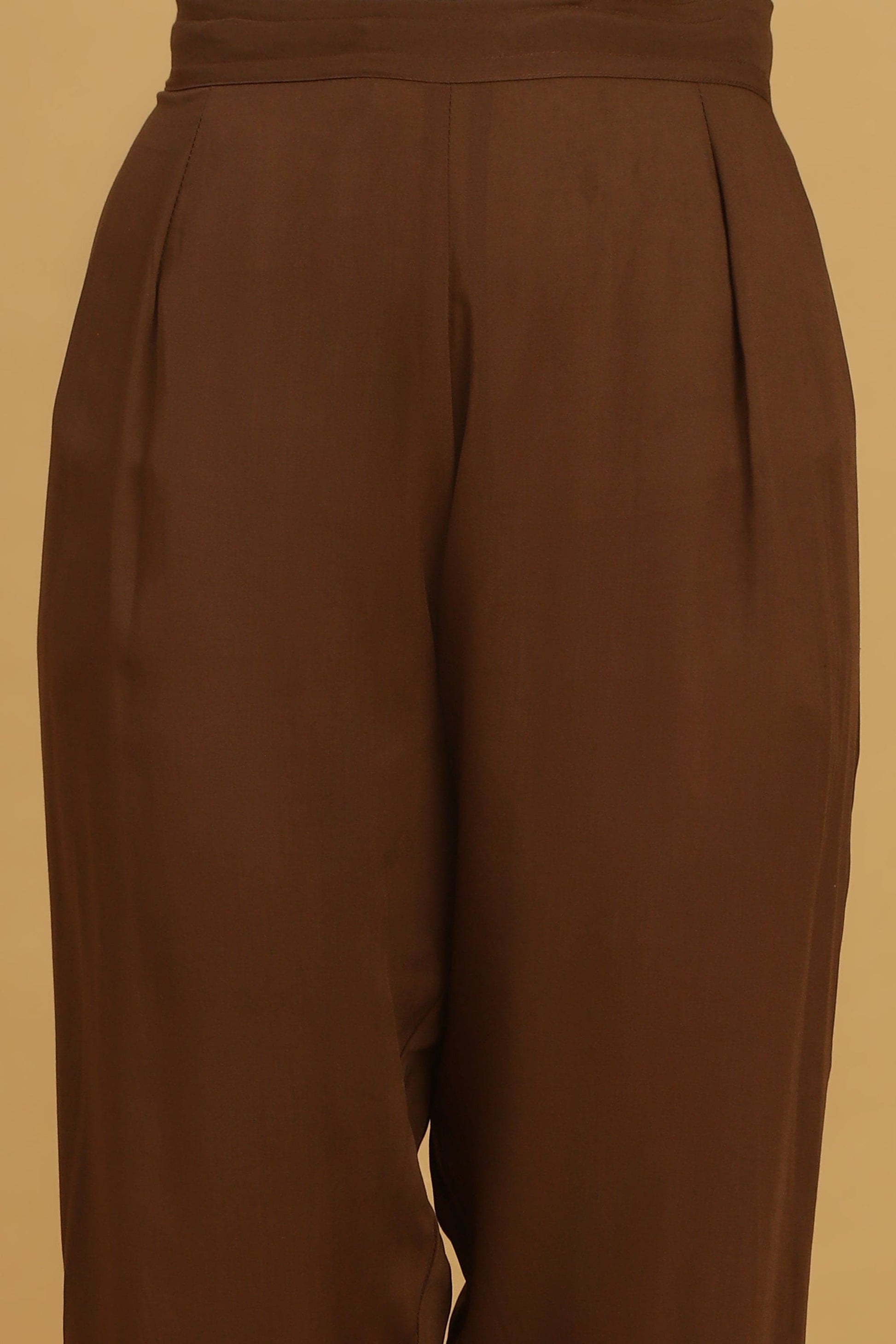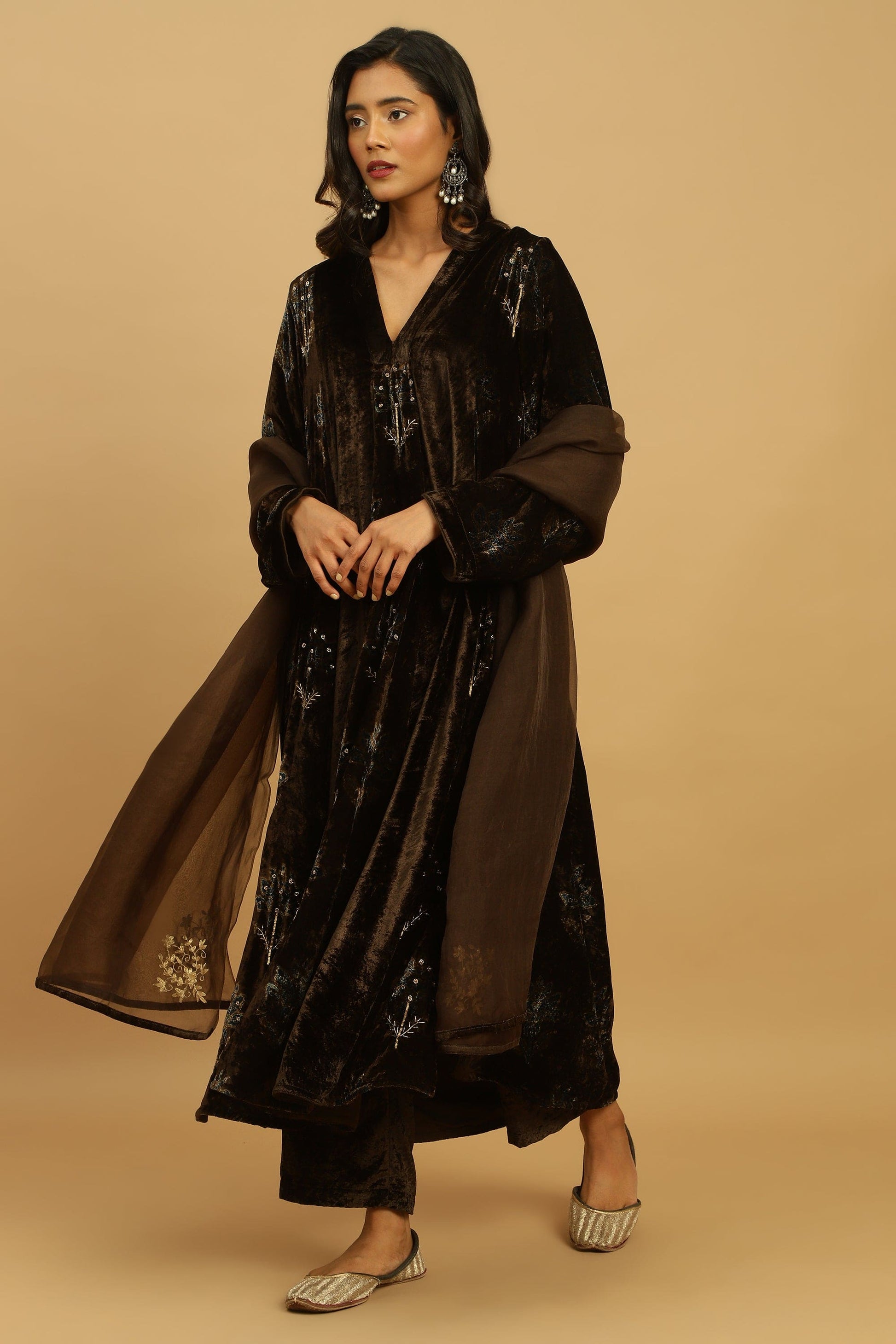 CHOCOLATE BOOTIE VELVET AJRAKH KURTA SET (3 Pcs)