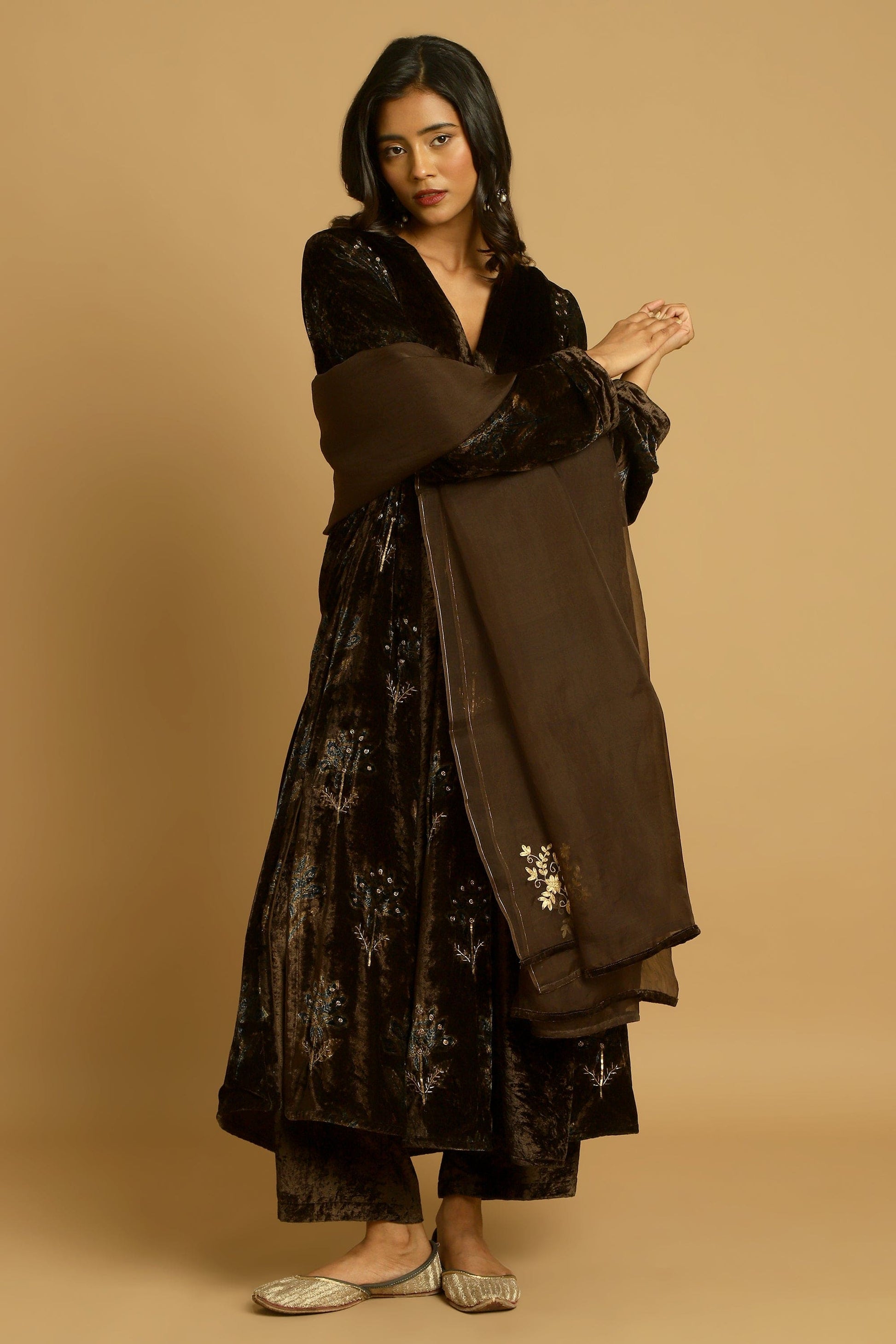 The chocolate bootie ajrakh printed tunic on velvet is detailed with antique hand embroidery. A gossamer silk organza duppata finely embroidered at the corners completes the ensemble. It has a plain velvet bottom