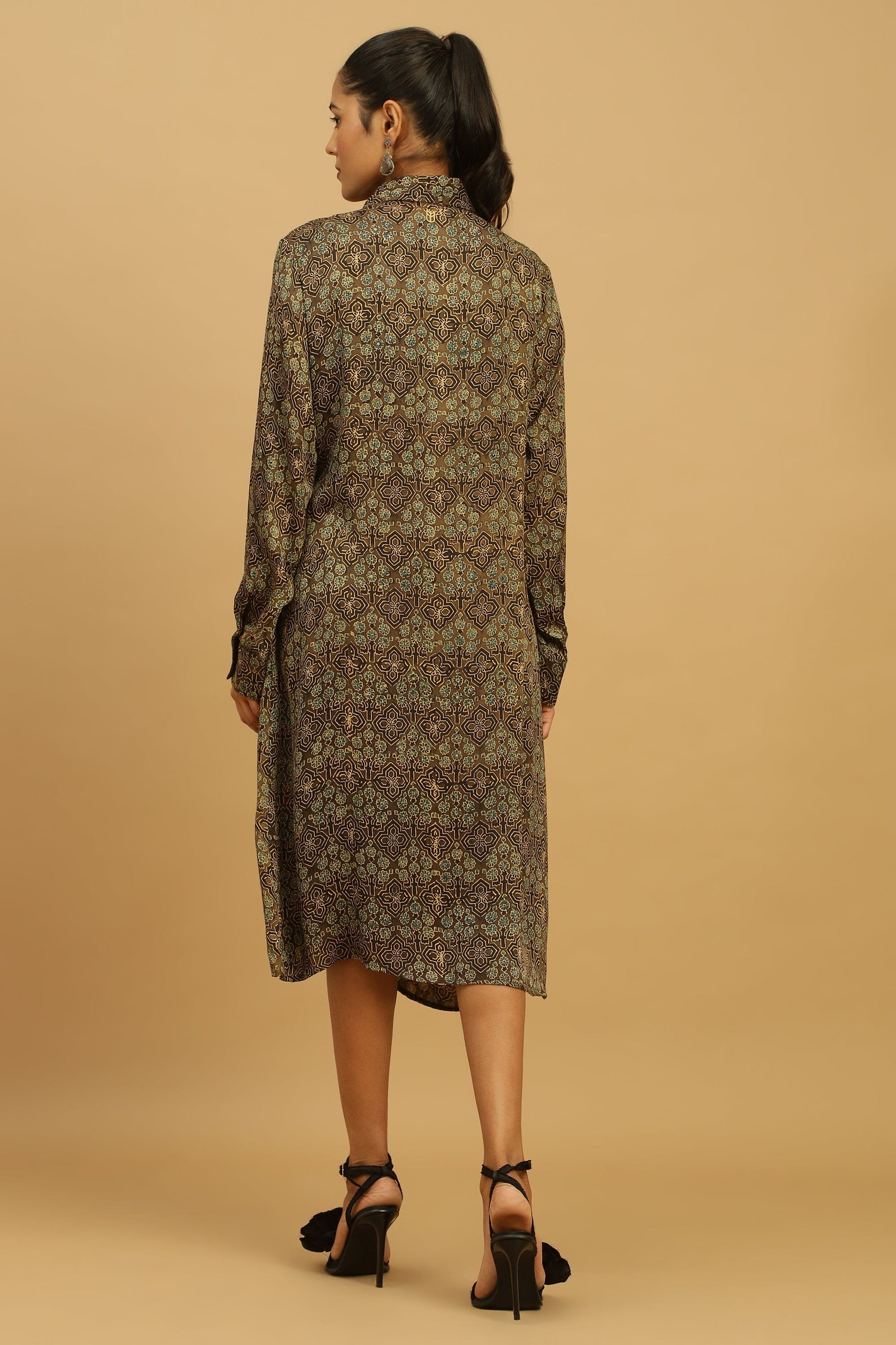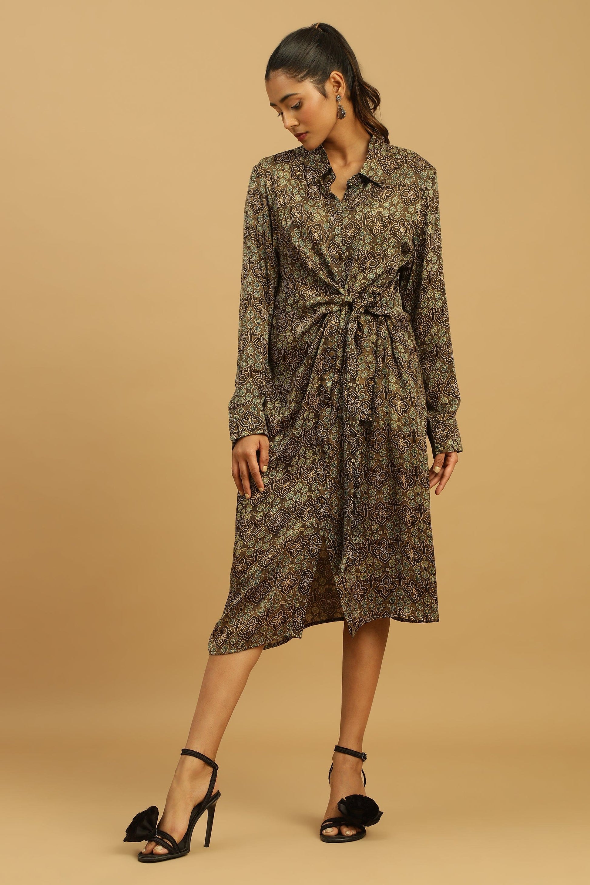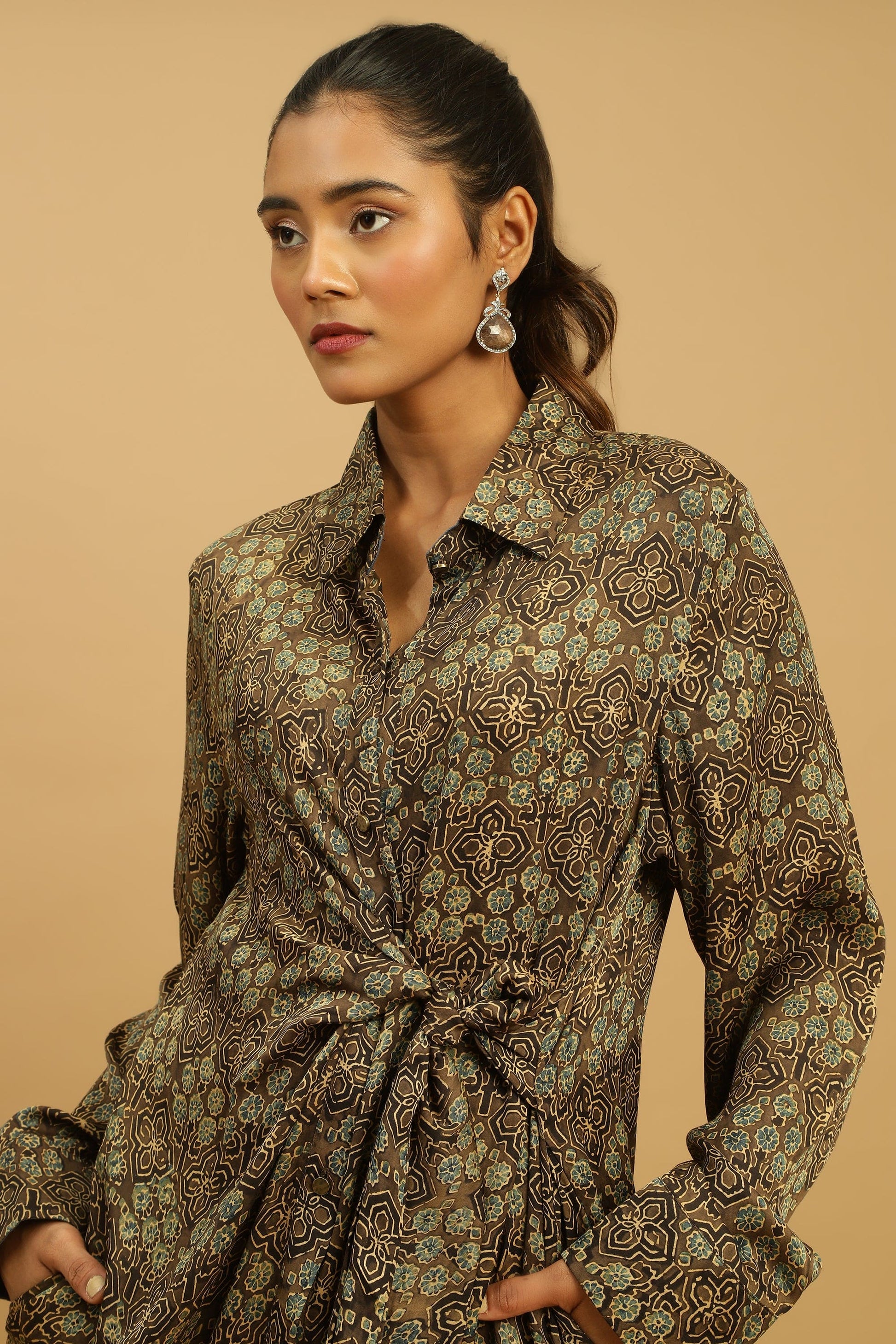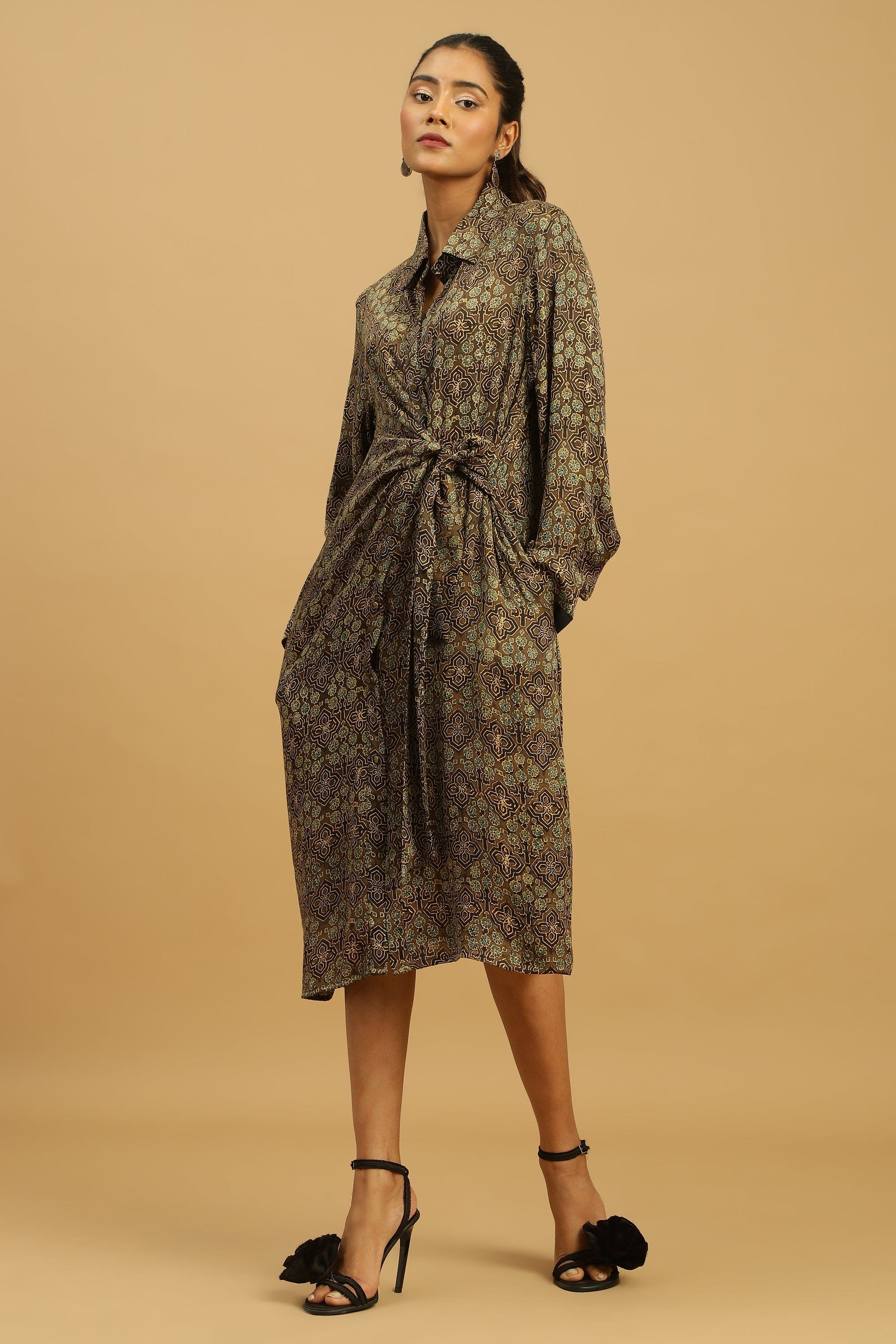 The taupe jaal ajrakh printed wrap dress in a soft flowing cotton silk.