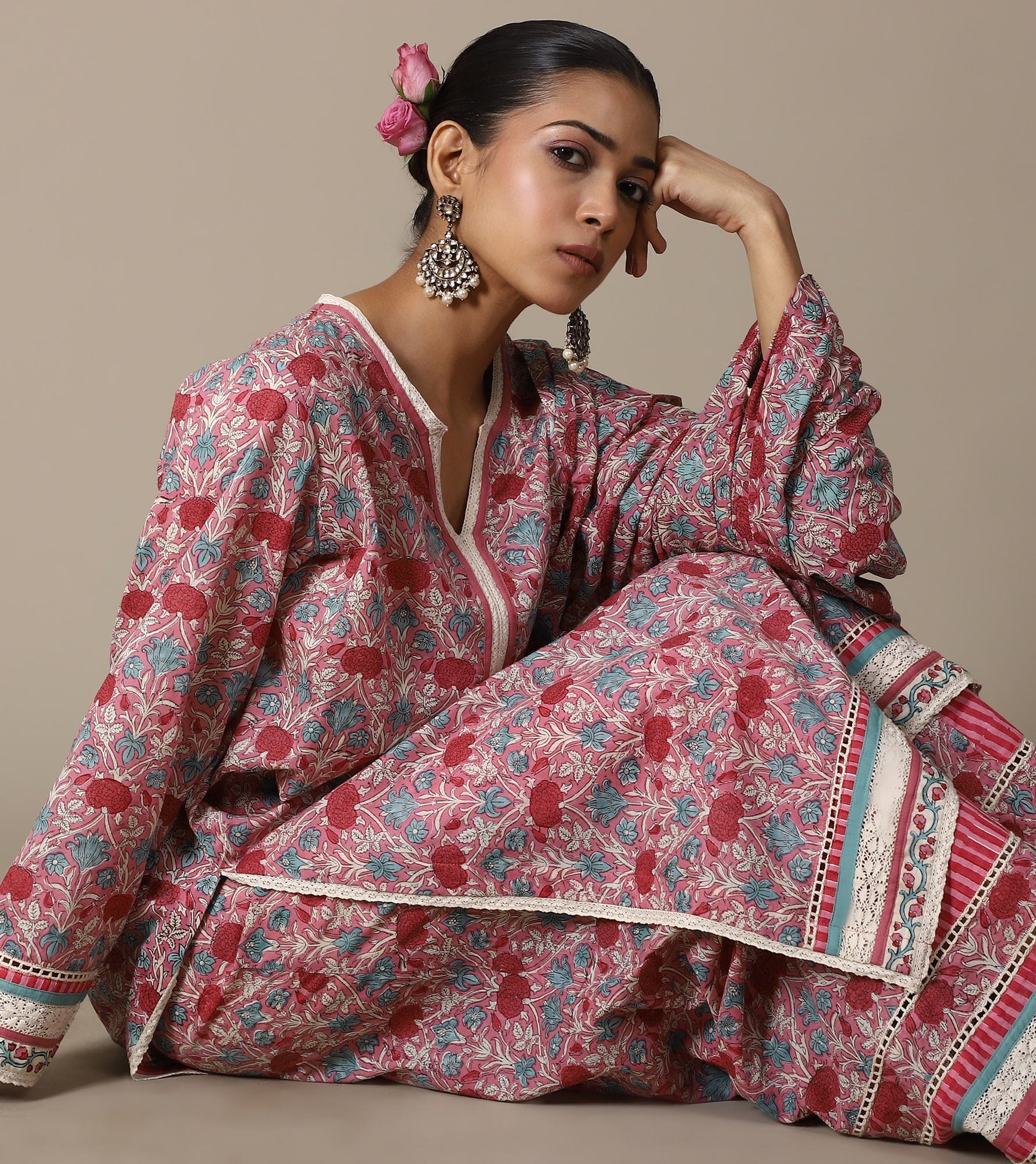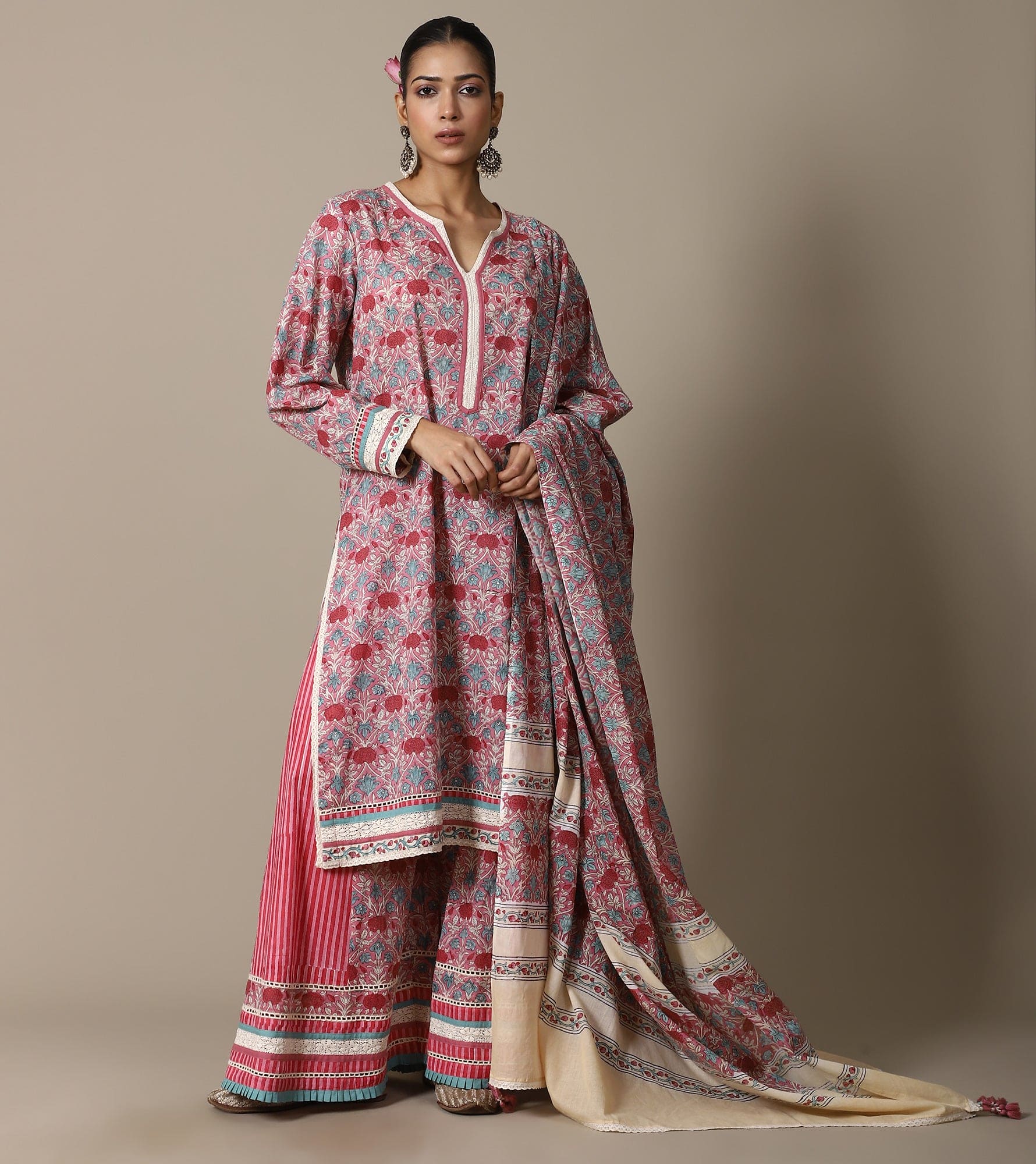 The set of a dramatic Kurta and a Dupatta is hand printed in an all over marigold pattern in shades of blush & fuchsia pink. The set has been detailed with delicate cotton laces. The printed dupatta is embellished with beautiful hand crafted tassels. It has a printed stripes kalidar bottom that is finished with lace & ribbon work.