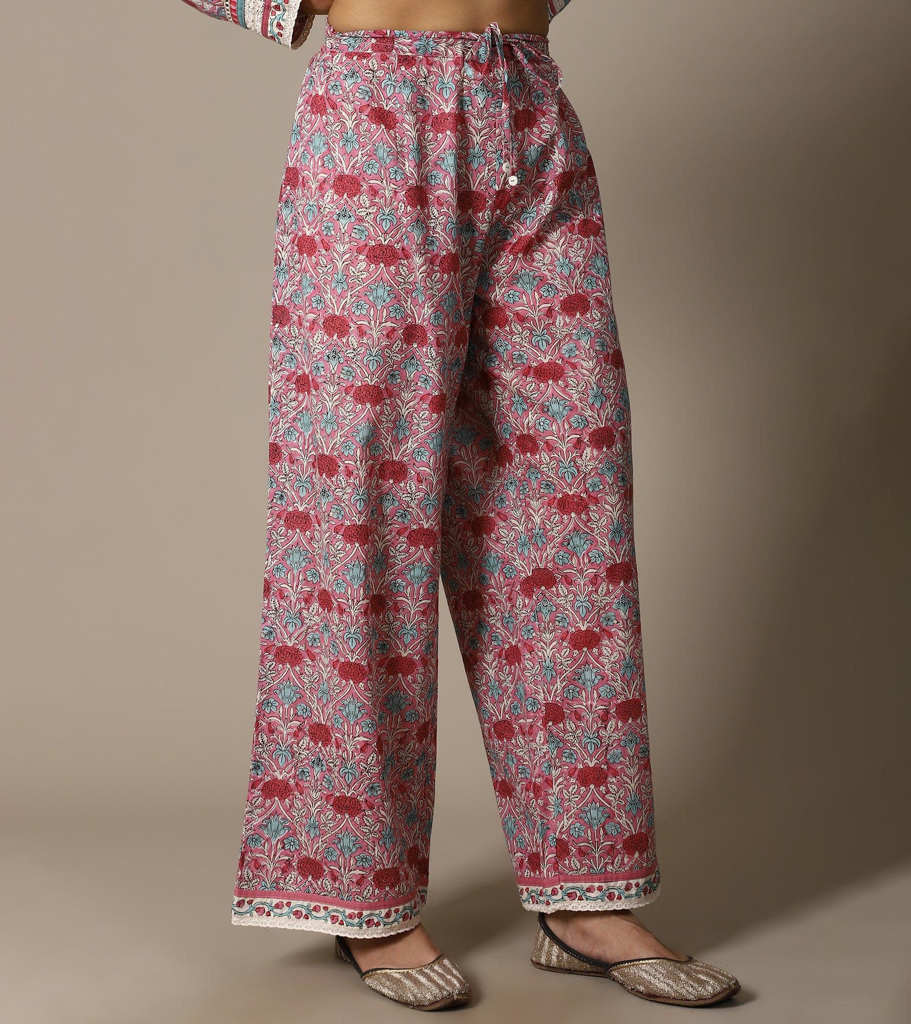 The set of a beautiful Kurta and a Dupatta is hand printed in an all over marigold pattern in shades of blush and fuchsia pink. The Kurta has been detailed with delicate cotton laces.