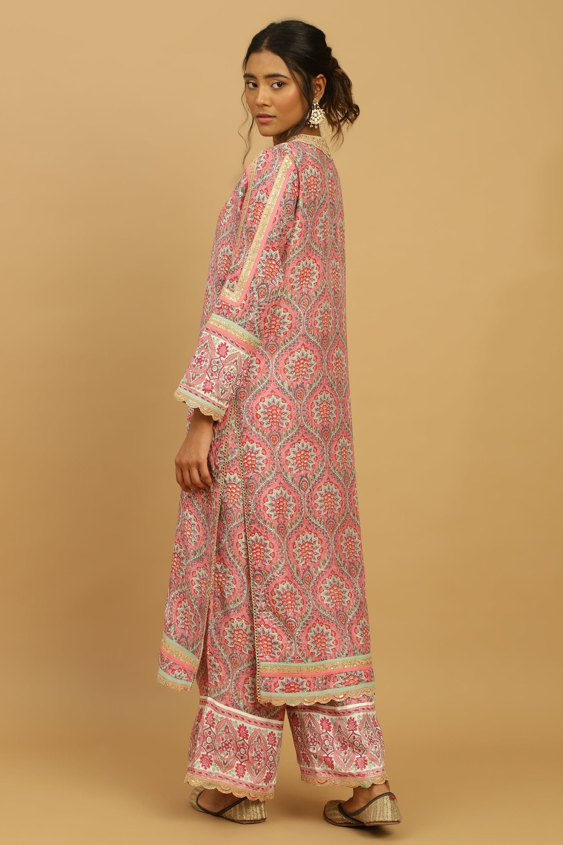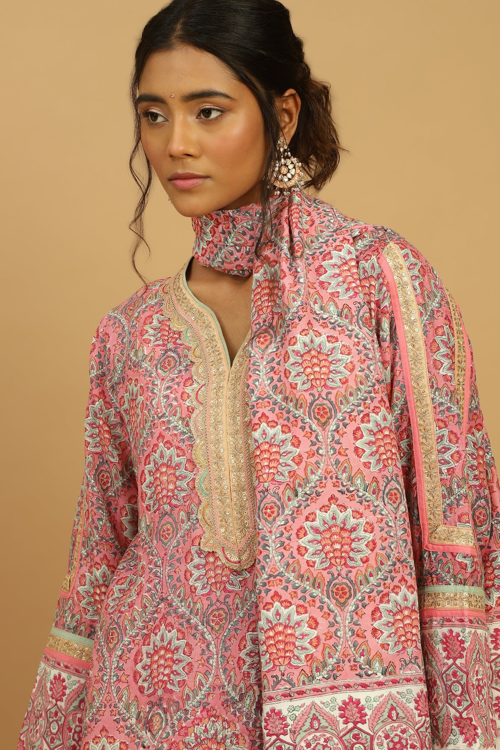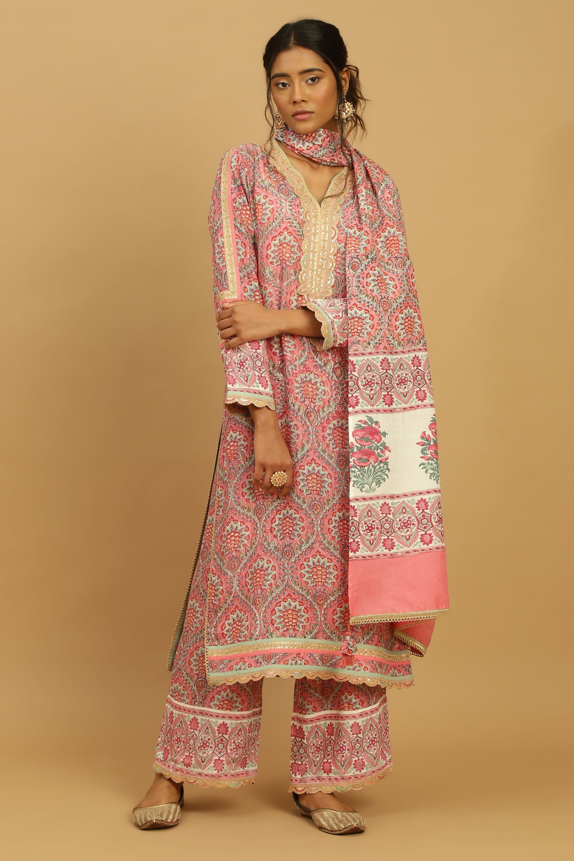 Yumi's Artisanal Clothing is hand block printed on cotton silk by our artisans. The set of a dramatic Kurta and a Dupatta is hand printed in an all over in a pink phool jaal. There is exquisite gota work on the yoke by village women on the ensemble. The printed dupatta has beautifully hand crafted tassels and gota. It has a printed phool jaal bottom in pink that is finished with the gota lace.