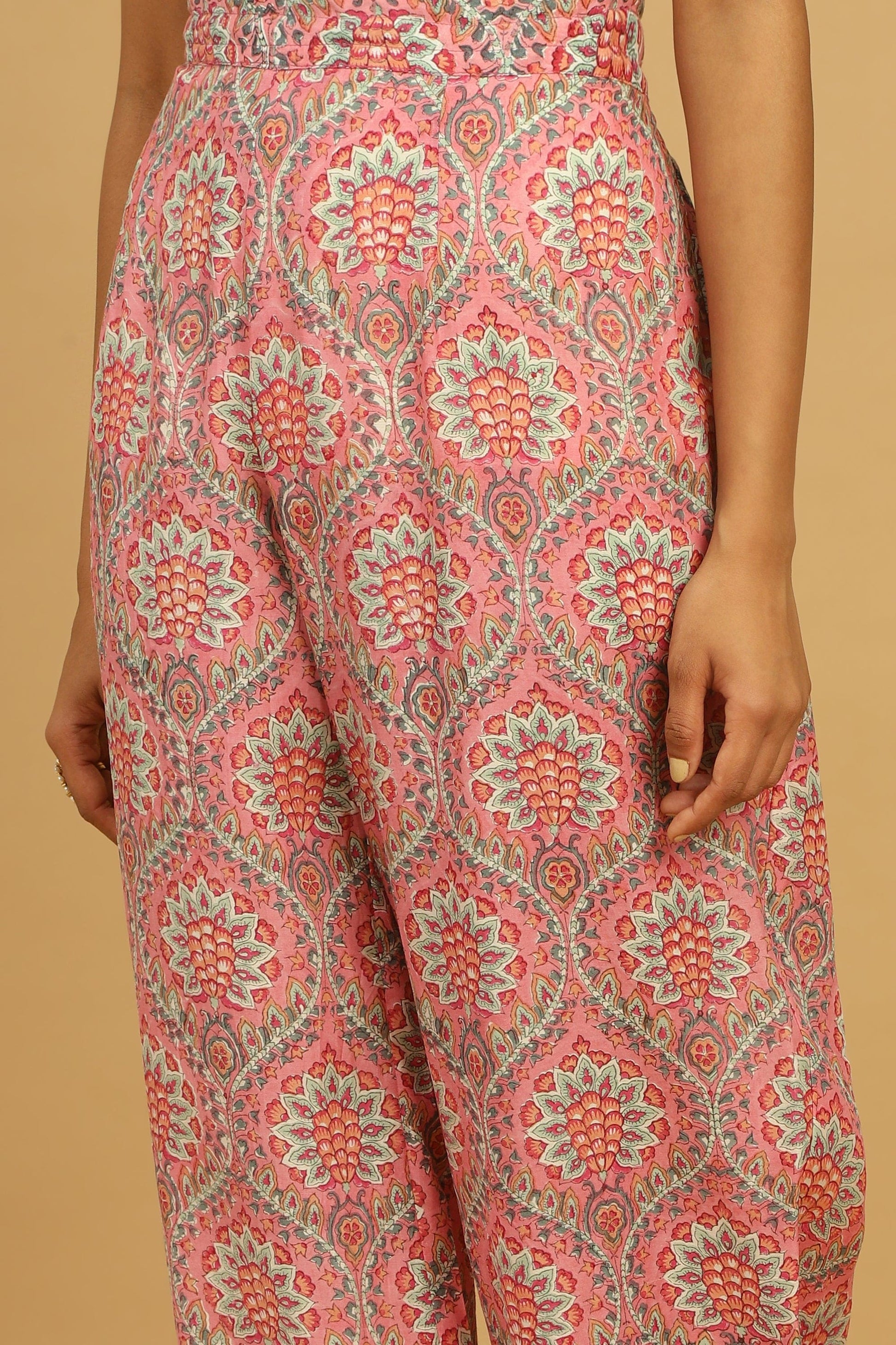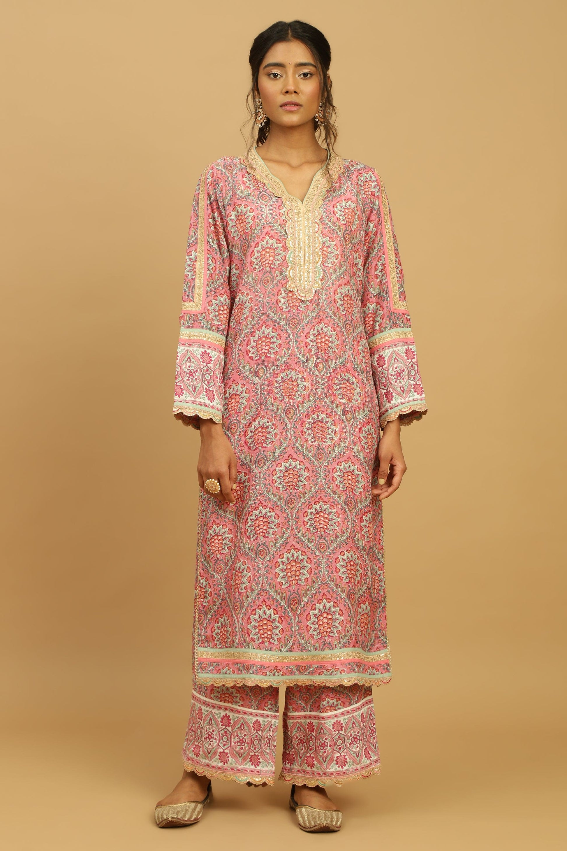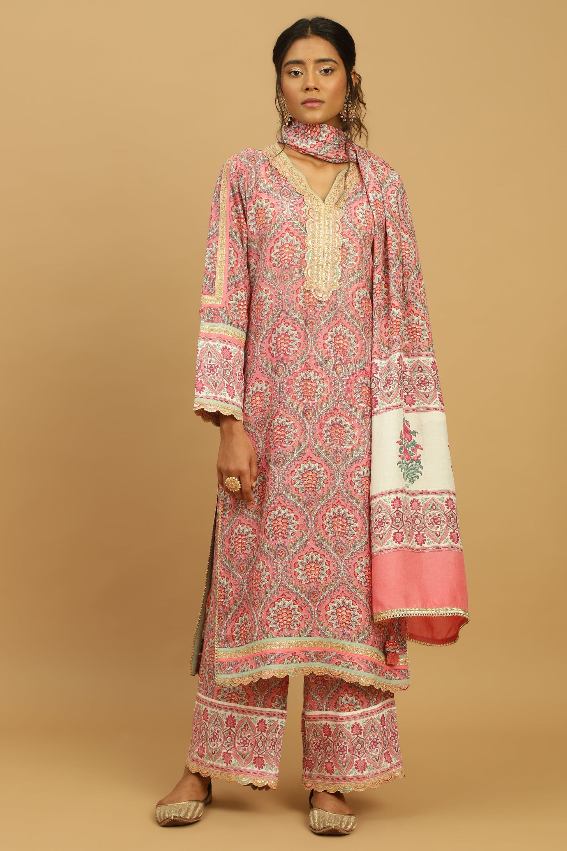 Yumi's Artisanal Clothing is hand block printed on cotton silk by our artisans. The set of a dramatic Kurta and a Dupatta is hand printed in an all over in a pink phool jaal. There is exquisite gota work on the yoke by village women on the ensemble. The printed dupatta has beautifully hand crafted tassels and gota. It has a printed phool jaal bottom in pink that is finished with the gota lace.