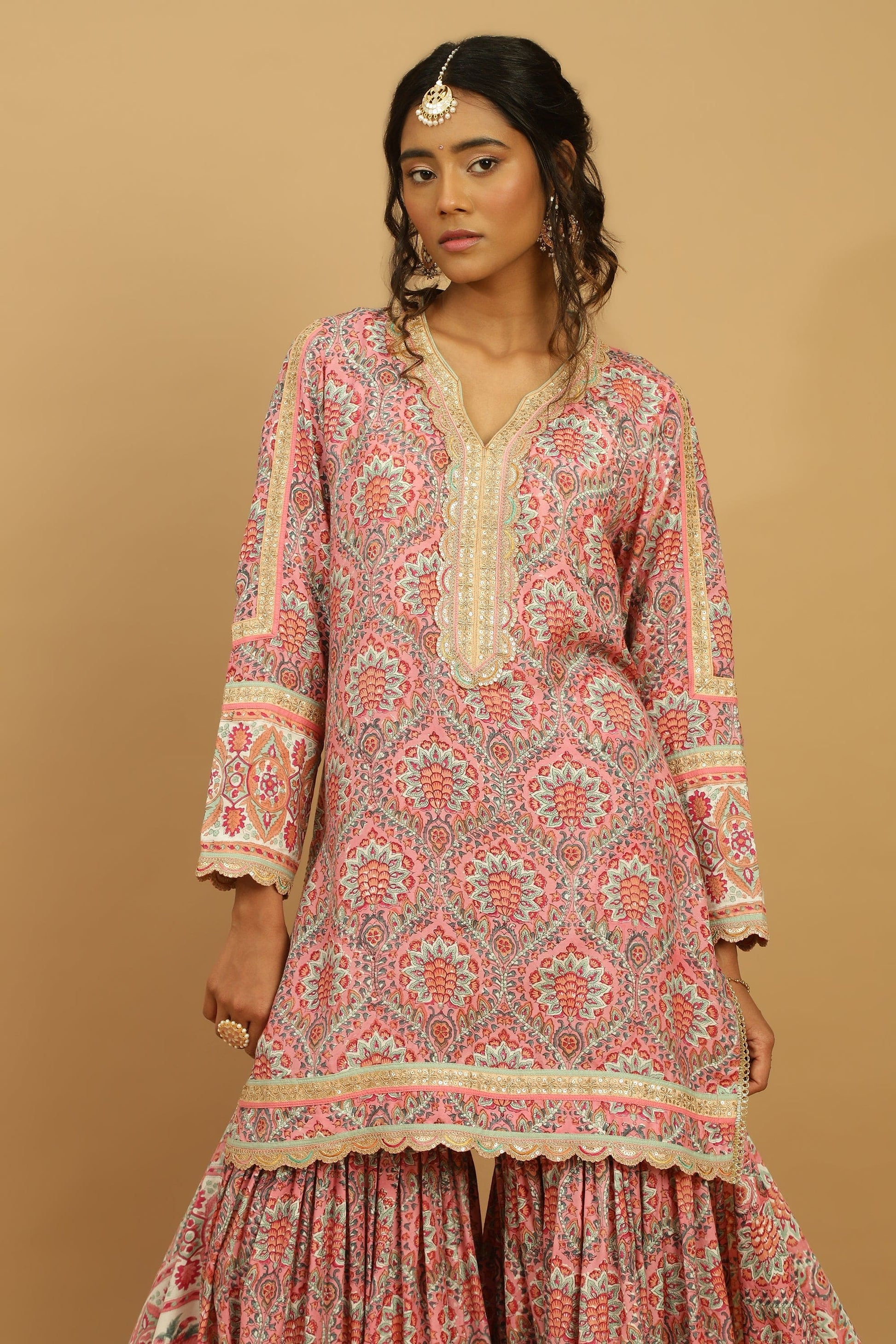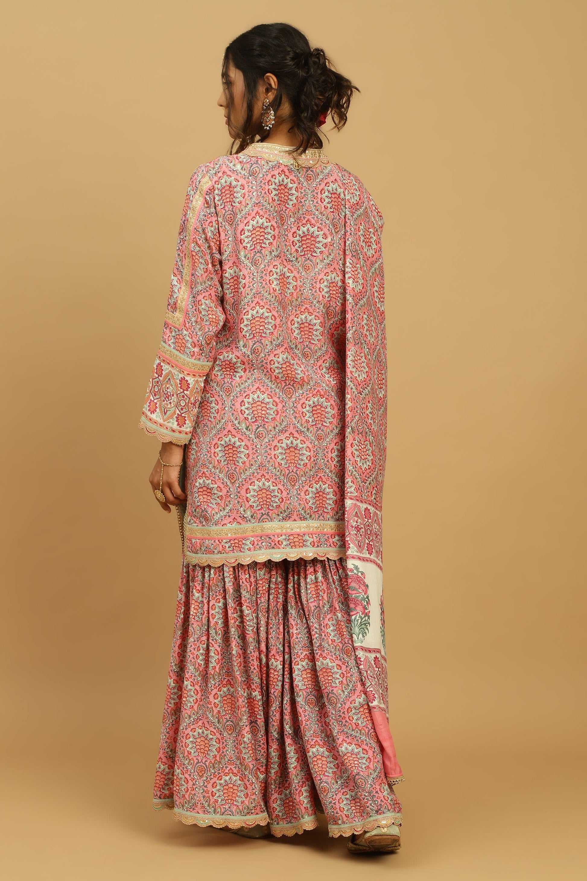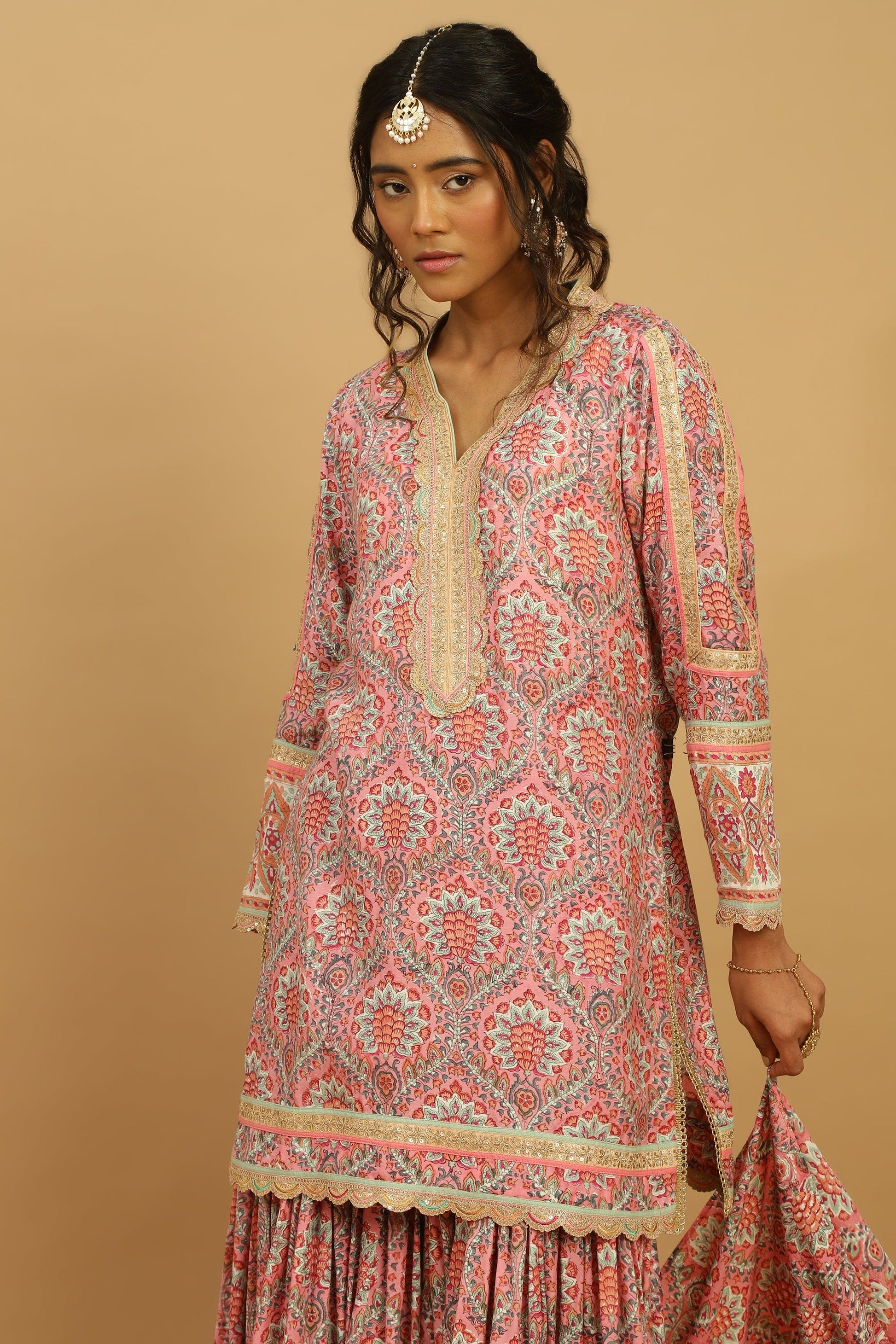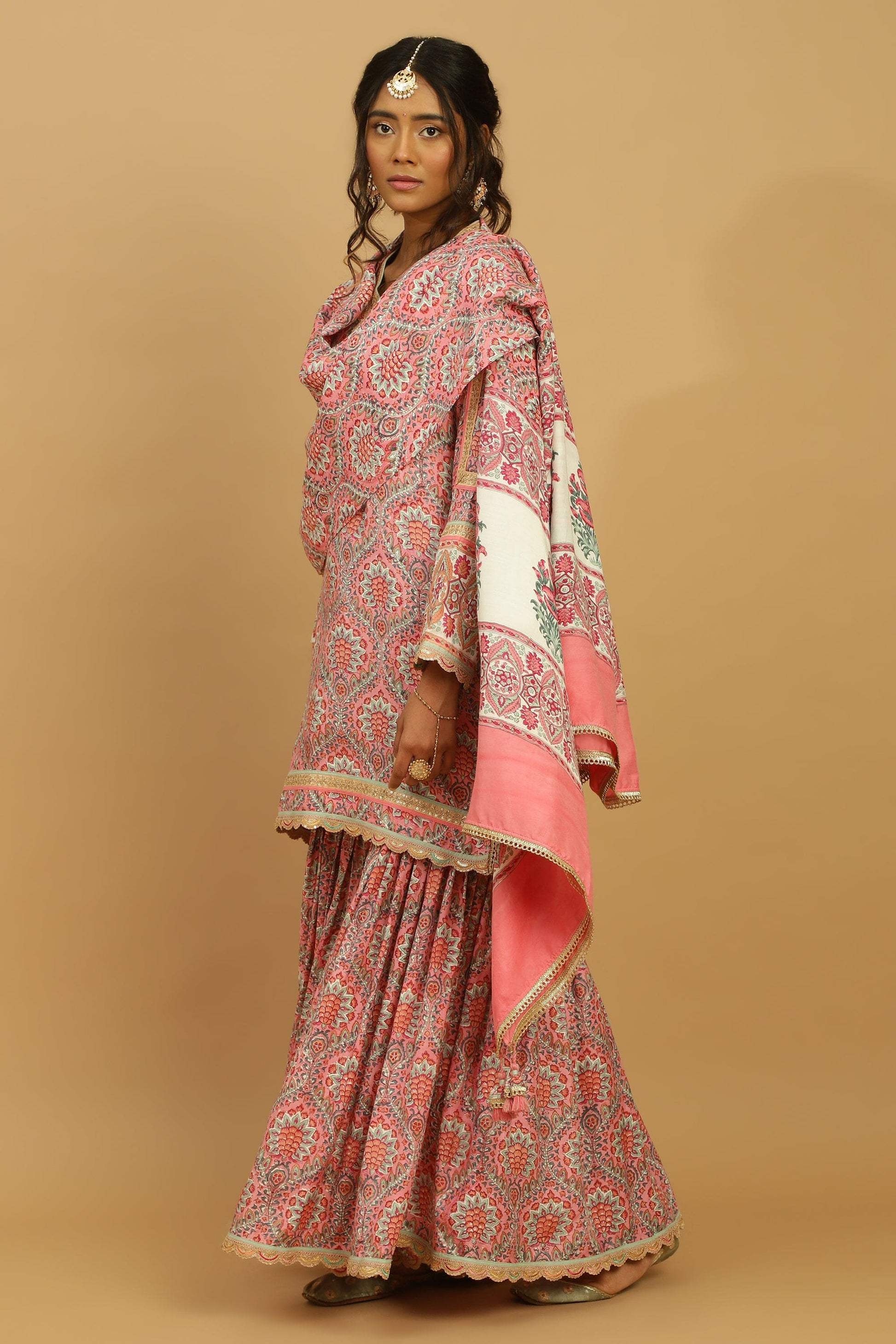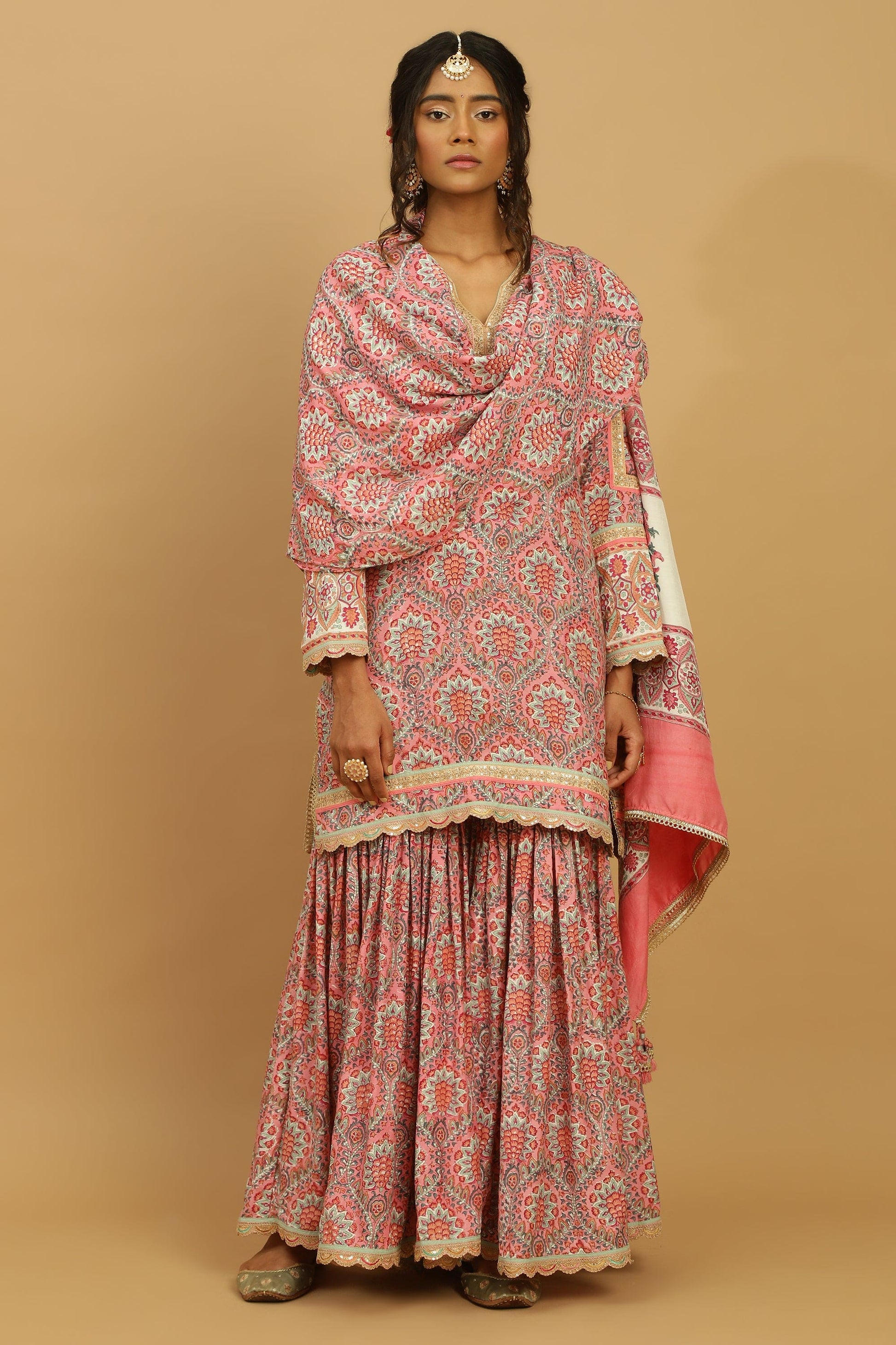 Yumi's Artisanal Clothing is hand block printed on cotton silk by our artisans. The set of a stylised Kurta, Sharara and a Dupatta is hand printed in a vibrant pink phool jaal pattern. There is exquisite gota work by village women on the ensemble. It has a beautifully designed sharara bottom with gota work.
