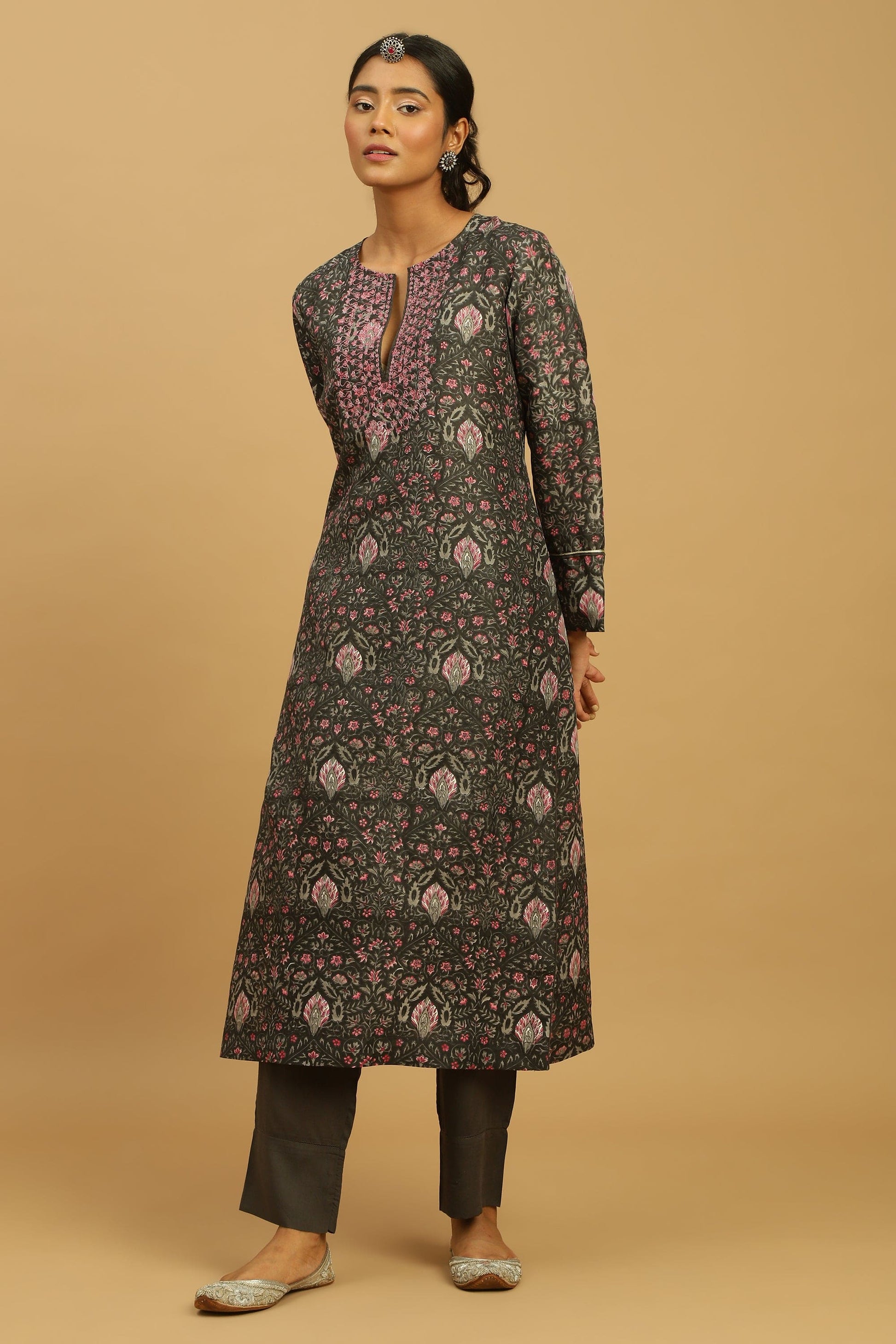 The Tunic is hand printed in the traditional black bootie jaali. It has silver and pink thread embroidery on the yoke.