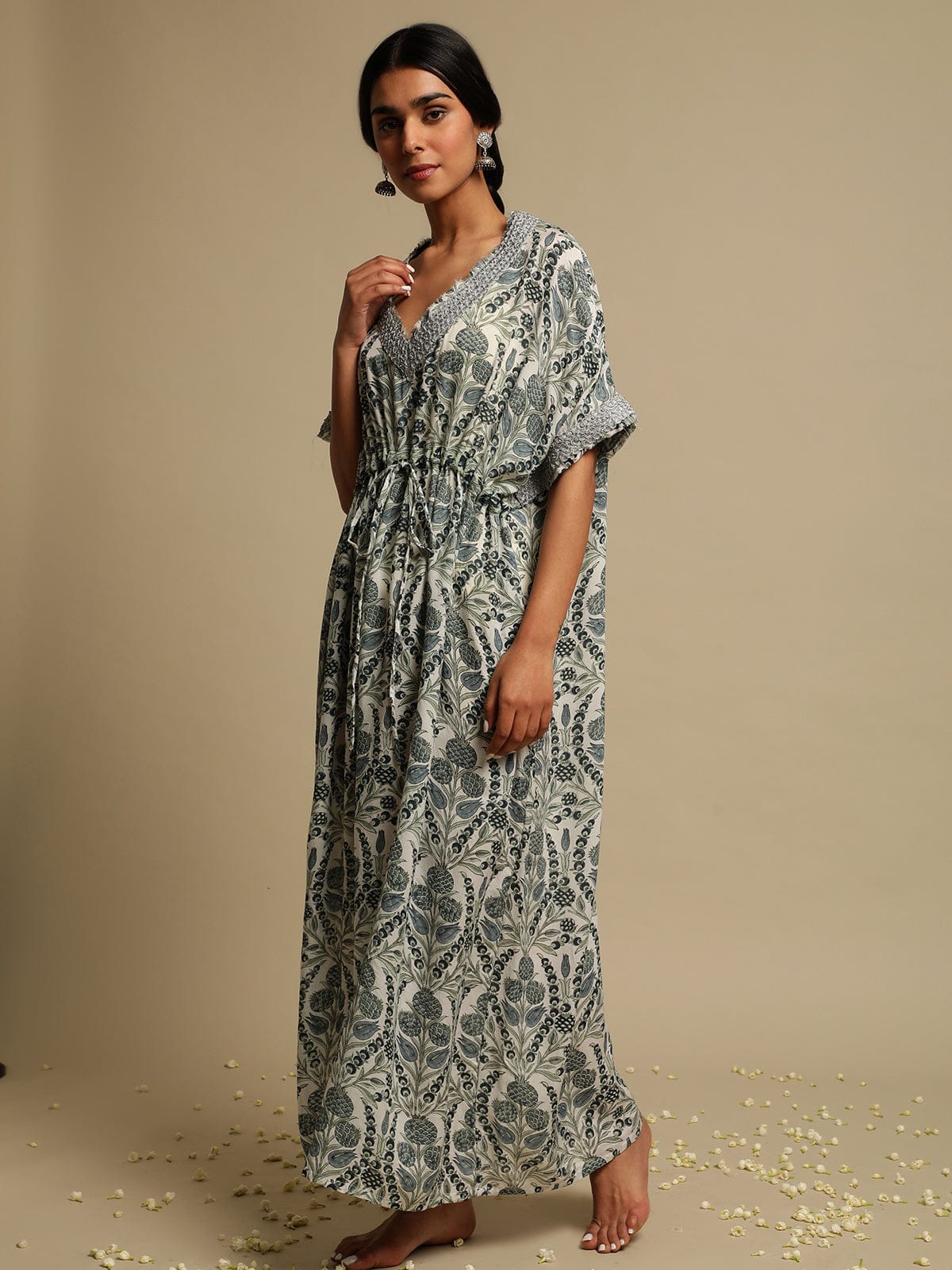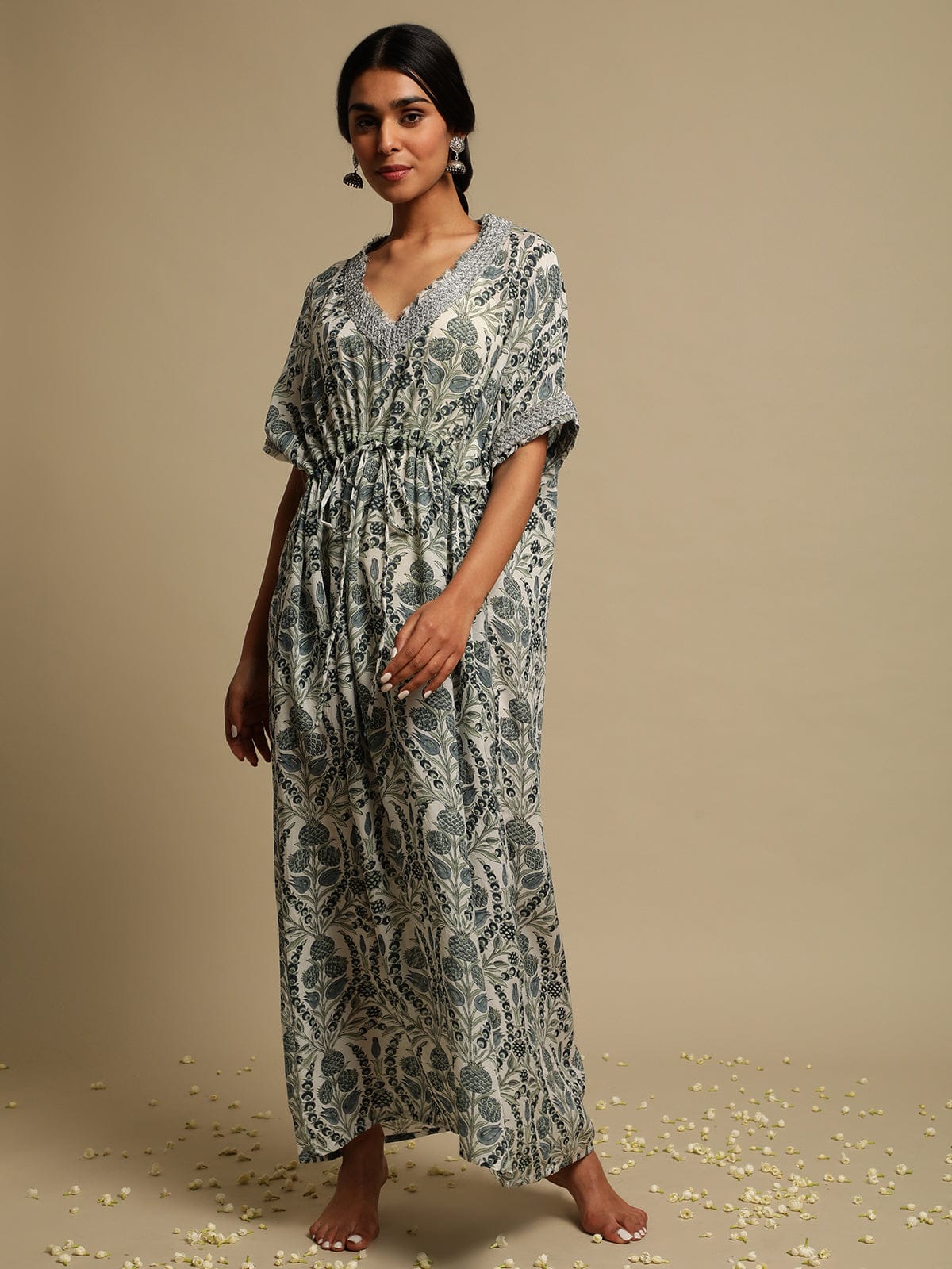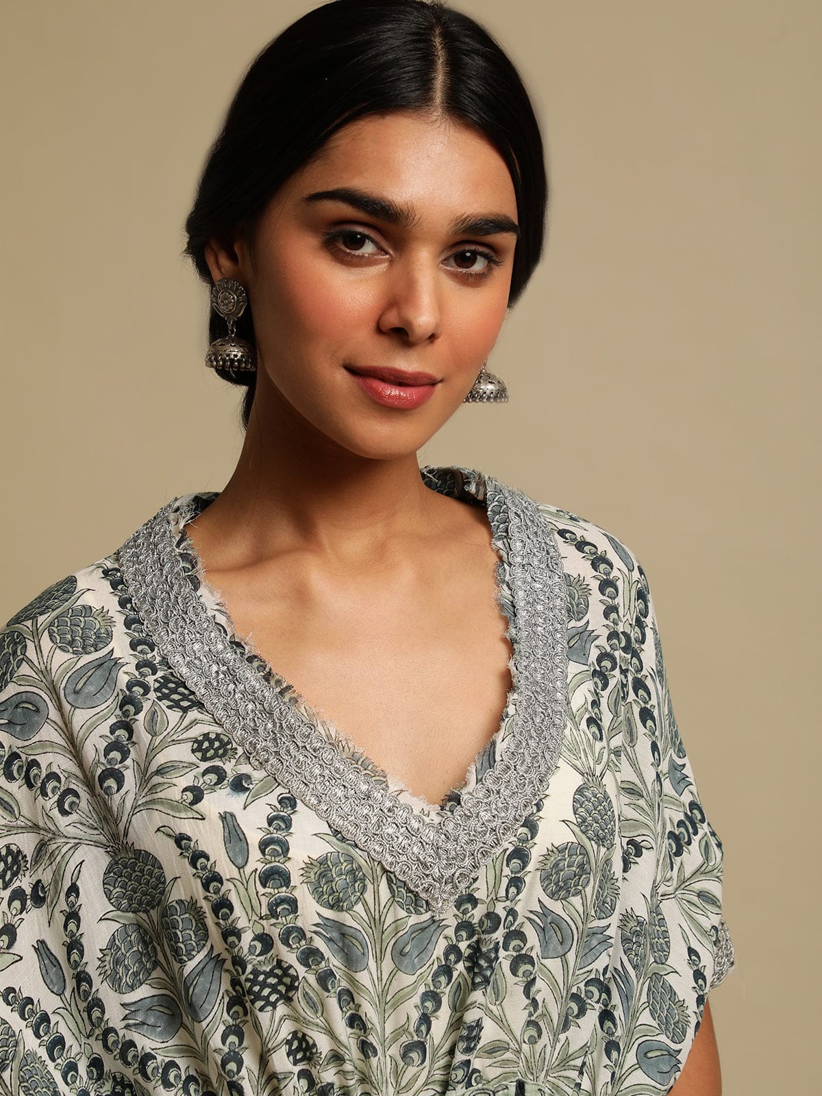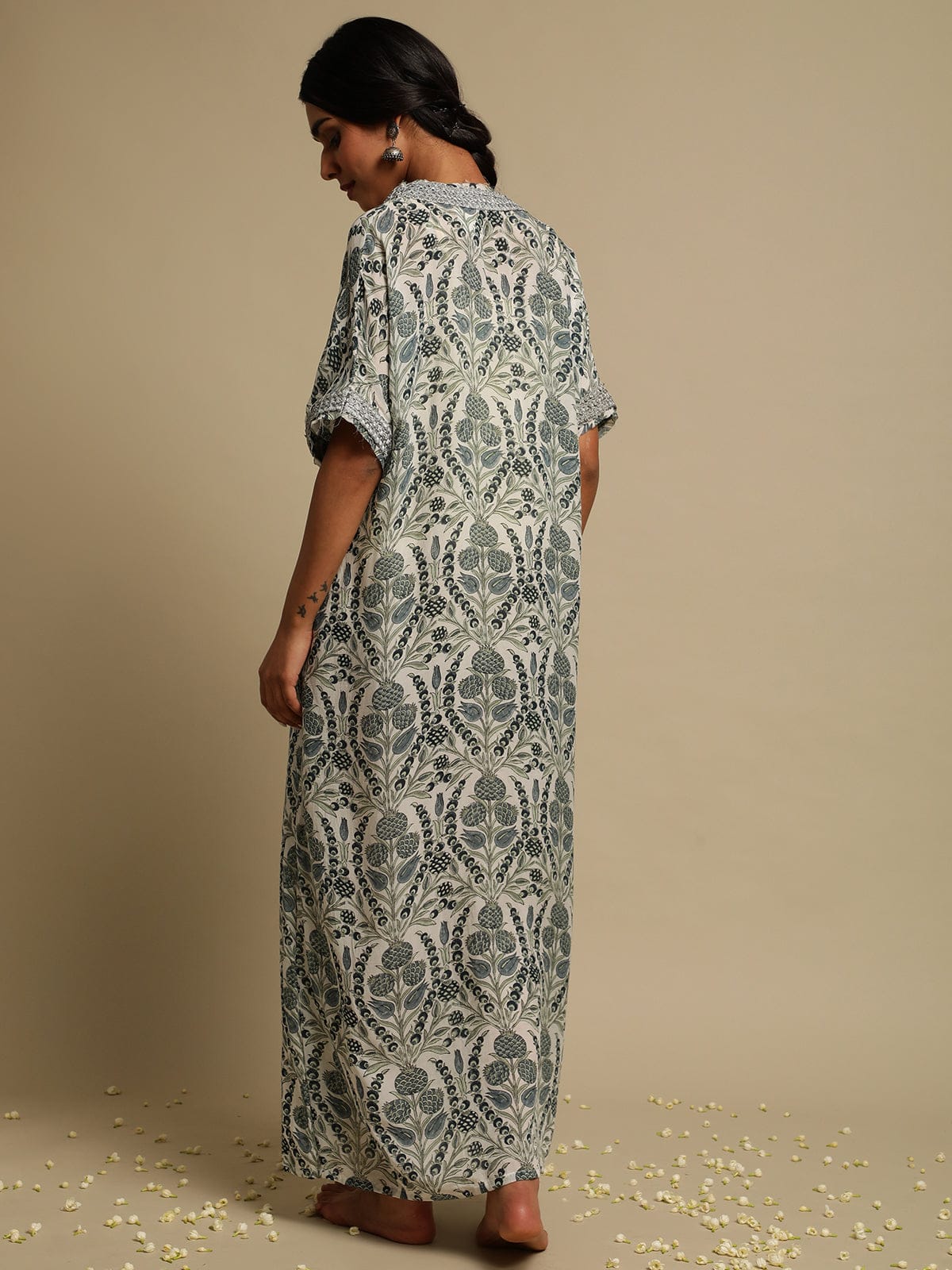 Grey Anaar Jaal Cotton Silk Hand Block Printed Kaftan