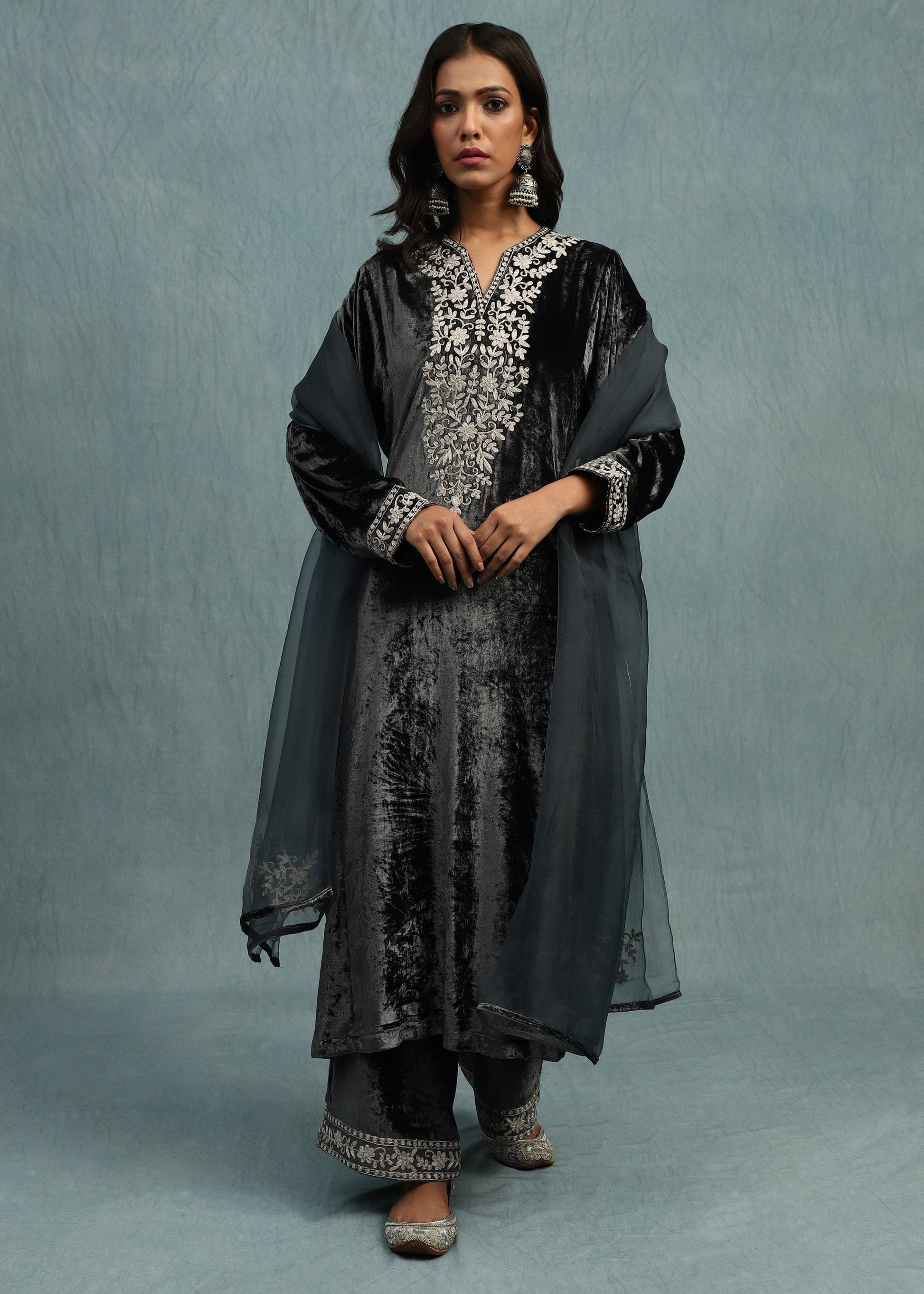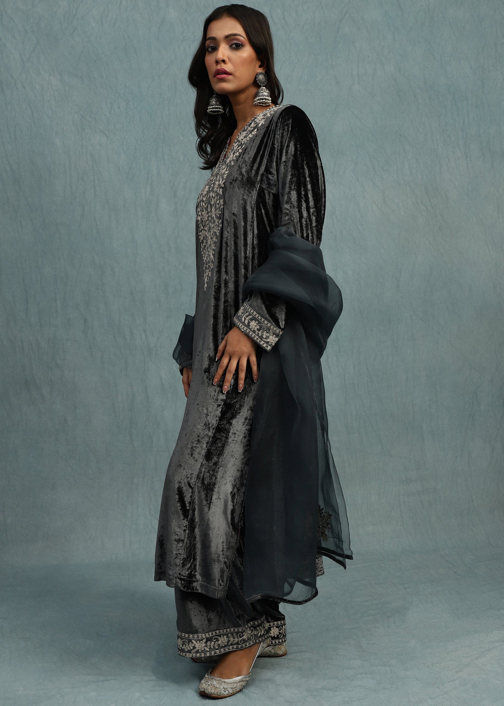GREY EMBROIDERED SILK VELVET KURTA SET- (3 PCS SET)