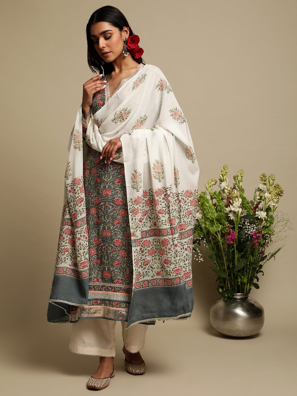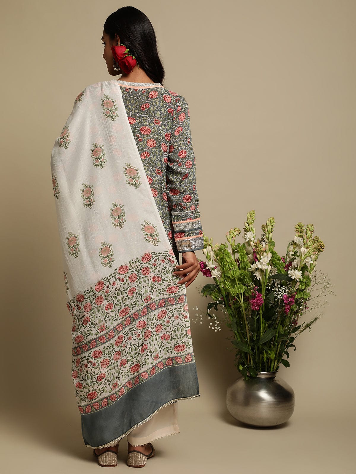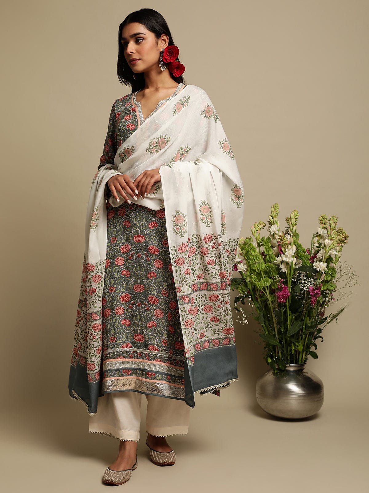 Grey Rose Jaal Cotton Silk Hand Block Printed Kurta- (3 Pcs Set)