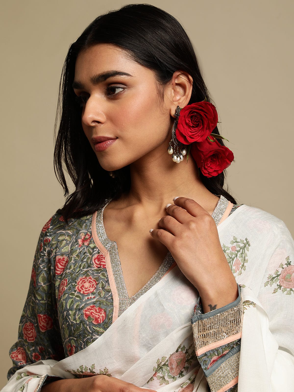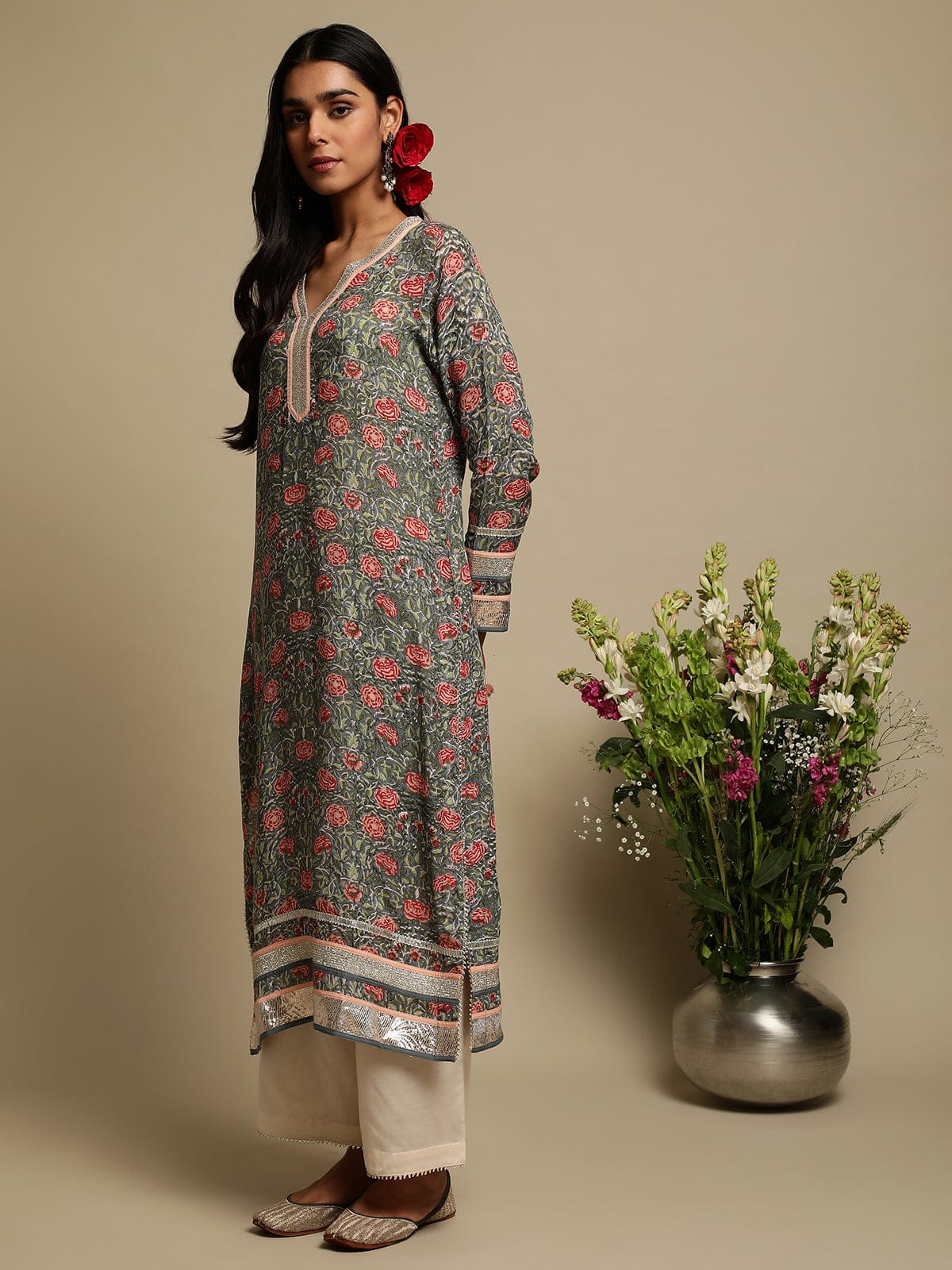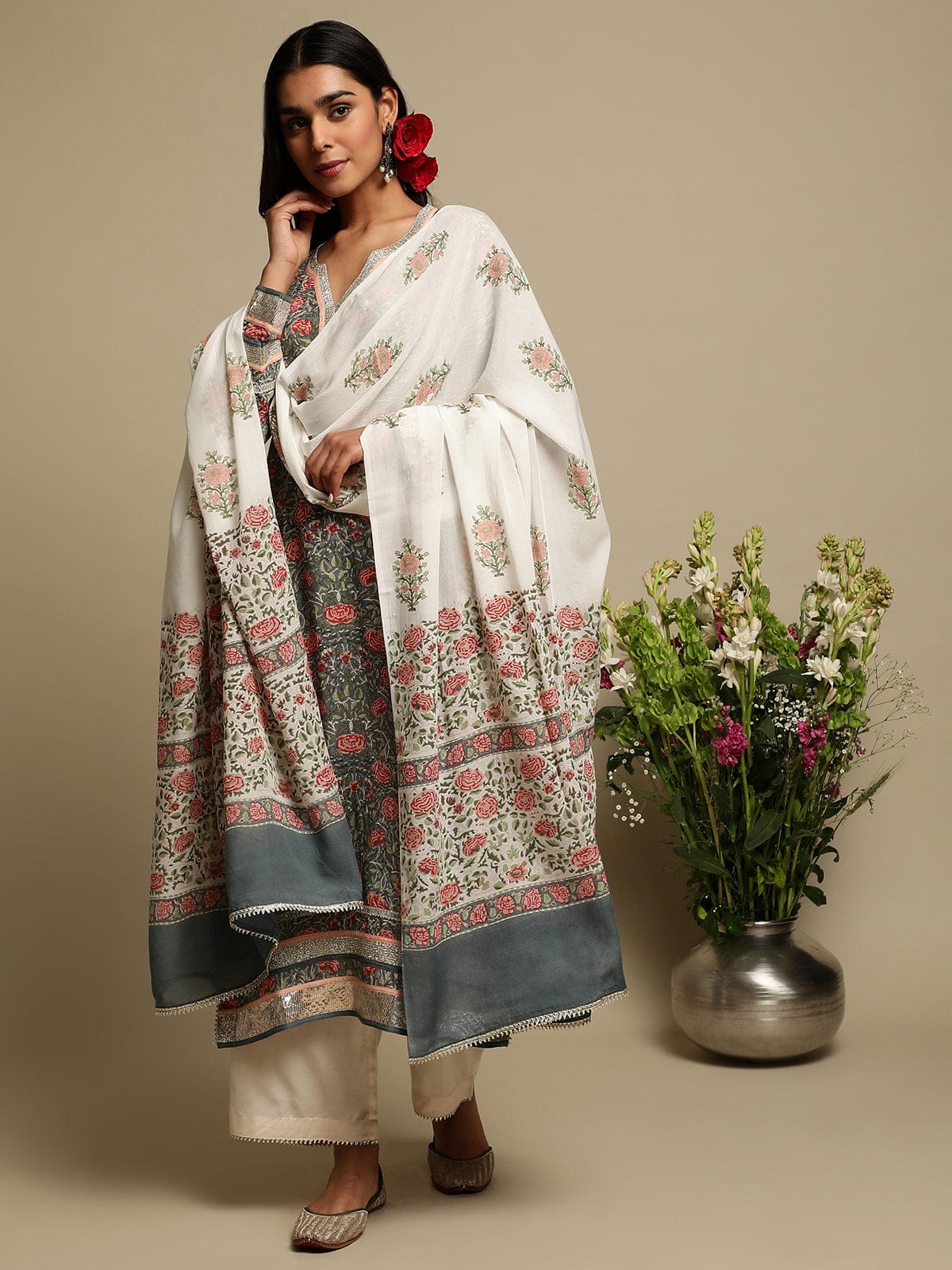 Grey Rose Jaal Cotton Silk Hand Block Printed Kurta- (3 Pcs Set)