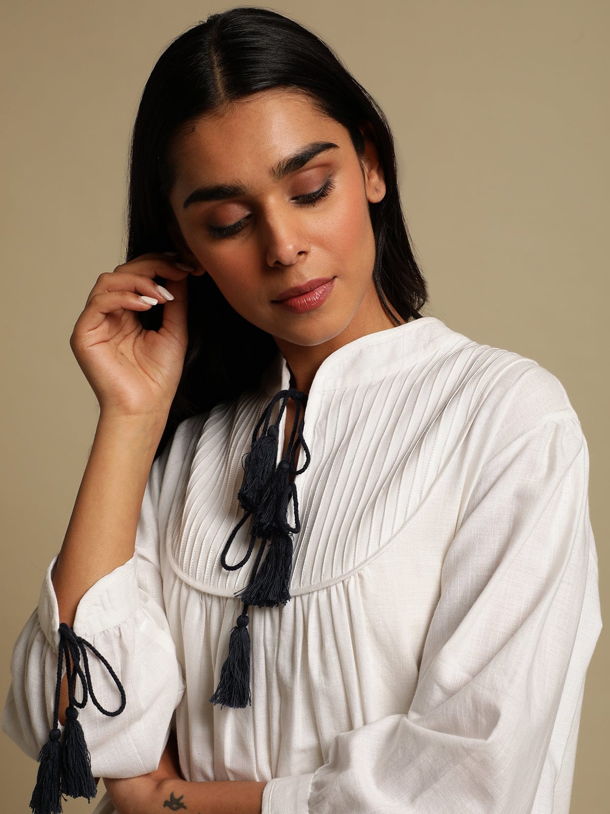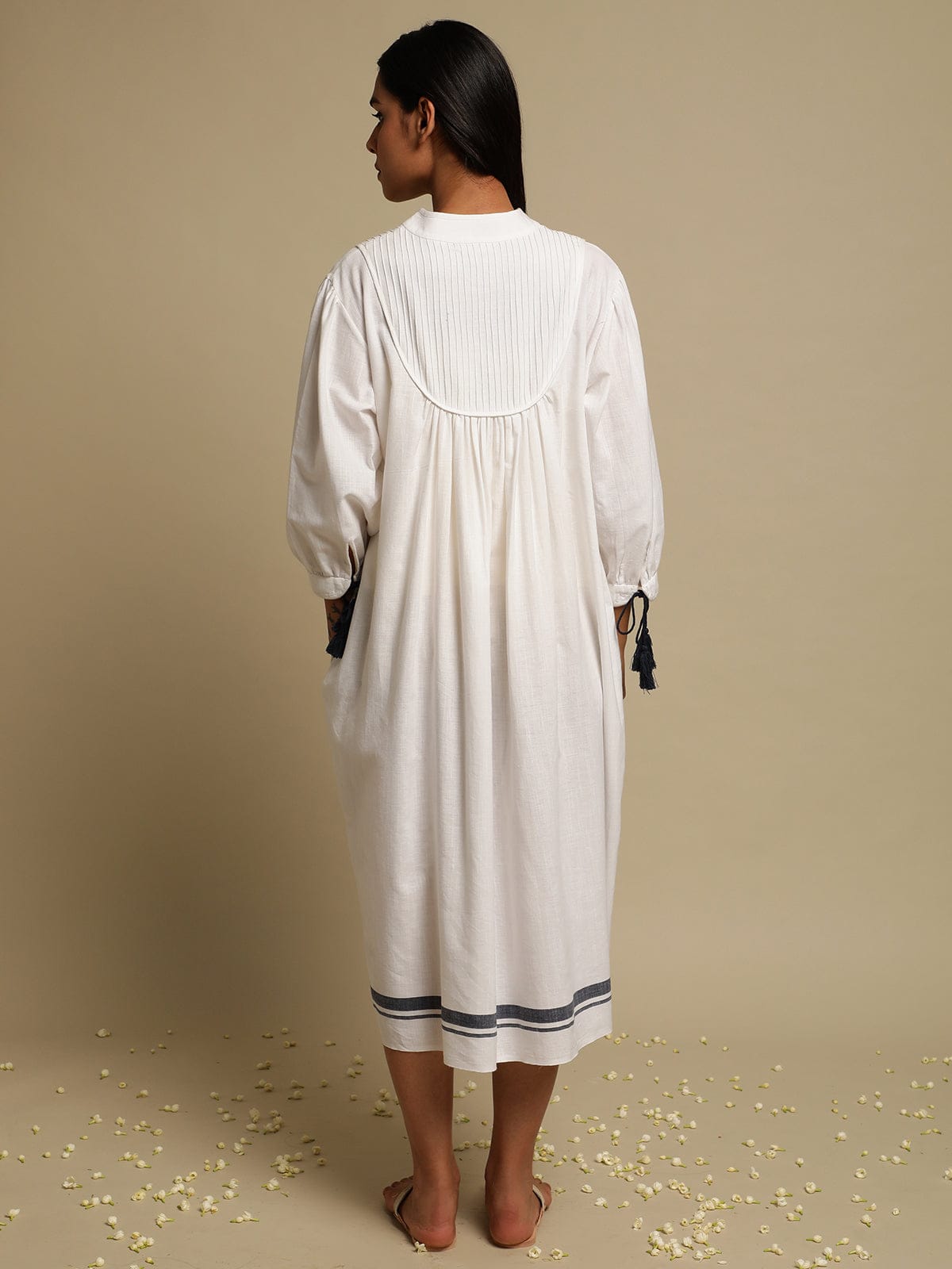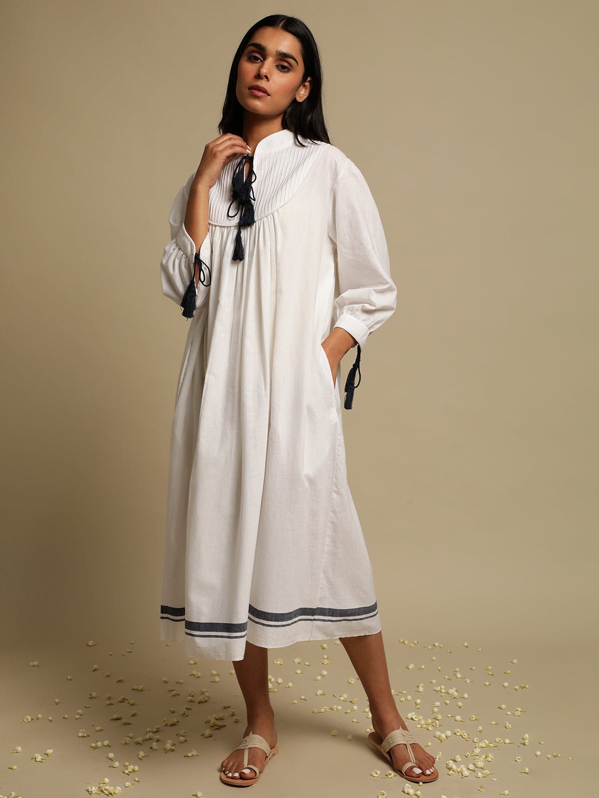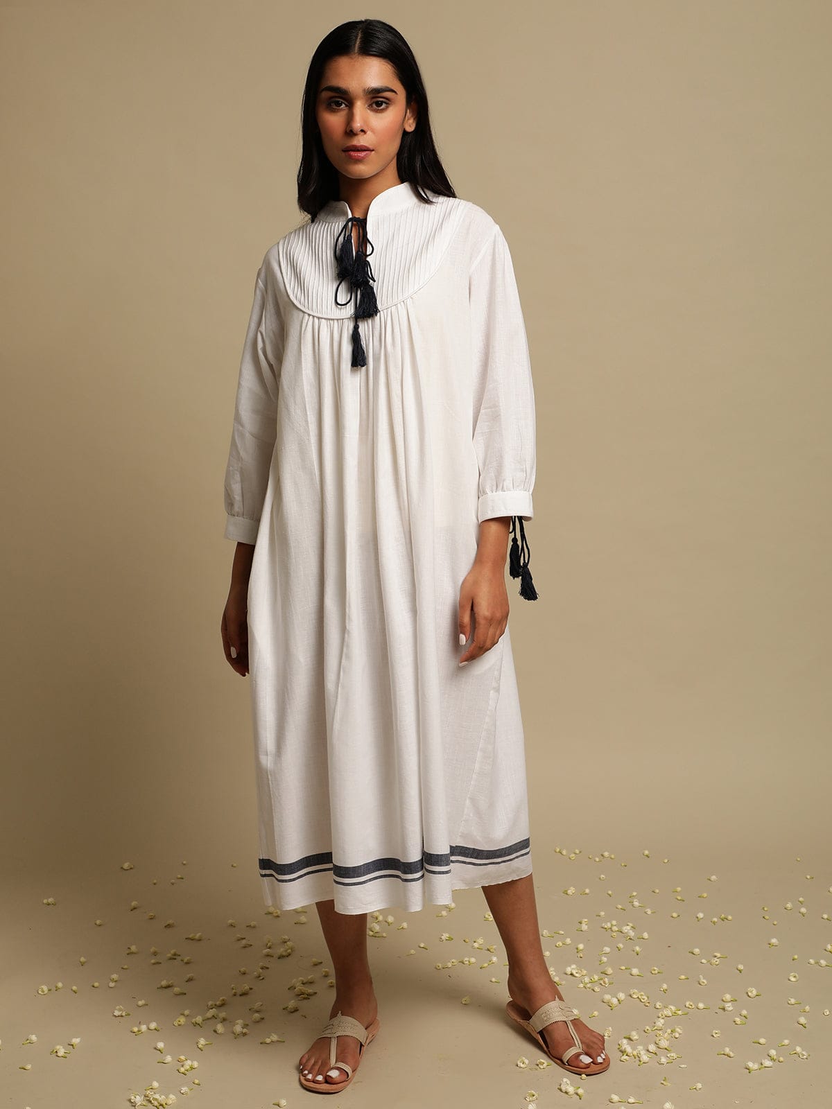 Yumi's Artisanal Clothing is hand woven in fine cotton by our artisans. The white Tunic Dress with a delicate pintuck yoke has a selvedge at the bottom and is detailed with indigo tassels.