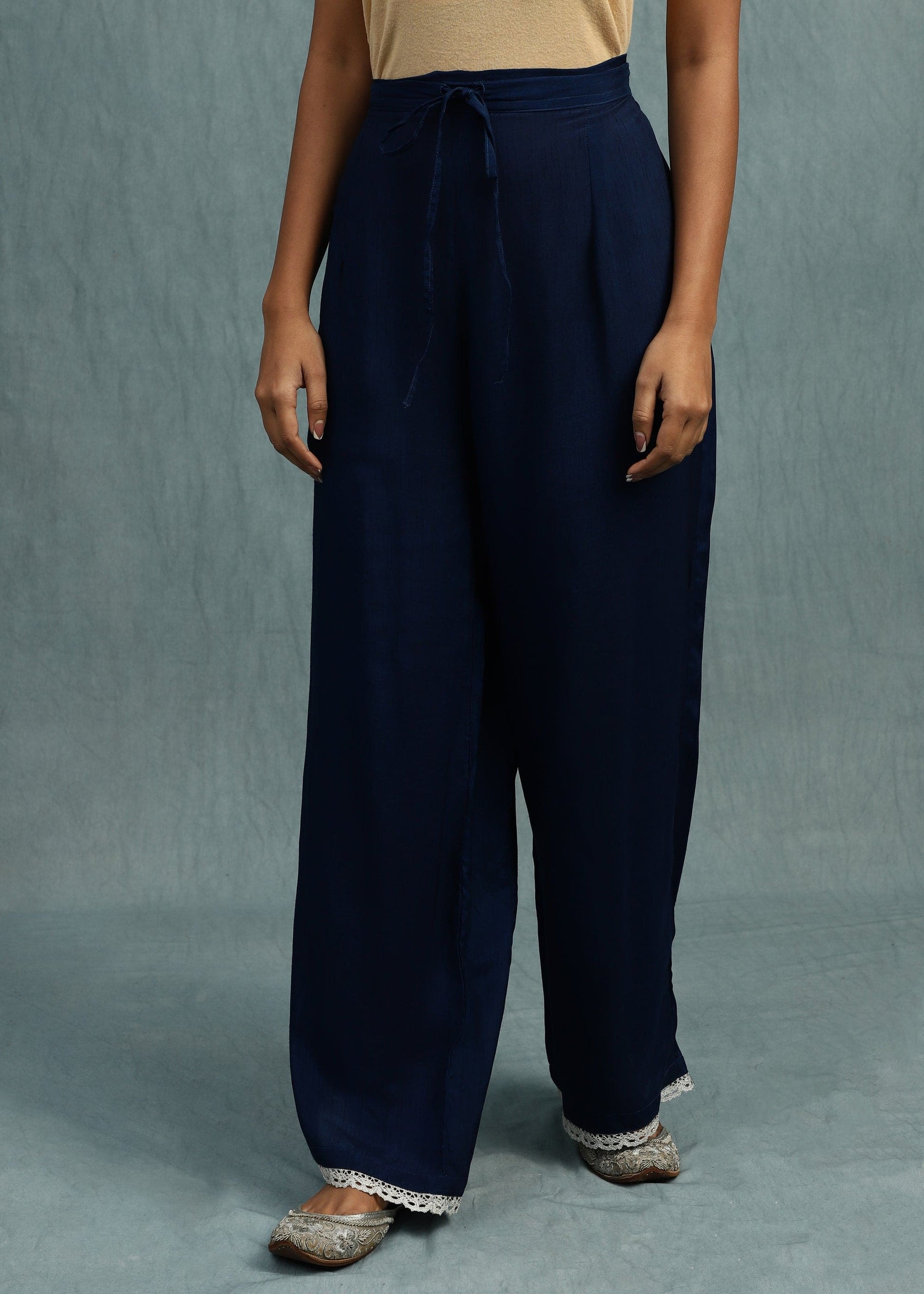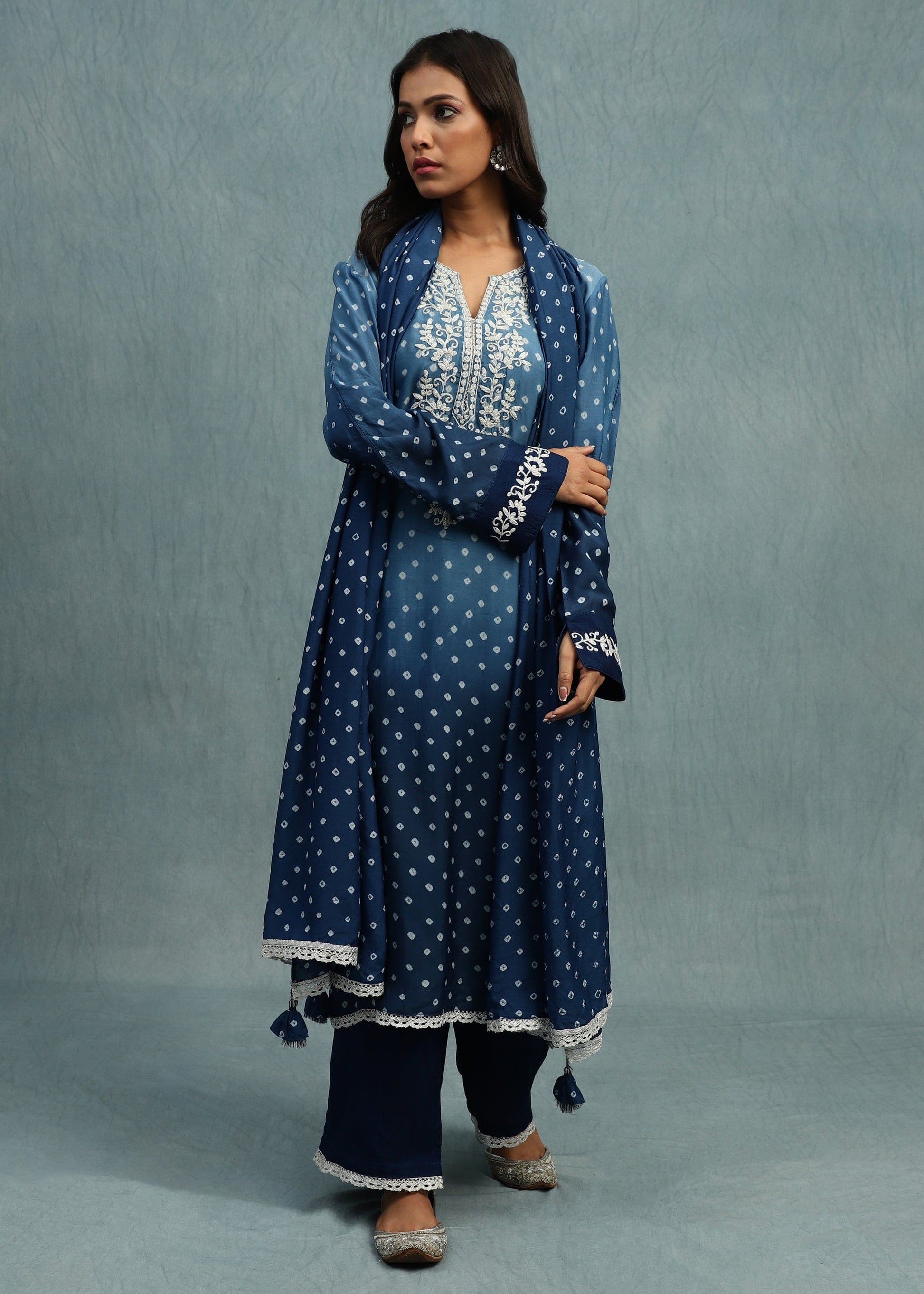 Yumi's Artisanal Clothing is hand knot dyed on fine cotton silk by our women artisans. The set of an embroidered Kurta and a Dupatta is hand dyed in the Yumi shaded ombre indigo blue. There is delicate lace and details by the village women on the ensemble. Stunning hand crafted tassels adorn the dupatta. It has a plain bottom finished with the lace.