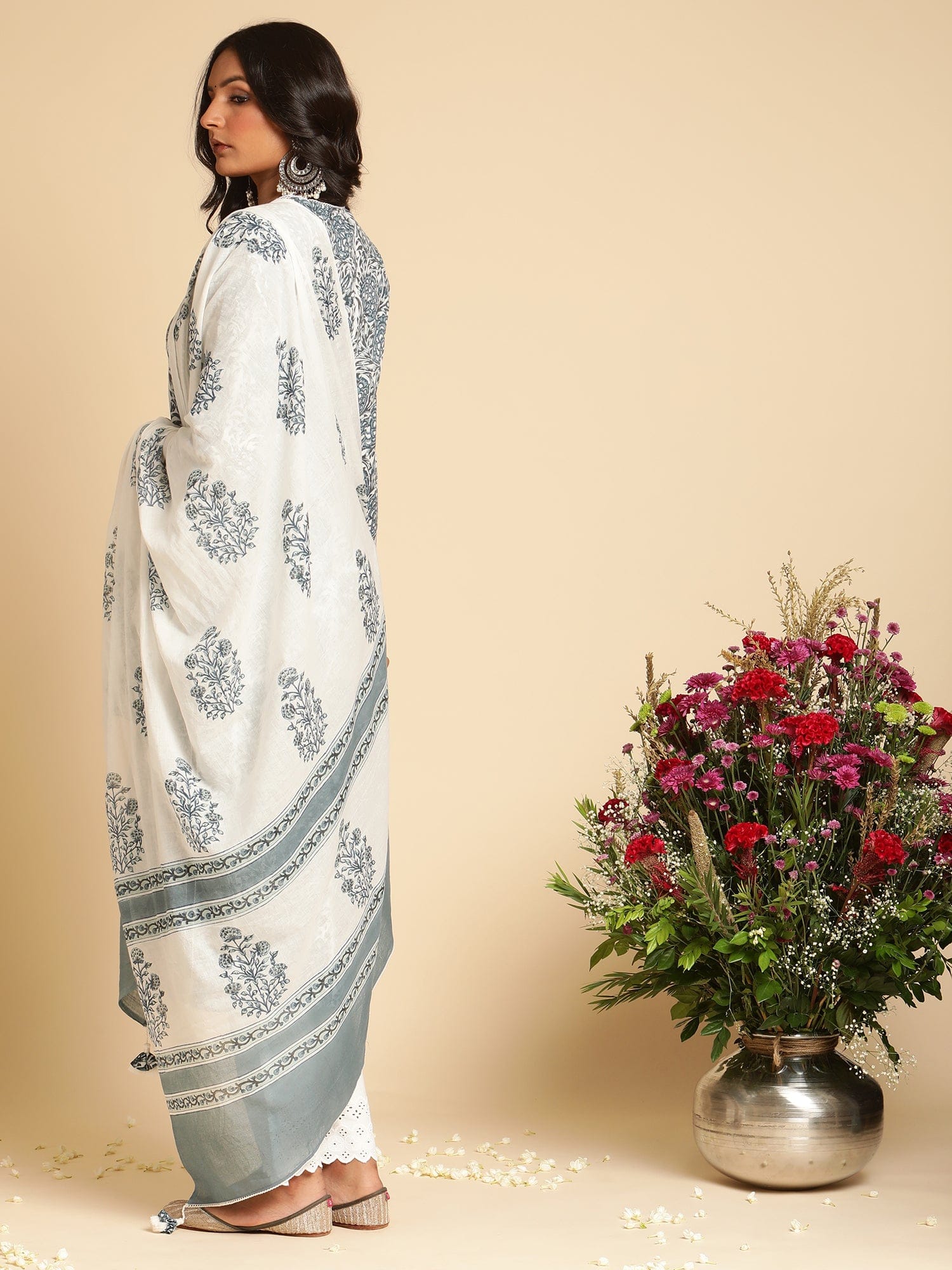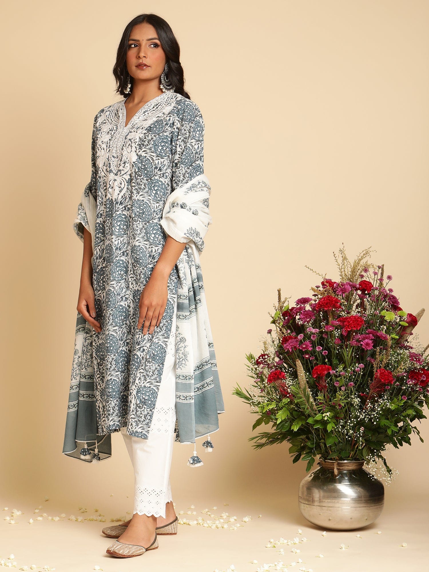 Yumi's Artisanal Clothing is hand block printed on fine organic cotton by our artisans. The set of a beautifully designed Kurta and a Dupatta is hand printed in an all over indigo blue marigold floral pattern on white. There is exquisite white embroidery and delicate lace work by village women on the ensemble.