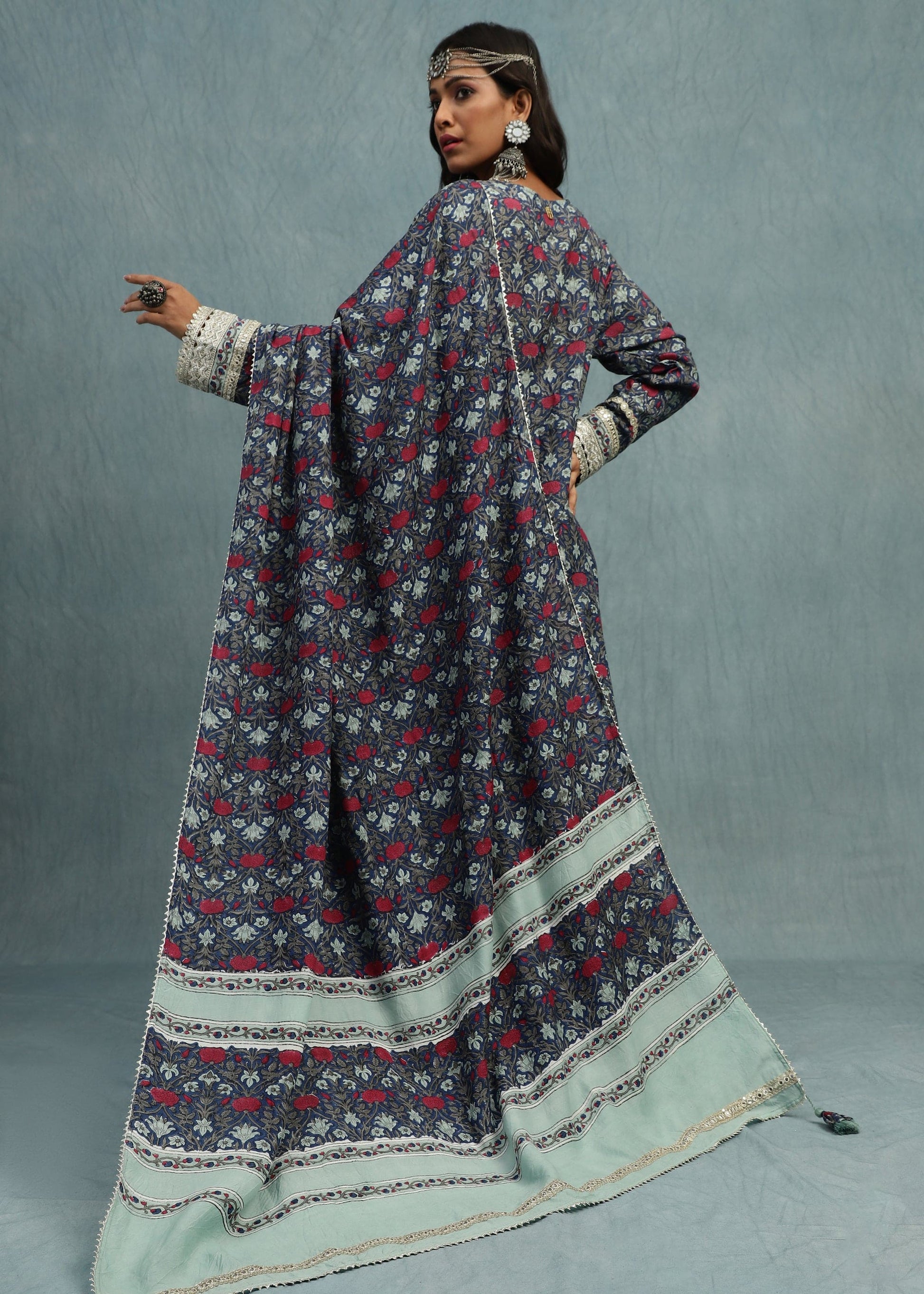 Indigo Marigold Jaal Cotton Silk Hand Block Printed Sharara- (3 Pcs Set)