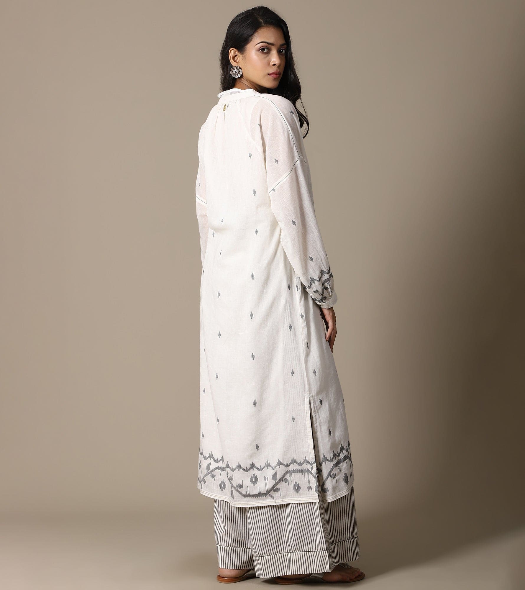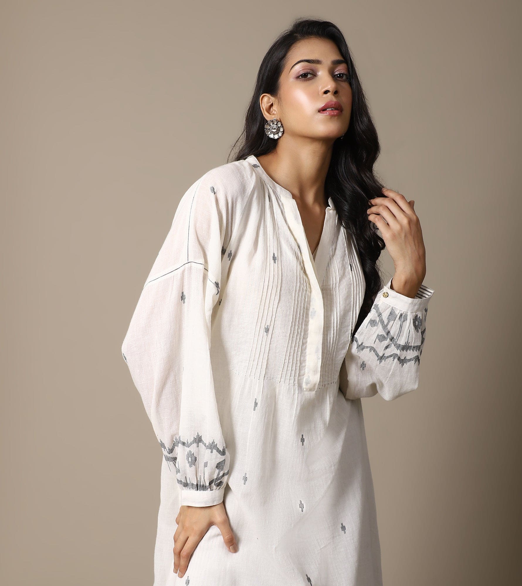 Yumi's Conscious Clothing is hand woven Jamdani in fine organic cotton with a stunning border by our artisans. The Ecru Jamdani Tunic has pintuck & stitching details and is paired with a grey woven stripes cotton bottom.