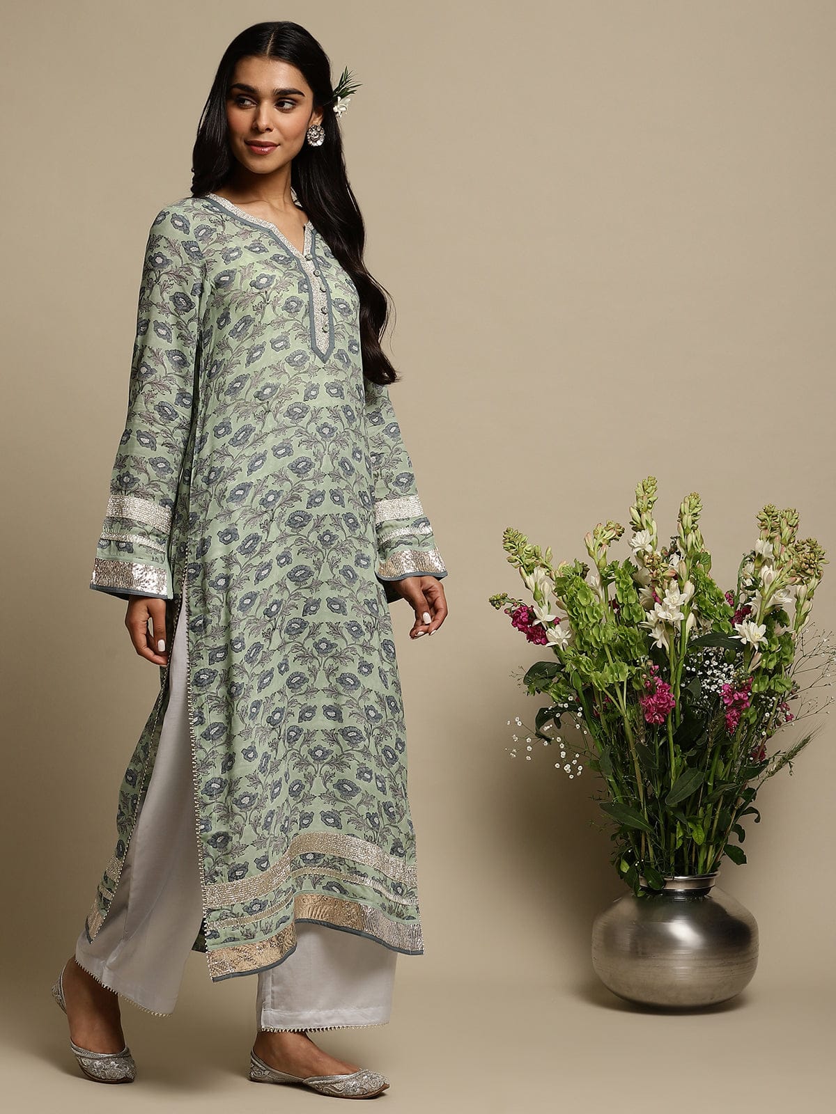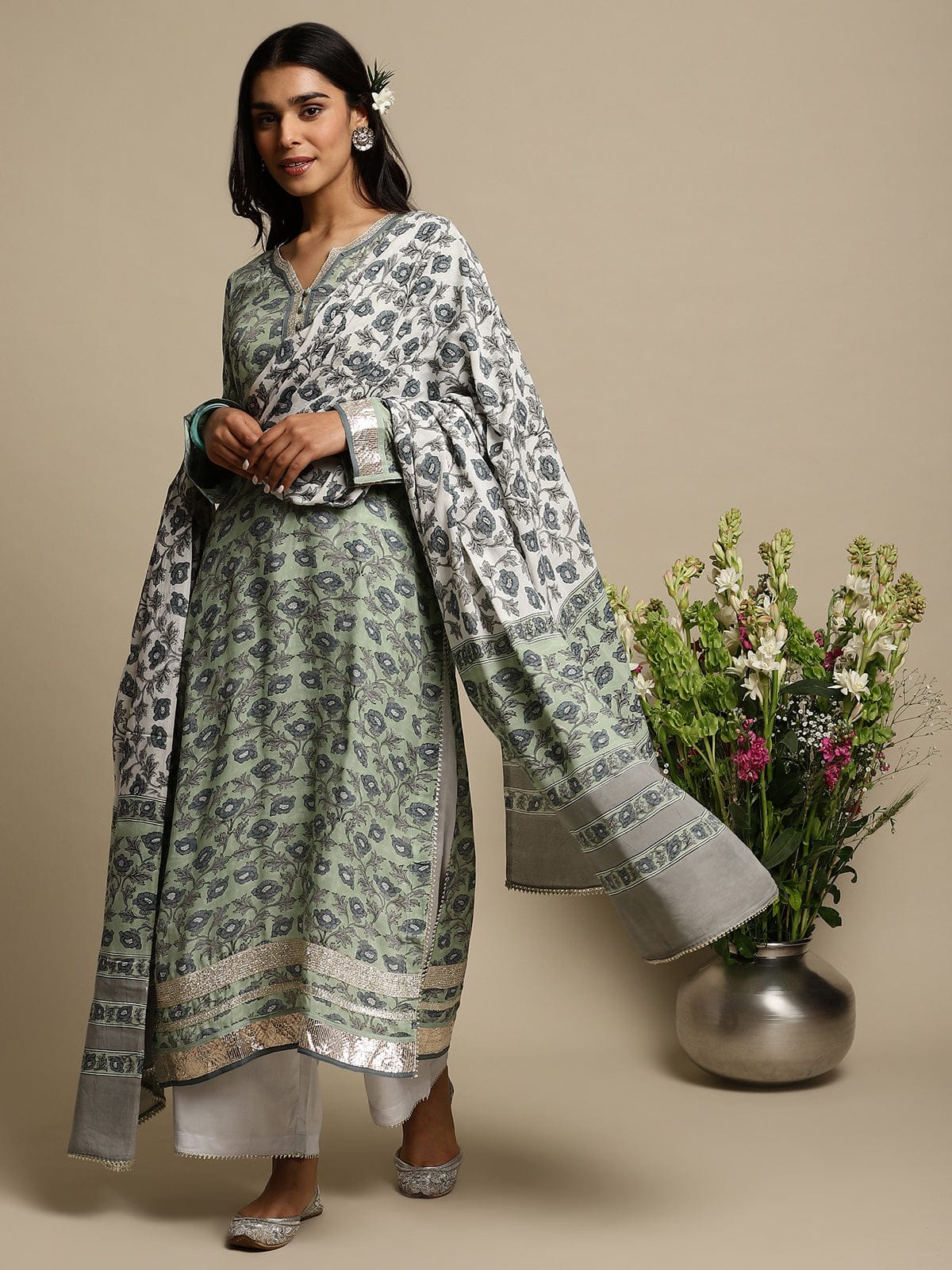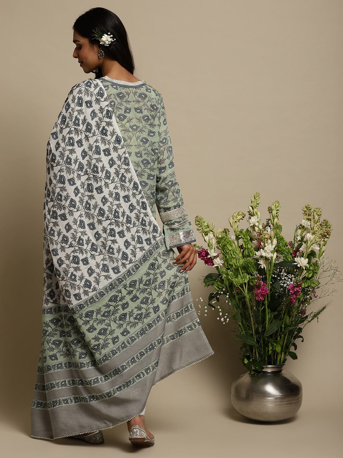 Light Green Peony Cotton Silk Hand Block Printed Kurta- (3 Pcs Set)