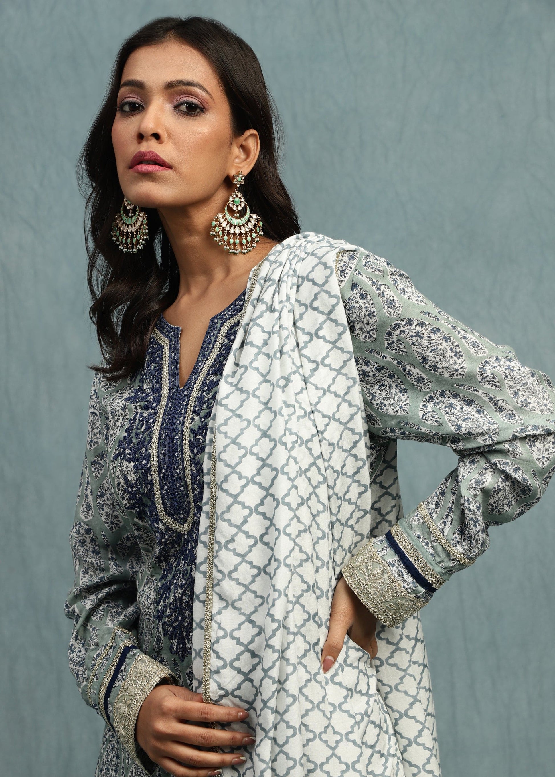 LIGHT INDIGO PAISLEY JAAL COTTON SILK HAND BLOCK PRINTED KURTA SET- (3 PCS SET)
