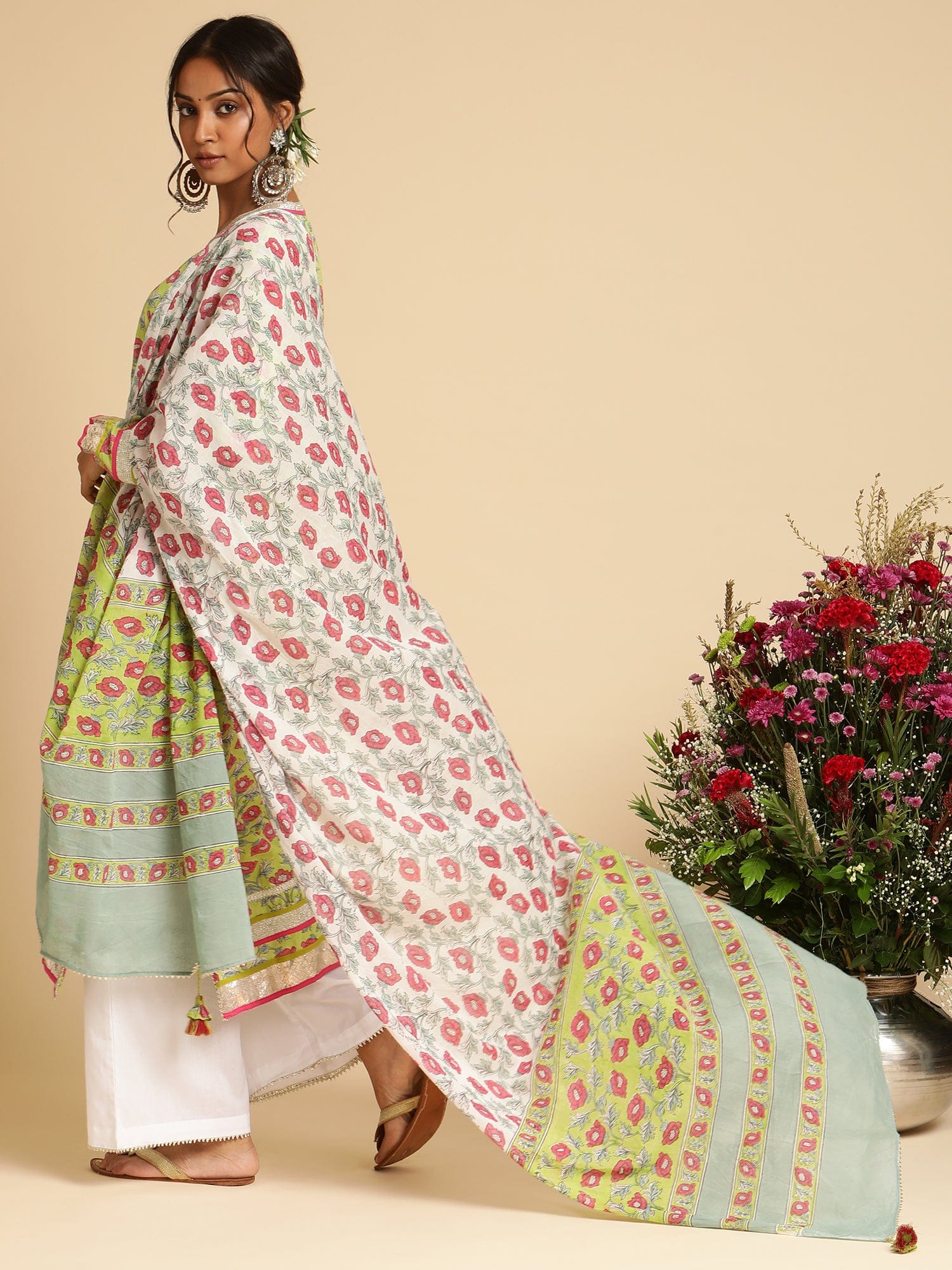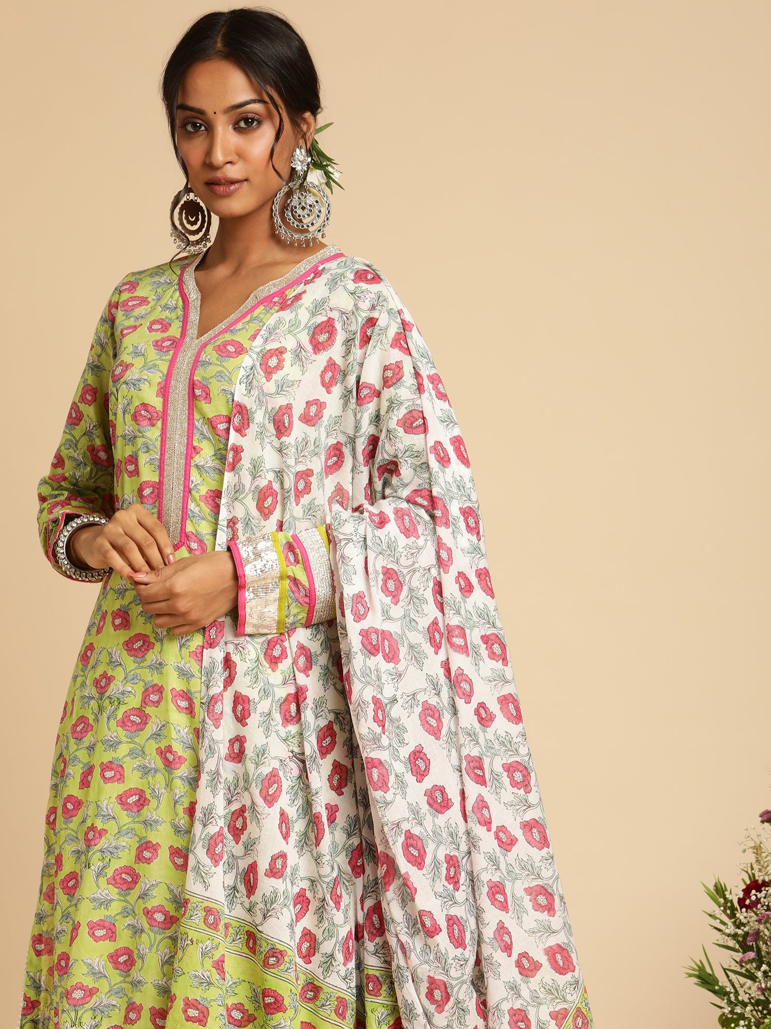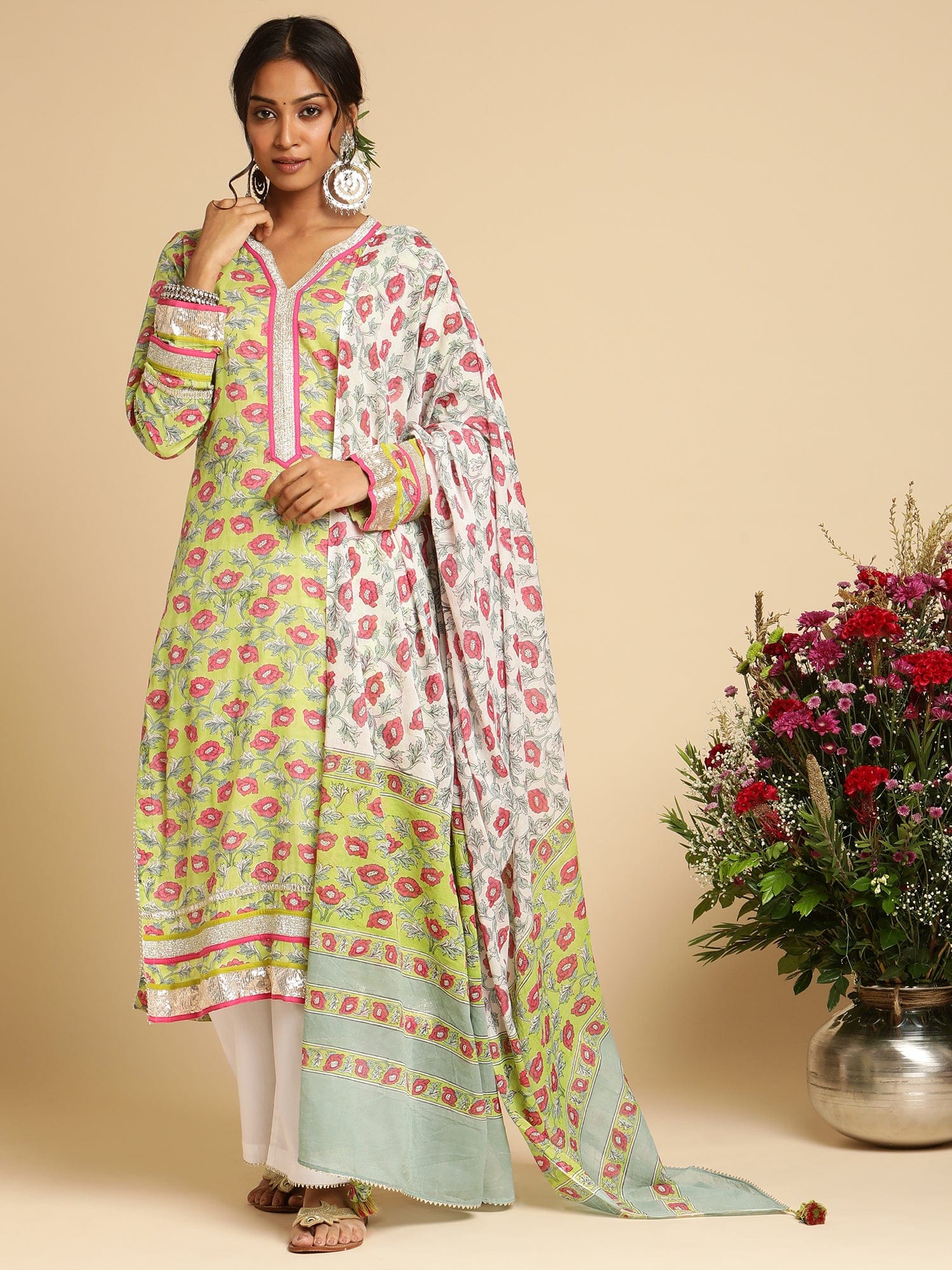 Yumi's Artisanal Clothing is hand block printed on fine organic cotton by our artisans. The set of an exquisite Kurta and a Dupatta is hand printed in an all over pink peony floral pattern on a scintillating lime green . There is exquisite gota work by village women on the ensemble.
