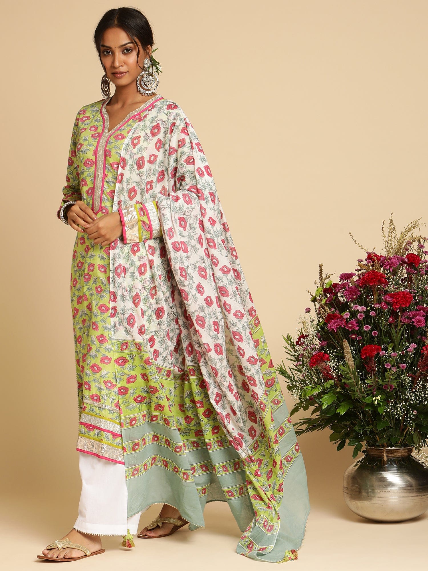 Lime Peony Organic Cotton Hand Block Printed Kurta - (3 Pcs Set)