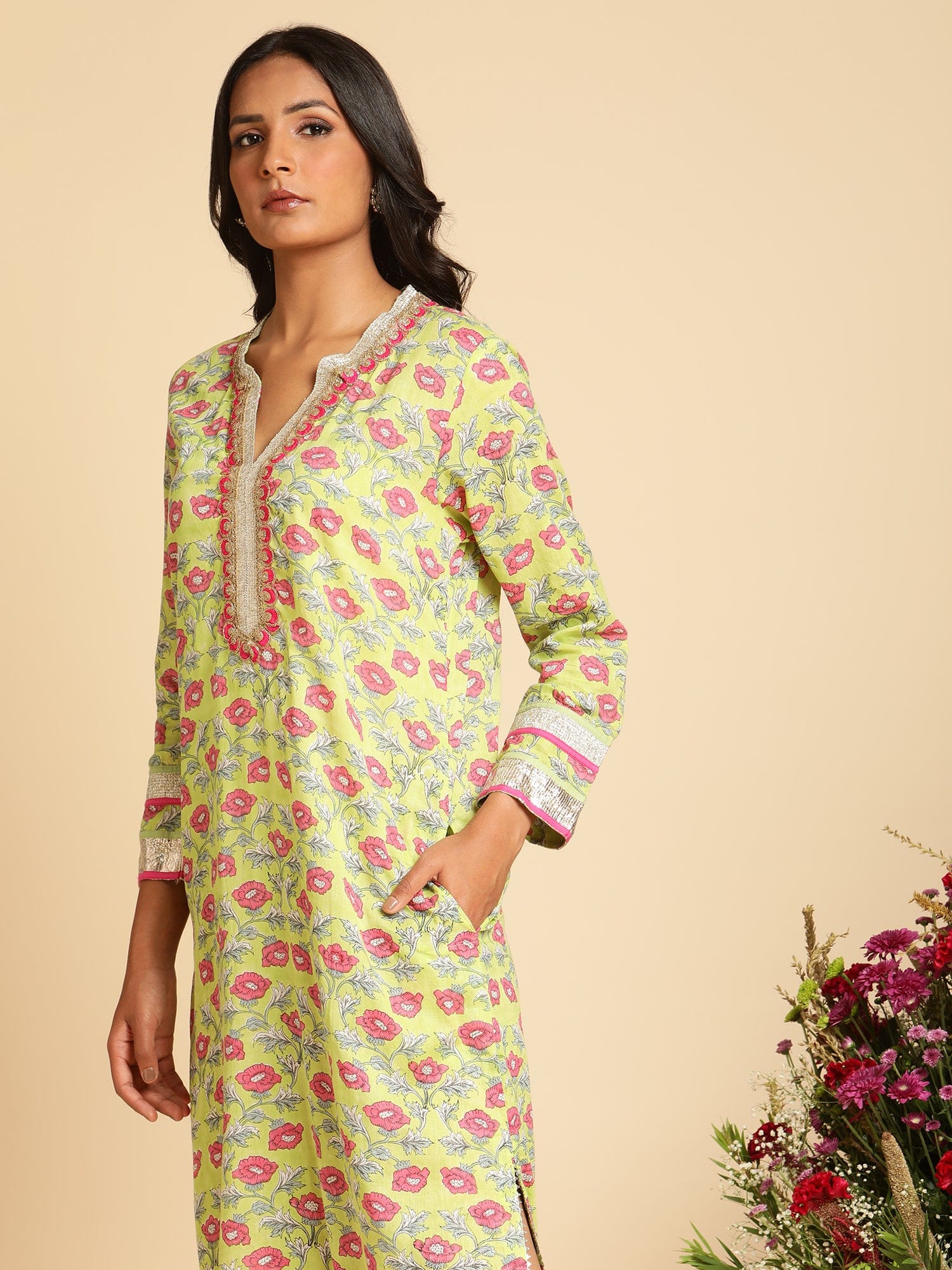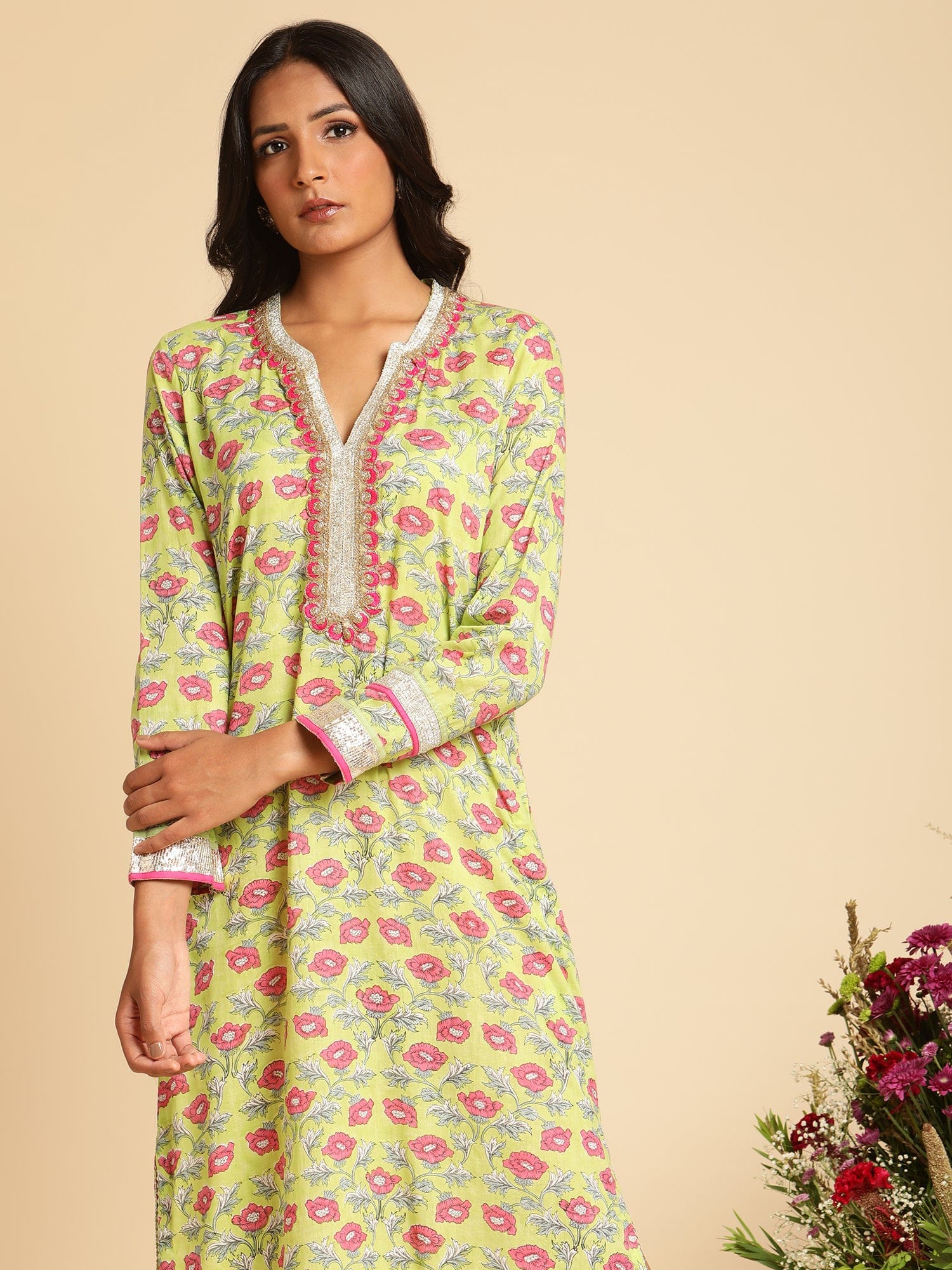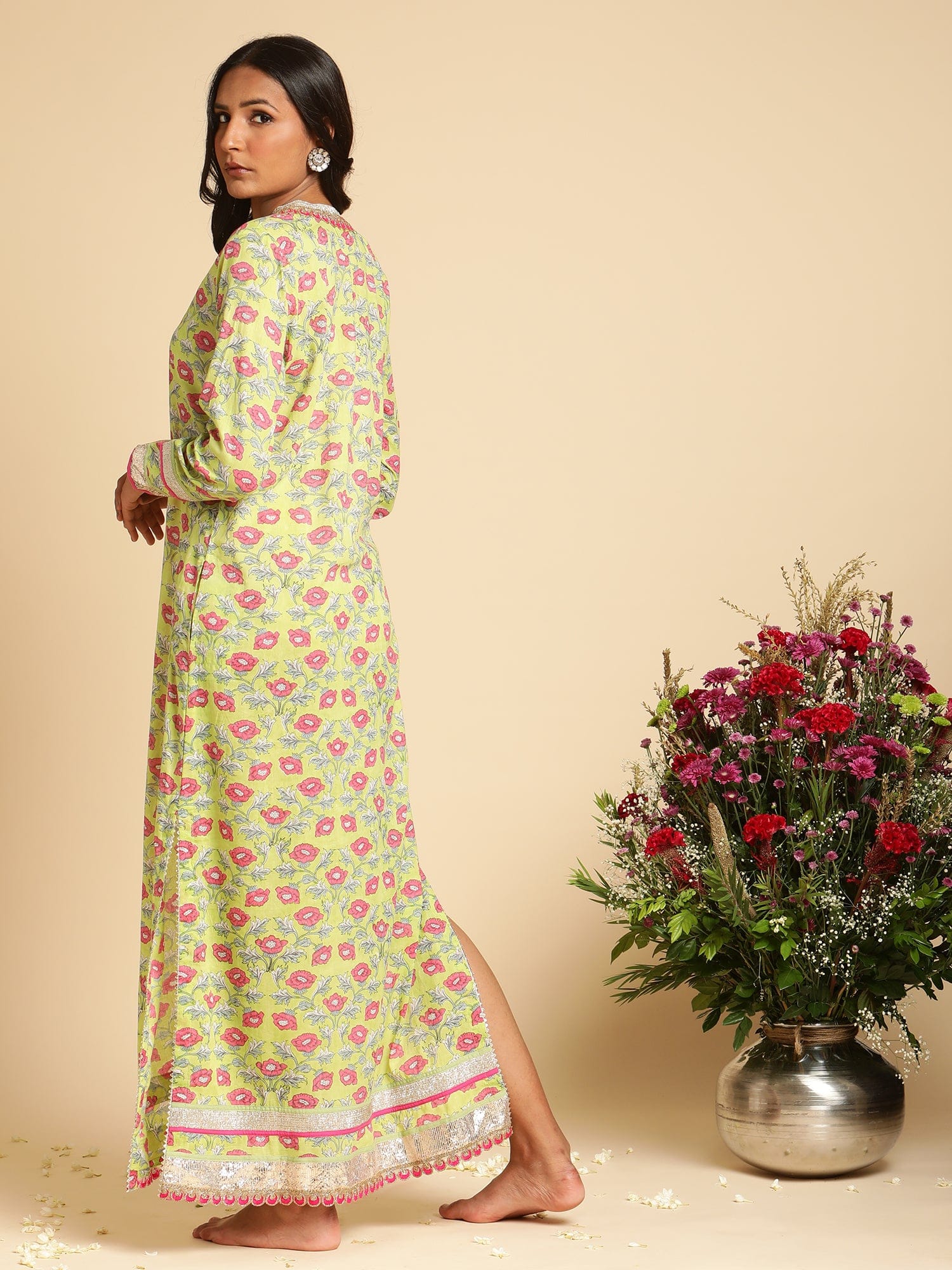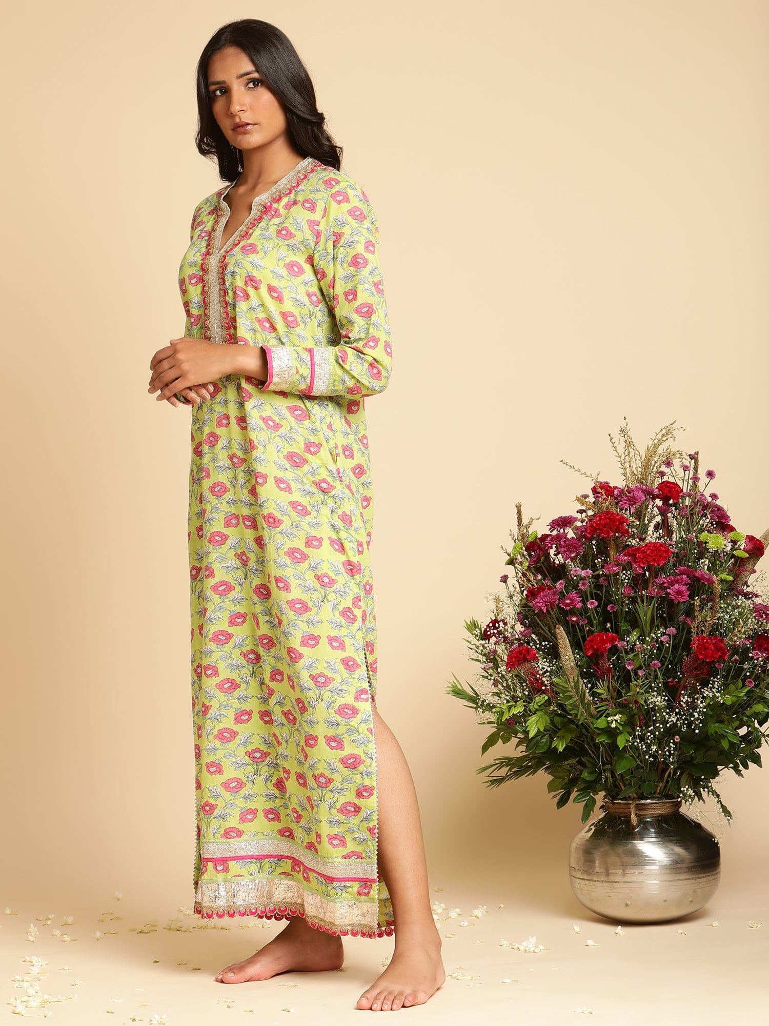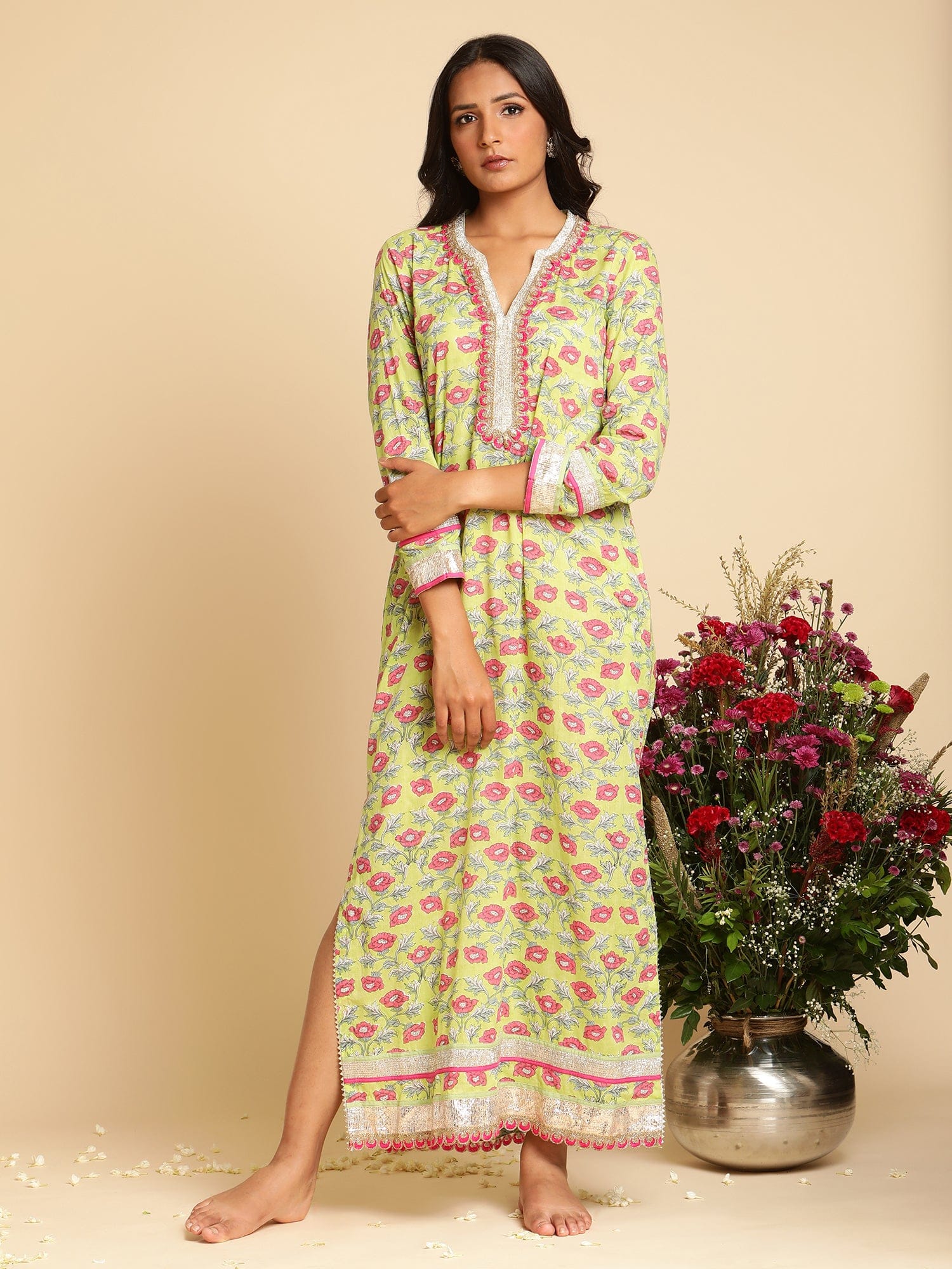 Yumi's Artisanal Clothing is hand woven in fine cotton by our artisans. The fuchsia peony hand printed on the vibrant lime kaftan has delicate gota and thread work handcrafted by village women on the neckline .