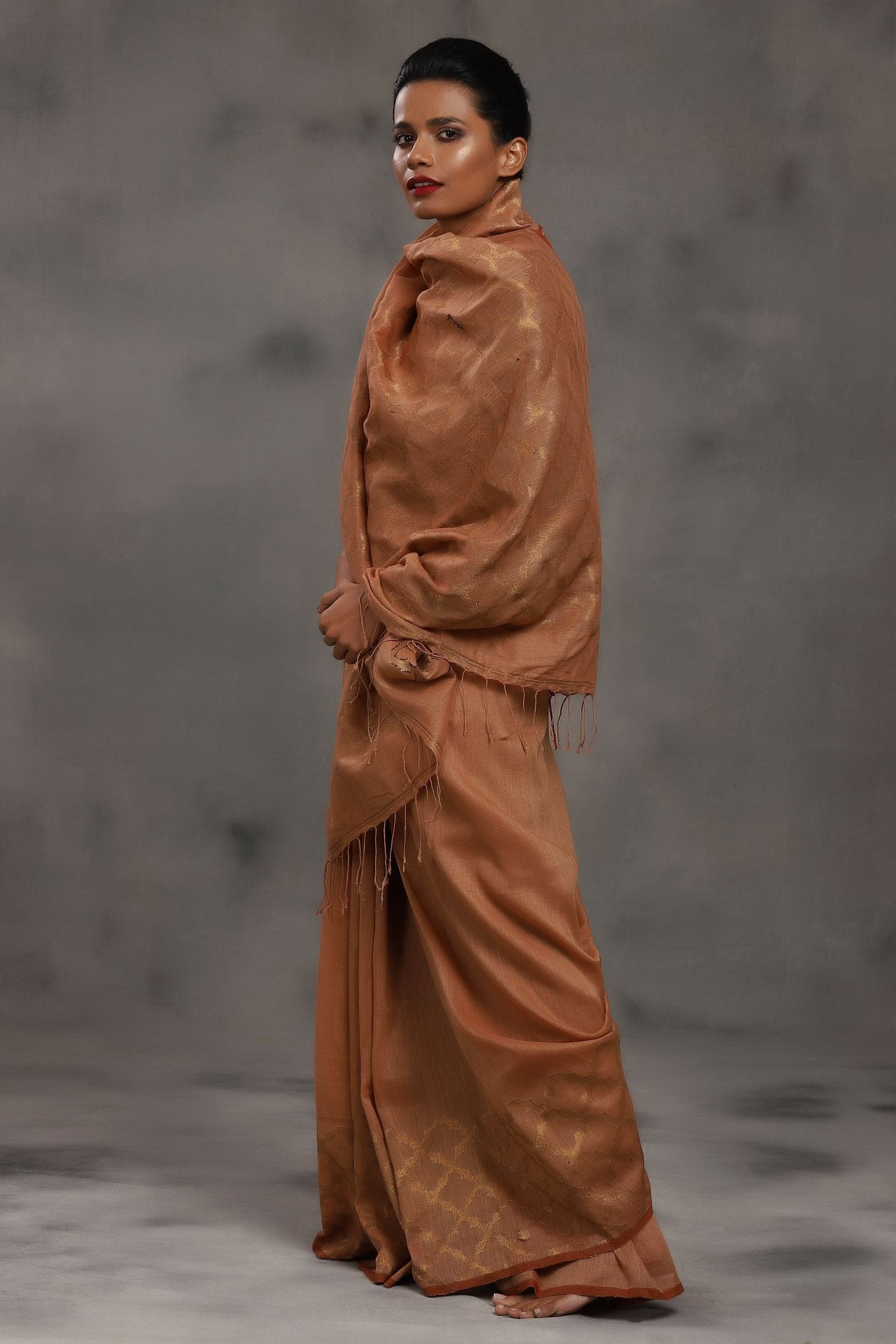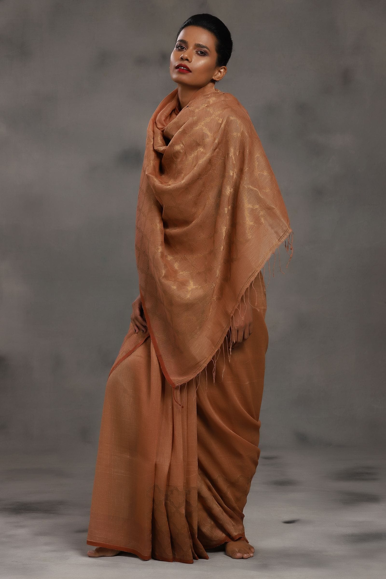 Linen sari with Kashmir jaal pattern woven on Border and Palla woven with zari. Yumi revived the traditional hand woven Jamdani weaving technique and translated it on fine linen saris dyed in natural colours with it's artisans.