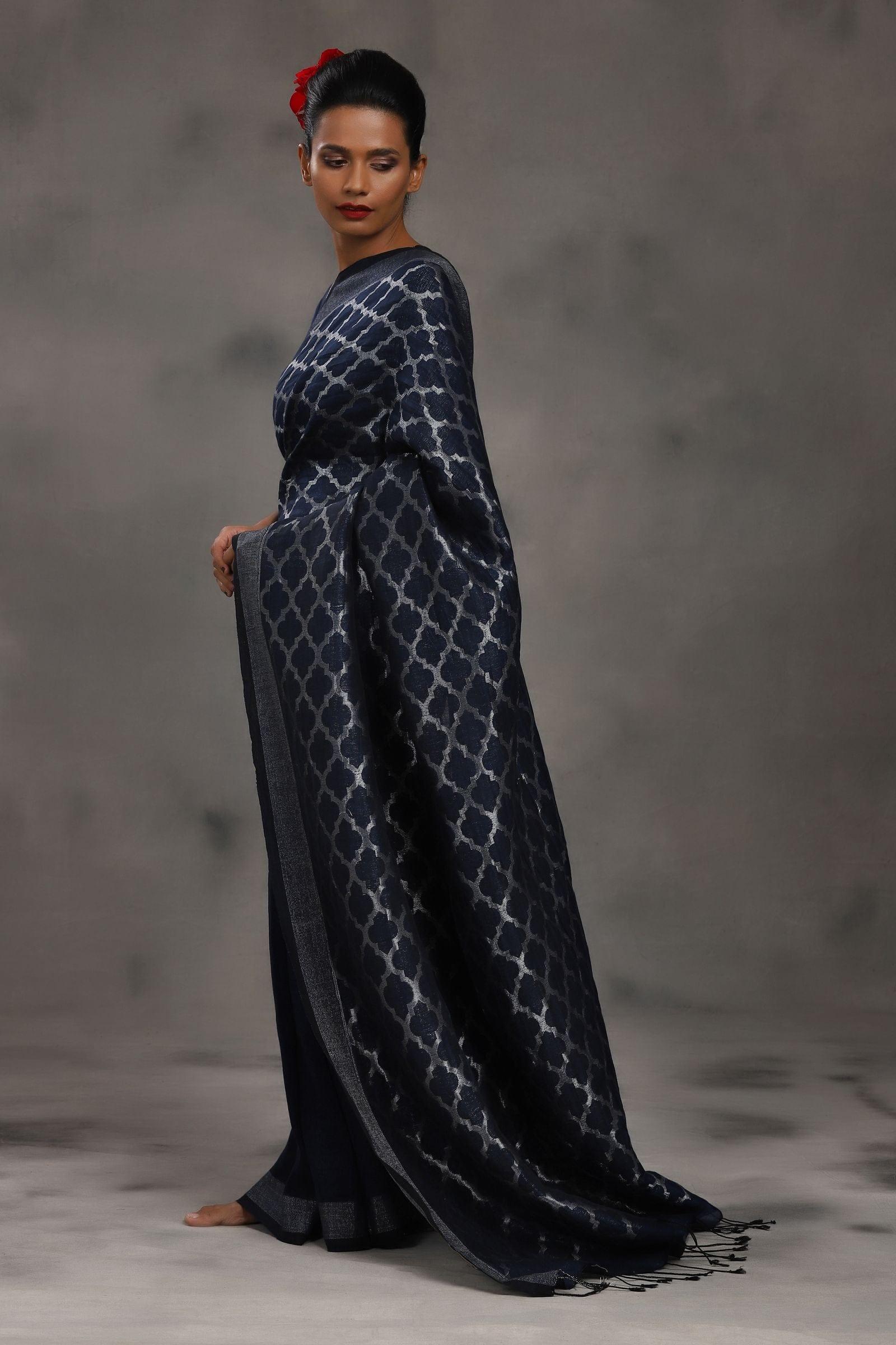 Linen sari with Kashmir jaal pattern woven on Border and Palla woven with zari. Yumi revived the traditional hand woven Jamdani weaving technique and translated it on fine linen saris dyed in natural colours with it's artisans.
