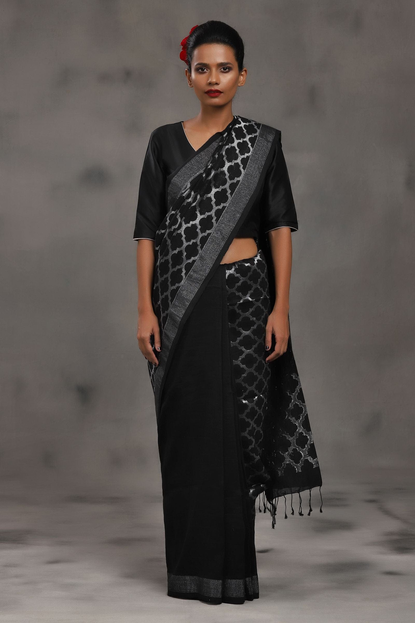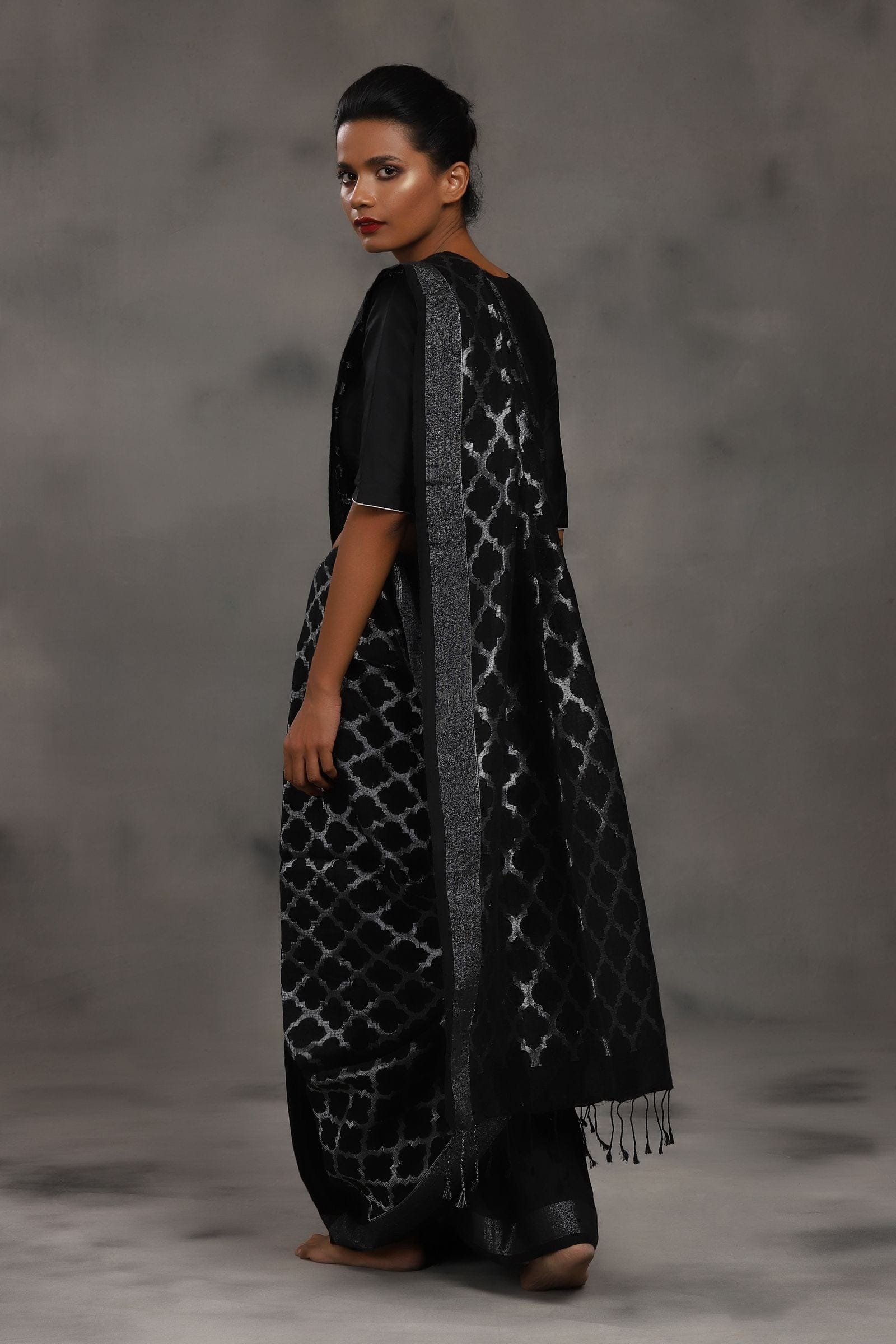 Linen sari with Kashmir jaal pattern woven on Border and Palla woven with zari. Yumi revived the traditional hand woven Jamdani weaving technique and translated it on fine linen saris dyed in natural colours with it's artisans.