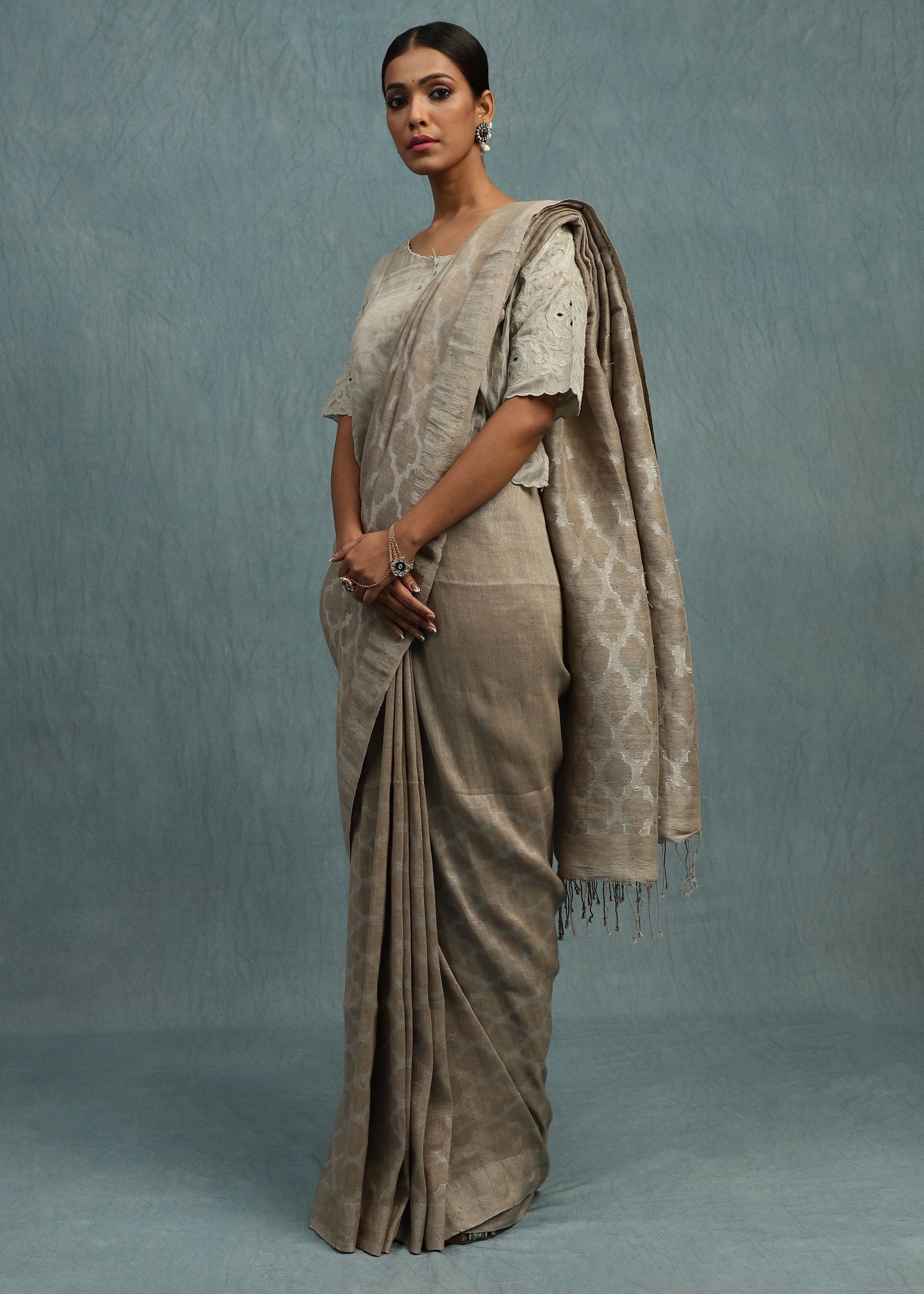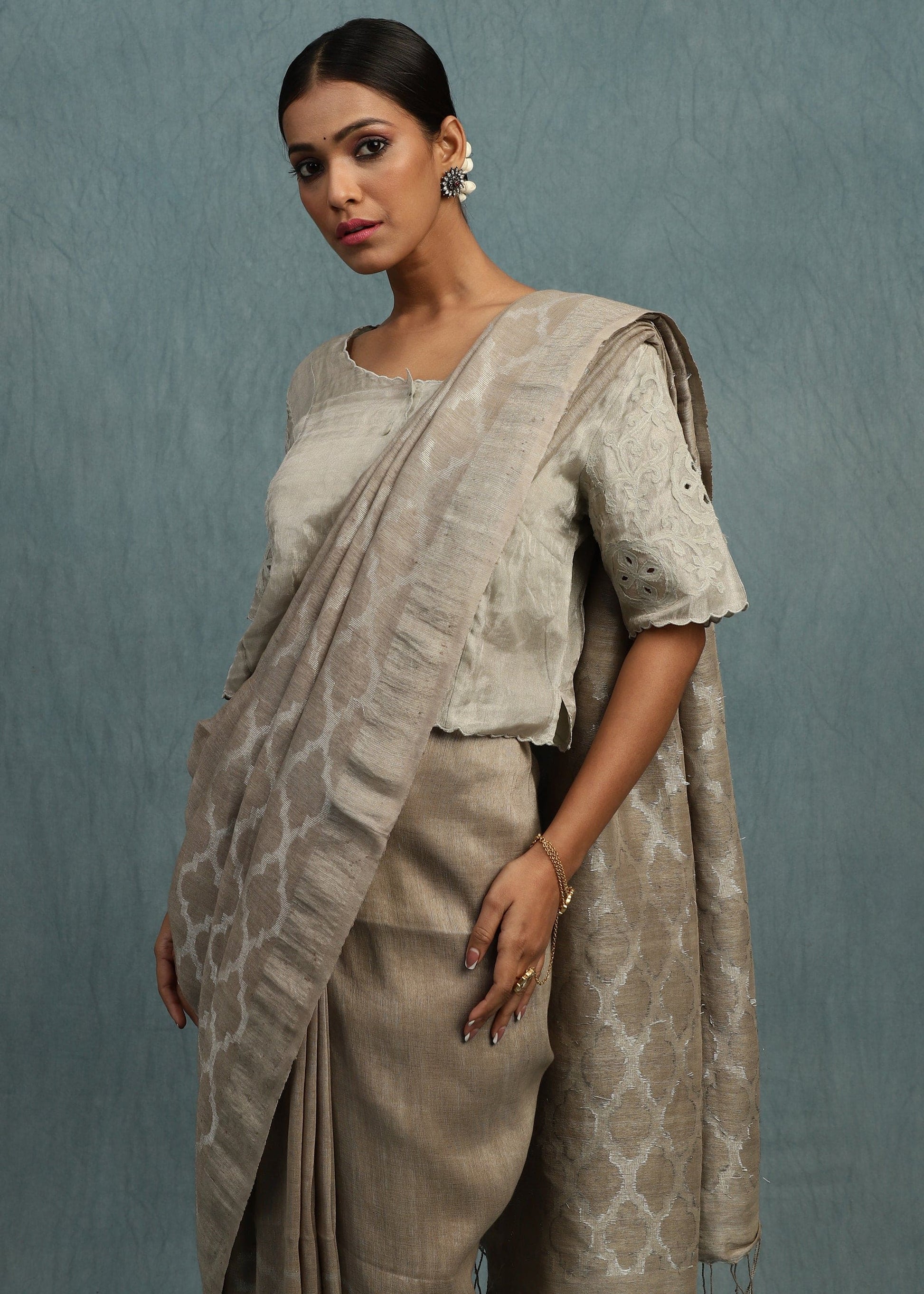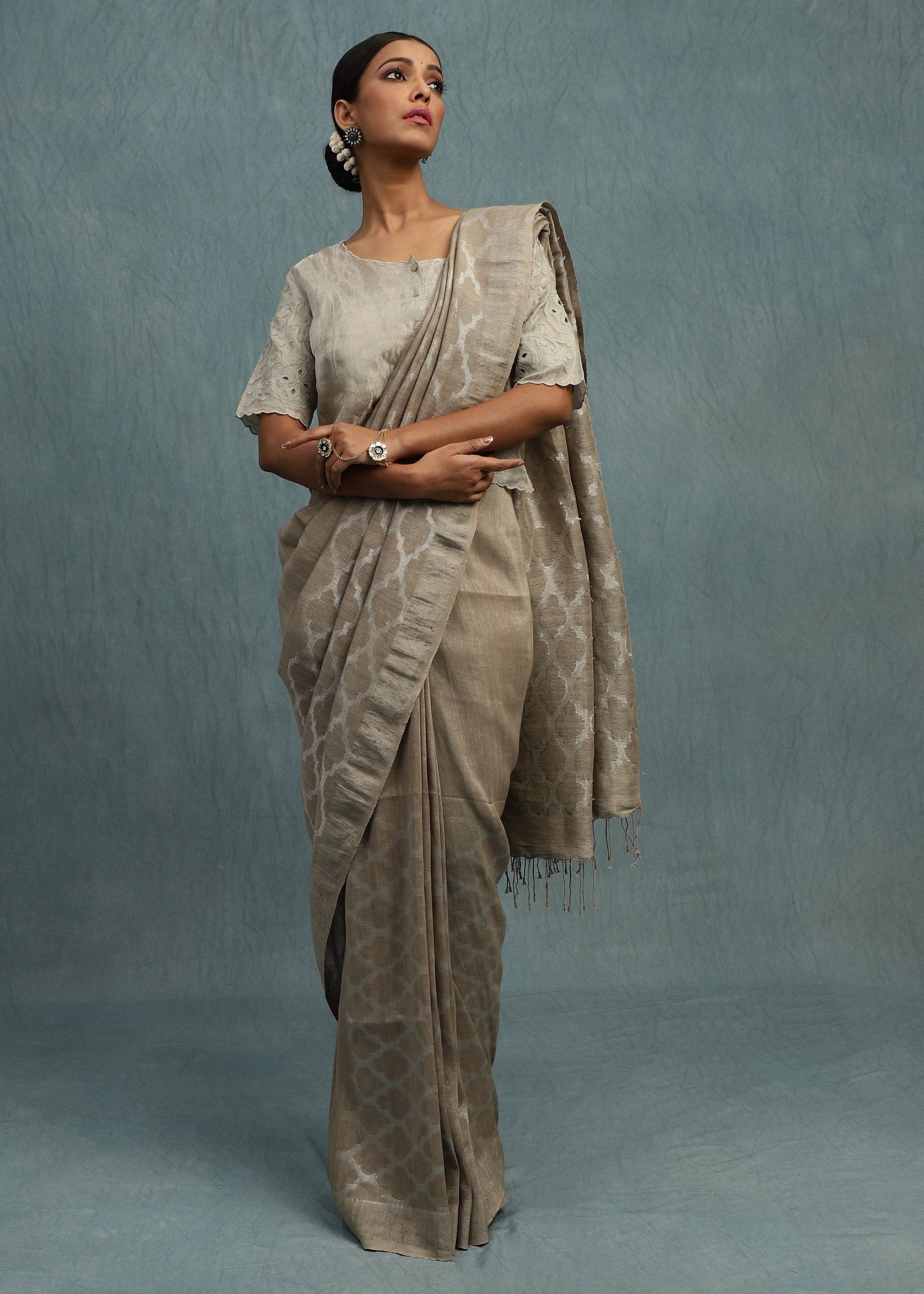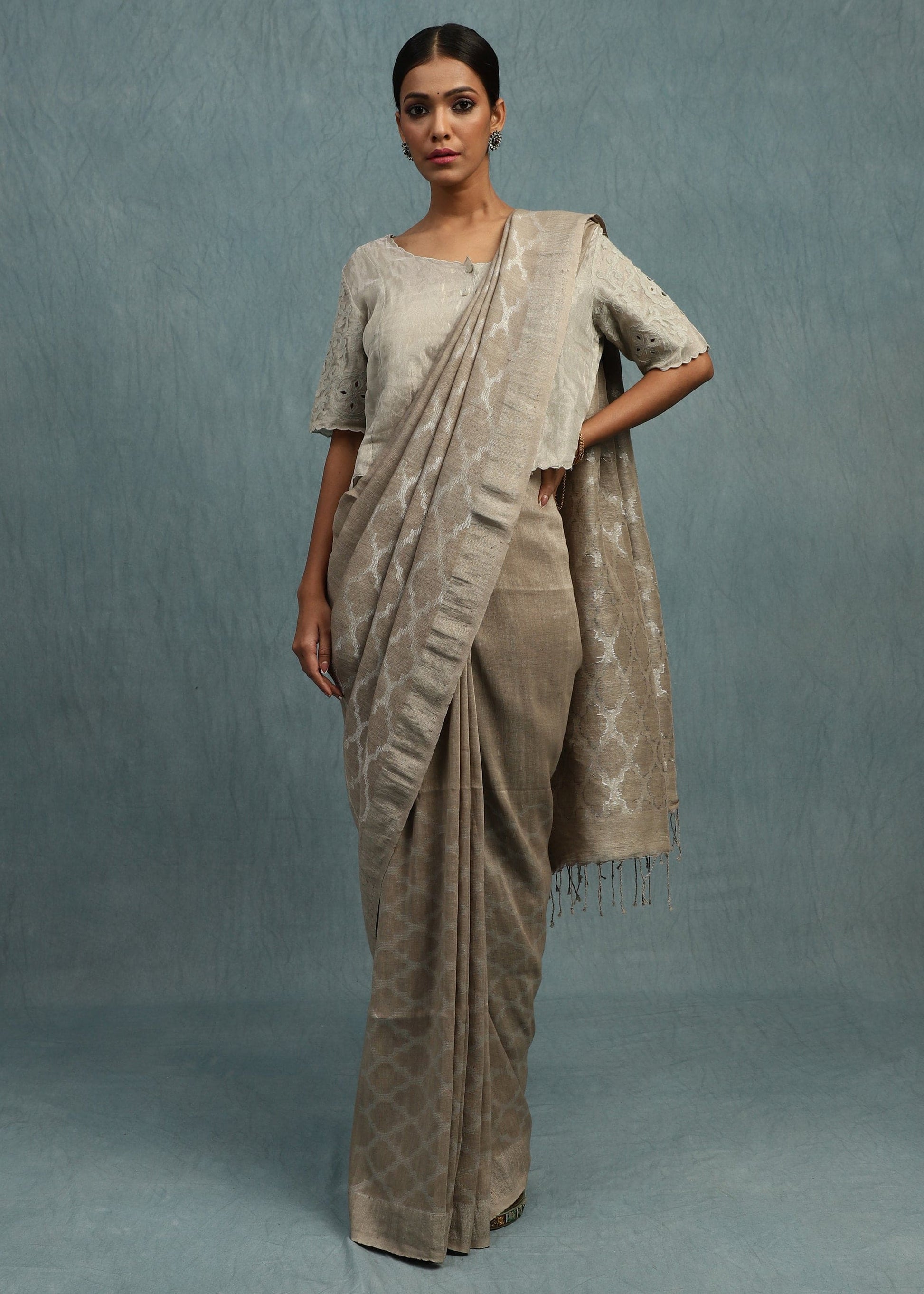 The fine Linen sari with the Kashmir jaali pattern hand woven in silver zari on the Border and Palla is beautifully crafted by the Yumi village weavers.