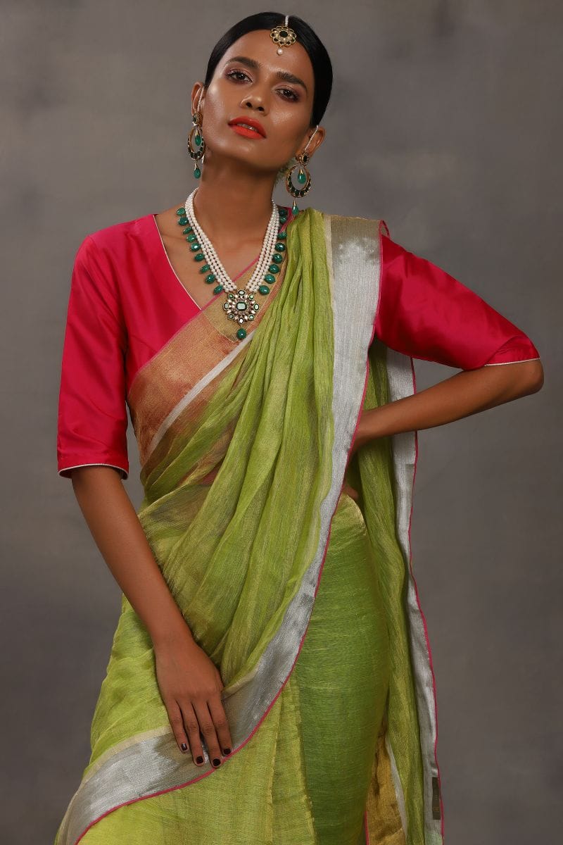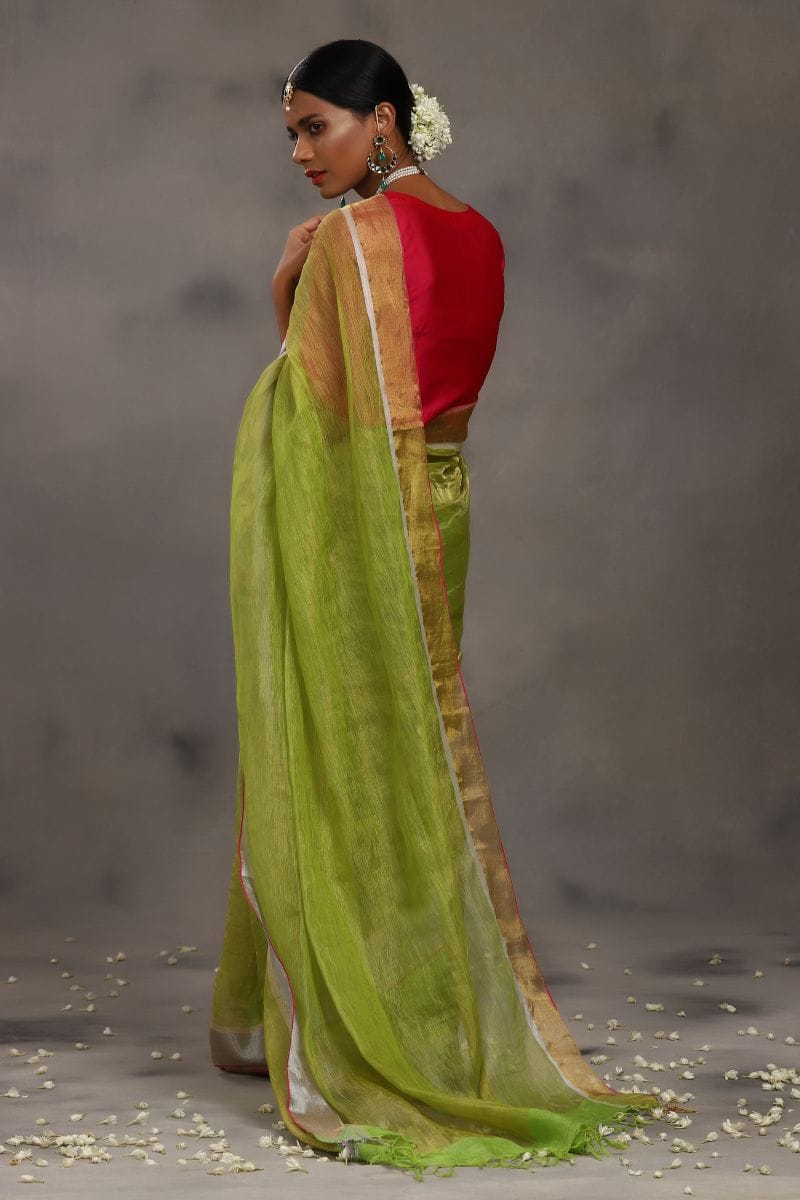 Yumi introduced natural fibres like fine linen that was woven with zari by its weavers in rural villages. Handspun, handwoven fine linen sari with zari. Ganga Jamuna Gold,Silver Zari border. The Noor edit initated the Yumi linen saris that were woven with scintiallating zari colours of gold an silver .The collection is an expression of the brilliance and radiance of indian colours