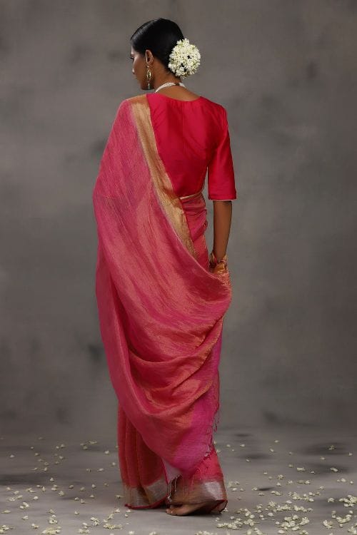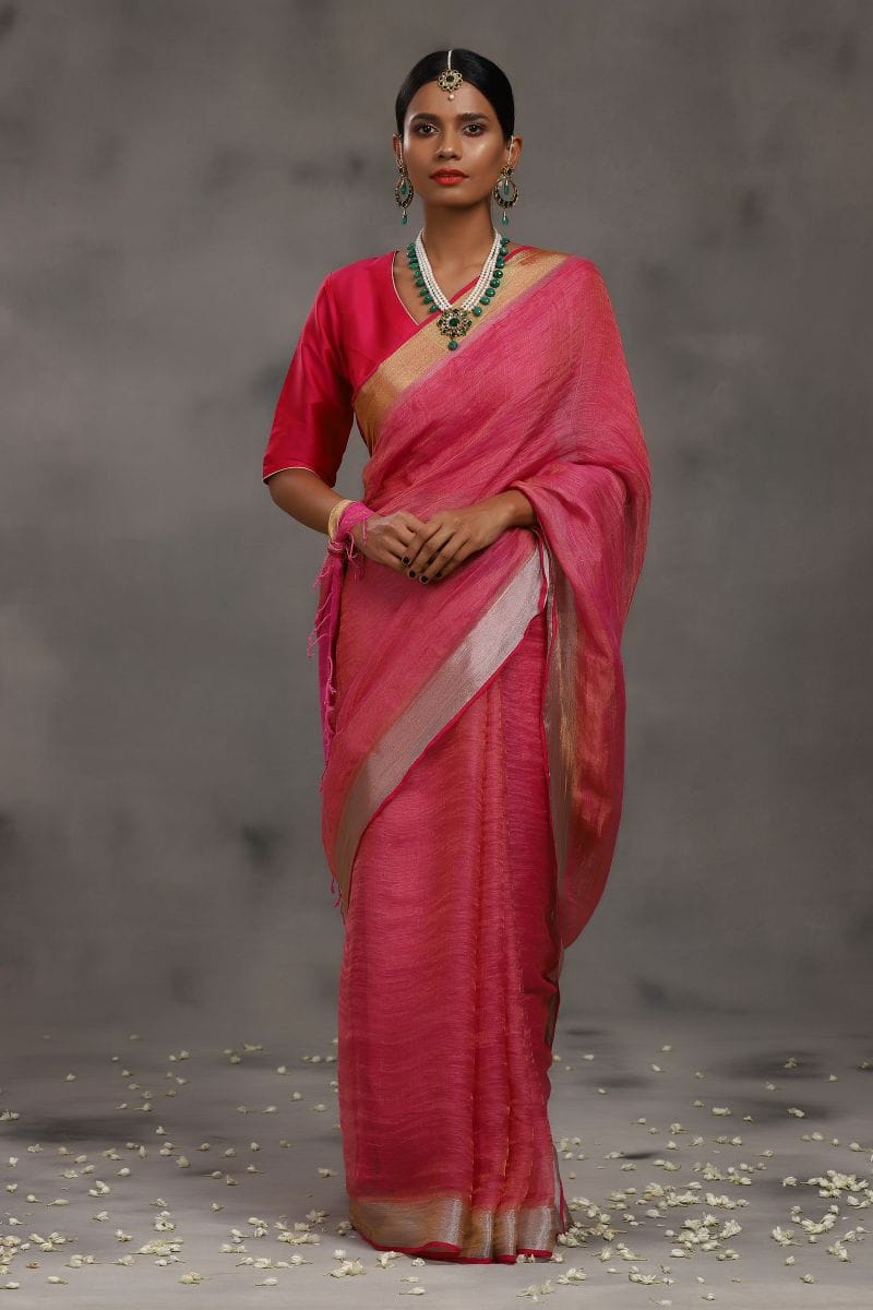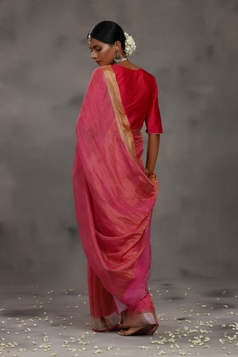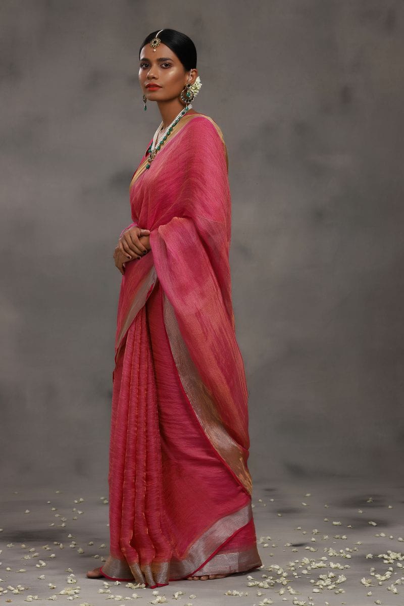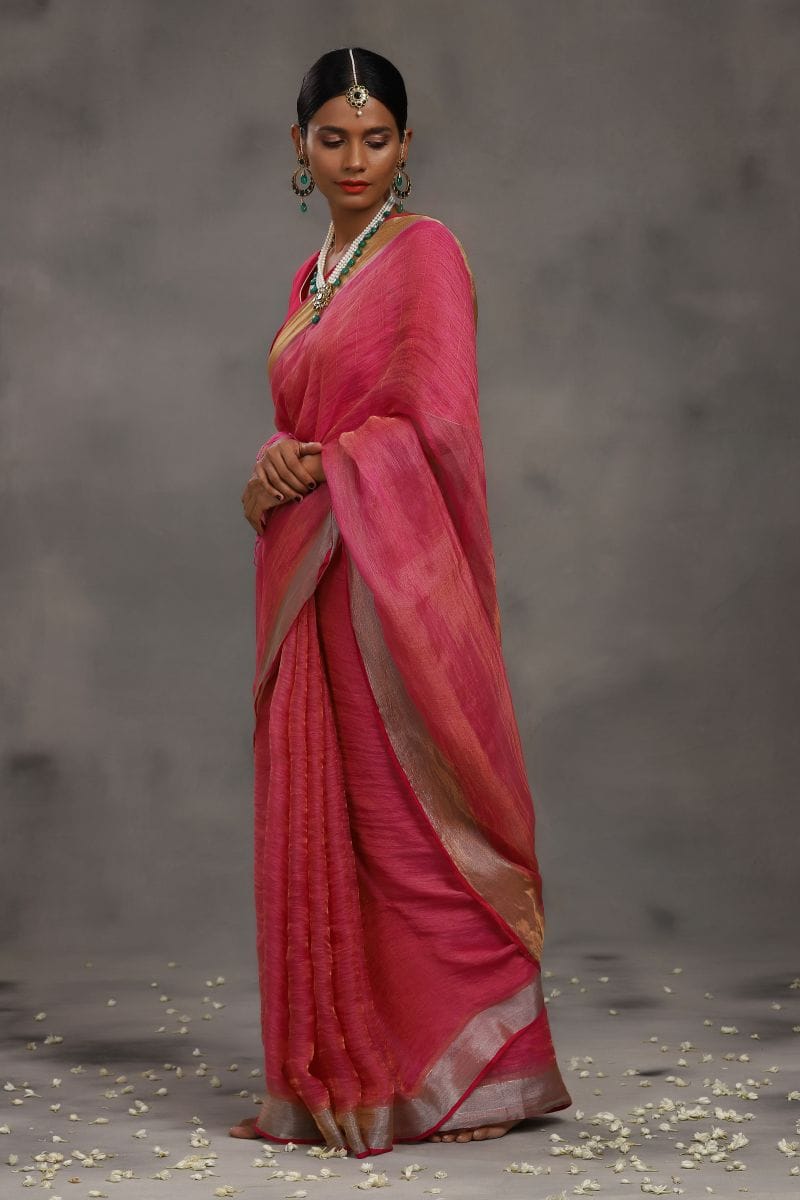 Yumi introduced natural fibres like fine linen that was woven with zari by its weavers in rural villages. Handspun,handwoven fine linen sari with zari. Ganga Jamuna Gold,Silver Zari border. The Noor edit initated the Yumi linen saris that were woven with scintiallating zari colours of gold an silver .The collection is an expression of the brilliance and radiance of Indian colours.
