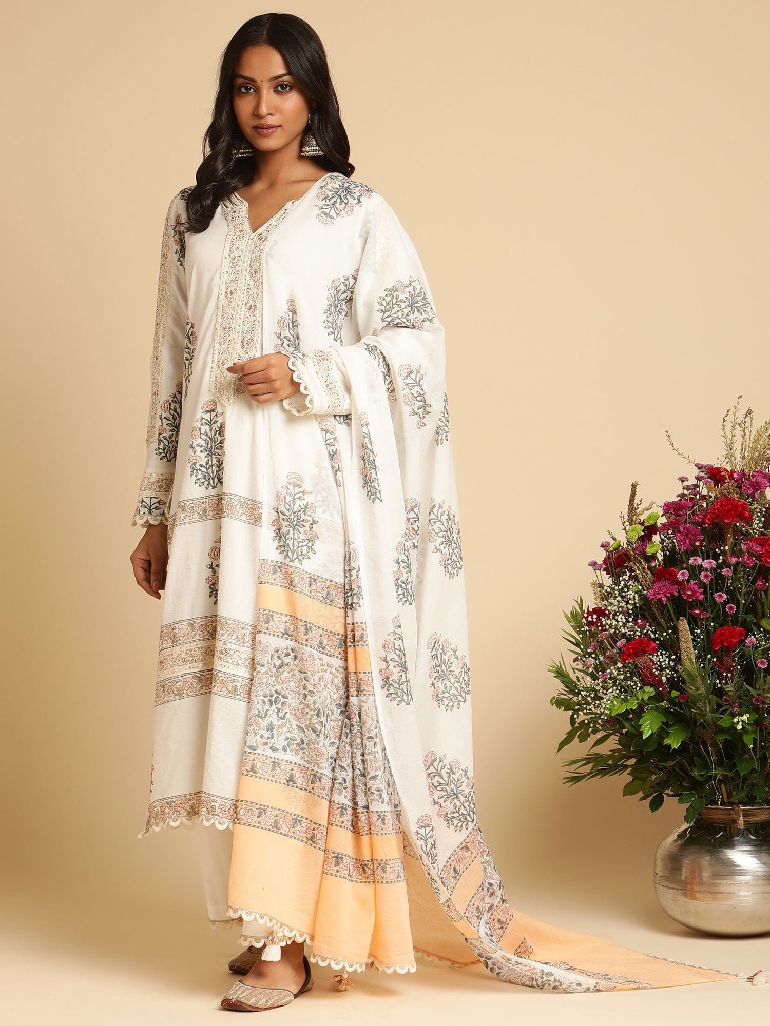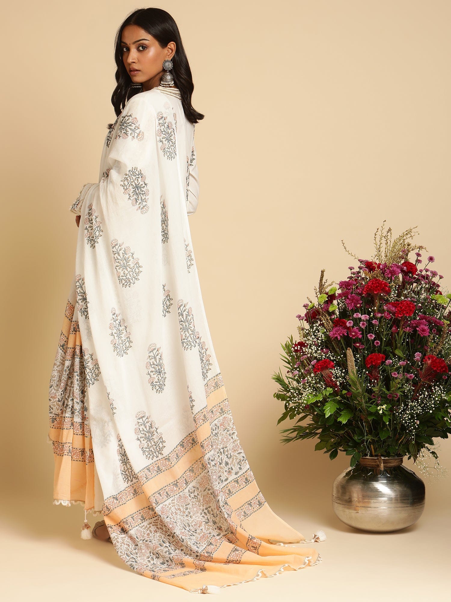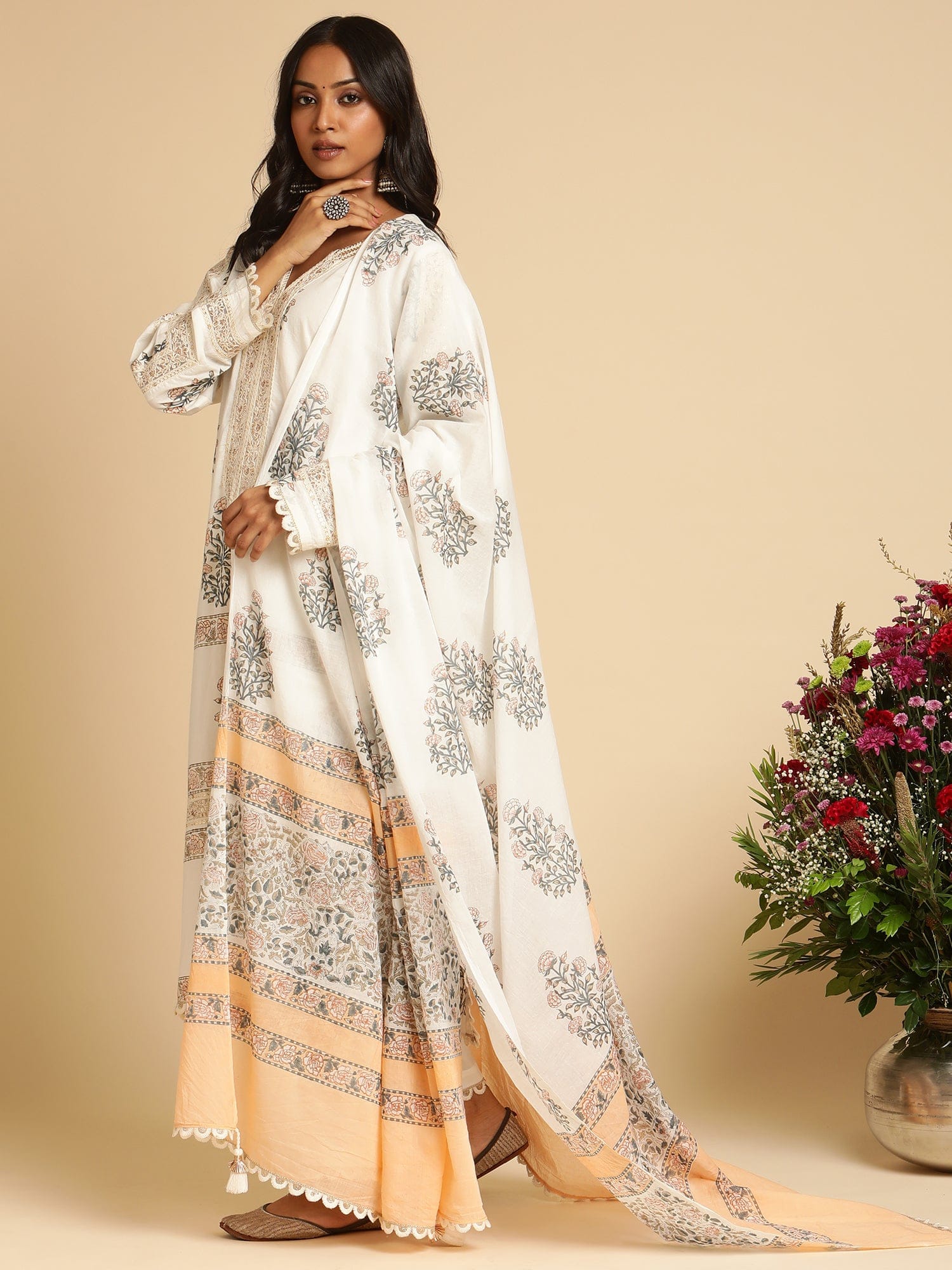 Yumi's Artisanal Clothing is hand block printed on fine organic cotton by our artisans. The set of an exquisitely designed Kurta and a Dupatta is hand printed in an all soft tones of peach and grey booties on ecru. There is decorative embroidered gota and lace work by village women on the ensemble.
