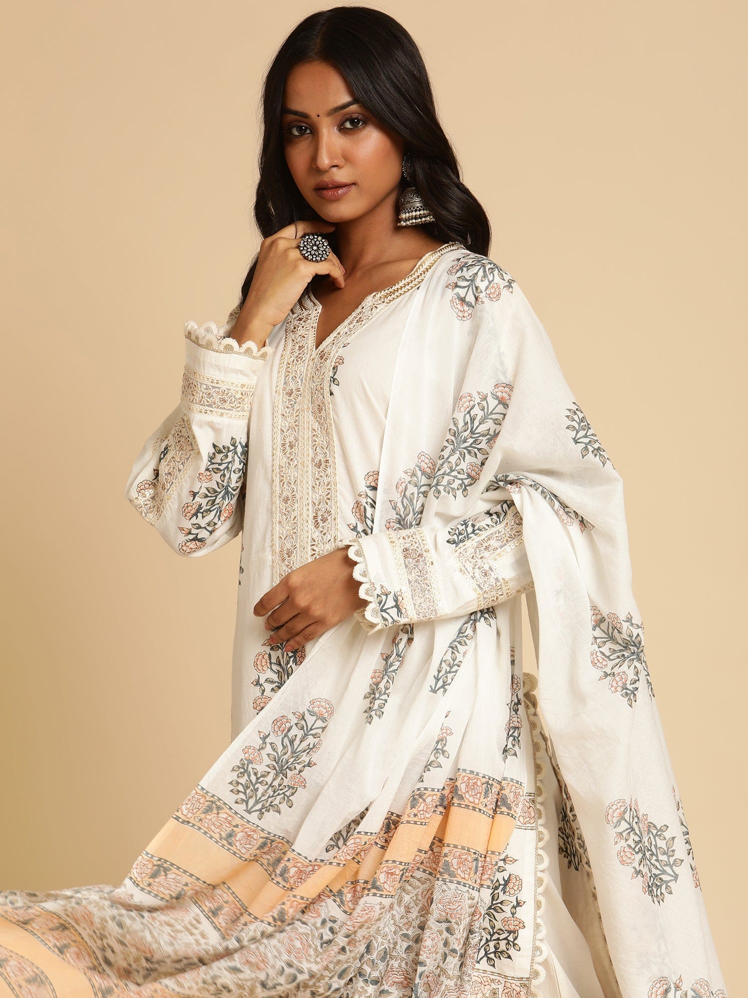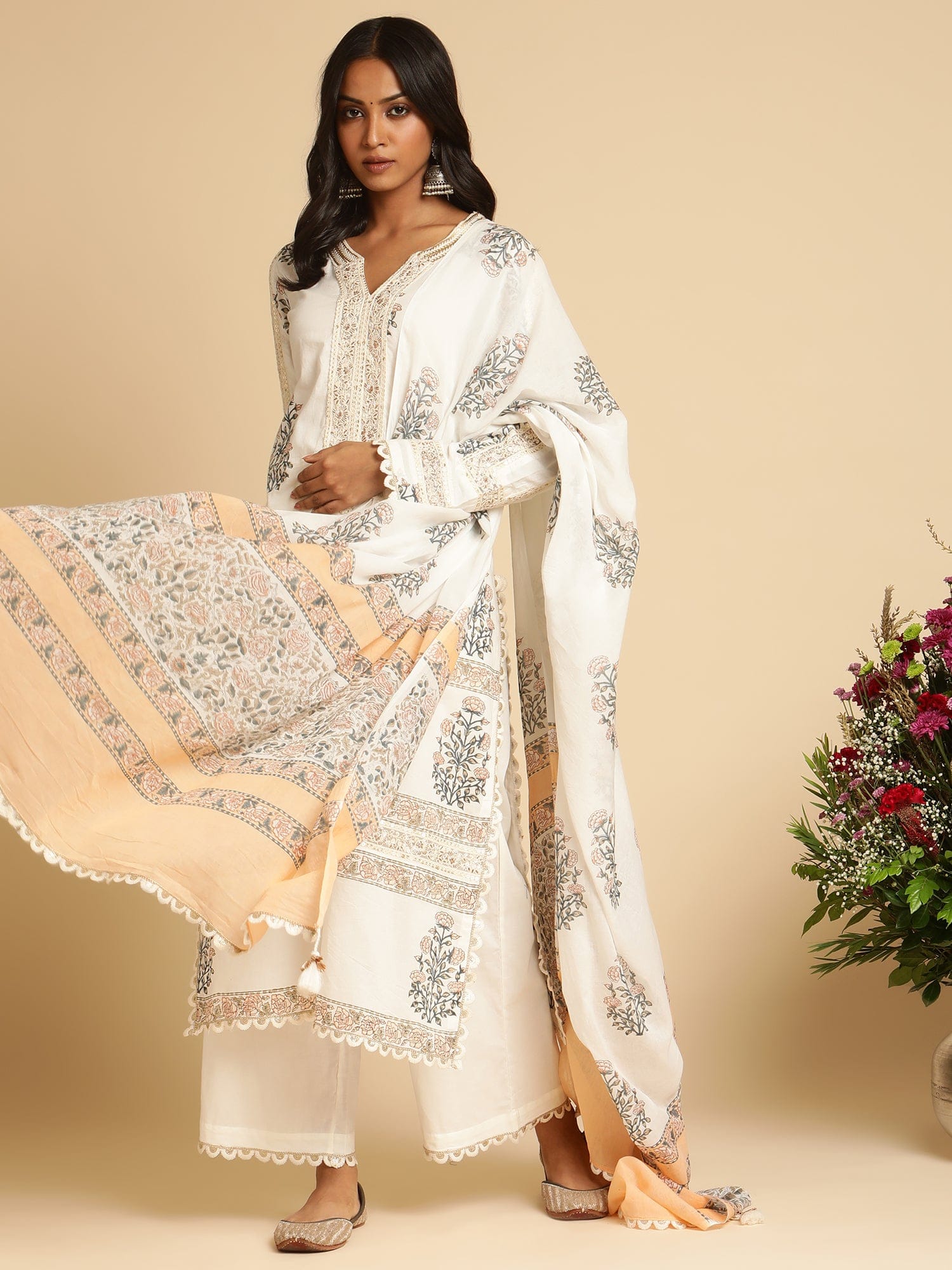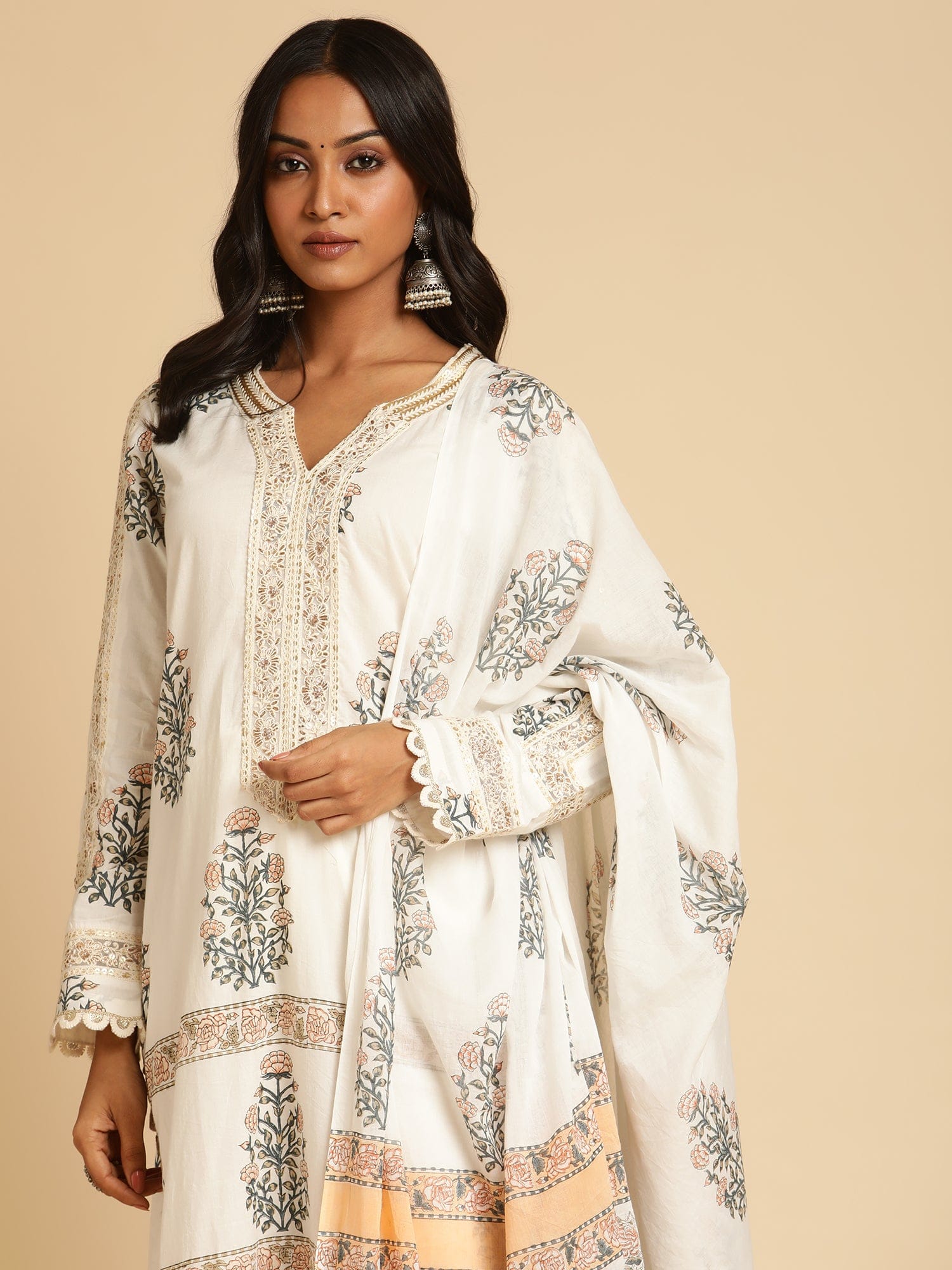 Yumi's Artisanal Clothing is hand block printed on fine organic cotton by our artisans. The set of an exquisitely designed Kurta and a Dupatta is hand printed in an all soft tones of peach and grey booties on ecru. There is decorative embroidered gota and lace work by village women on the ensemble.