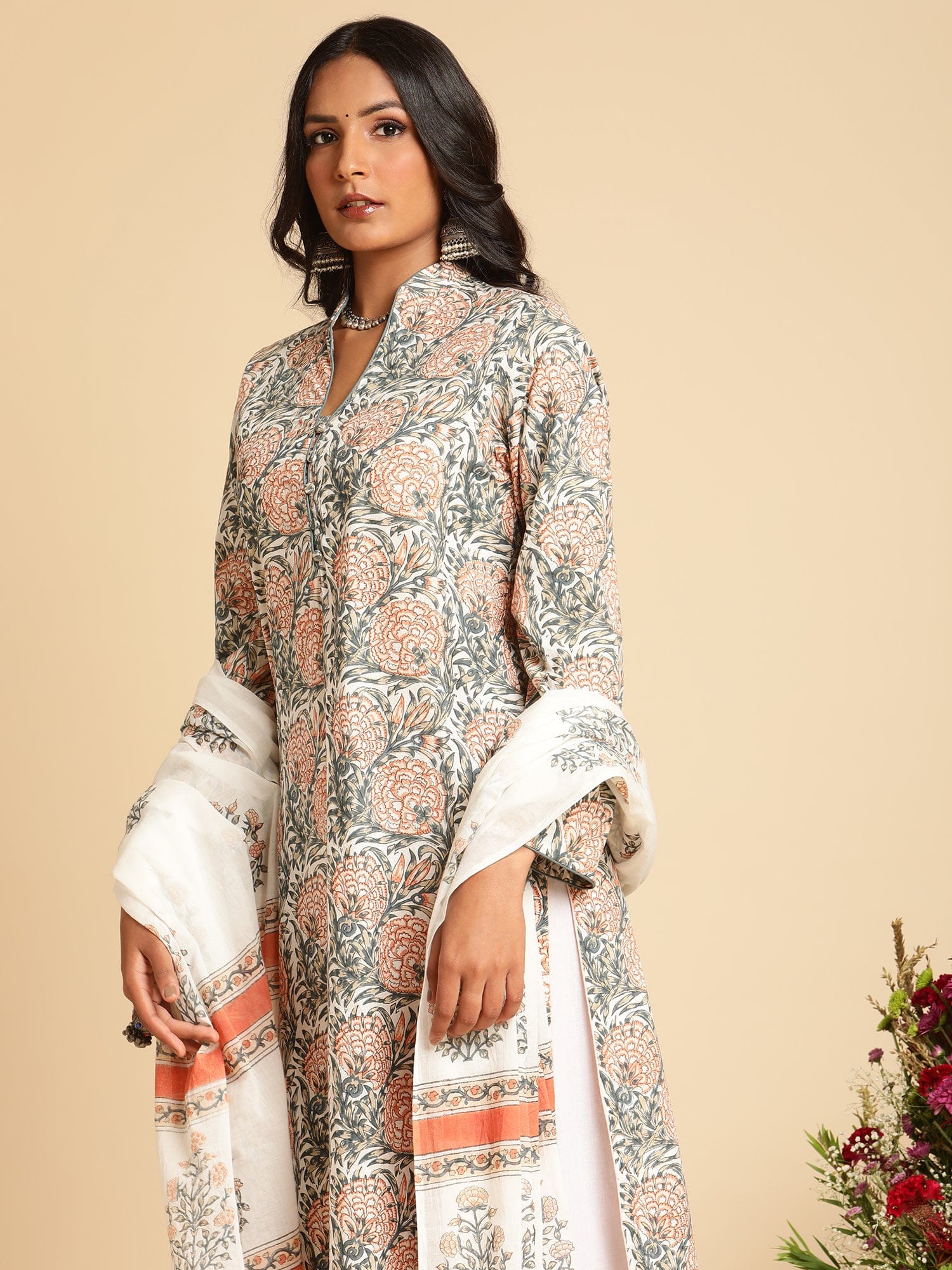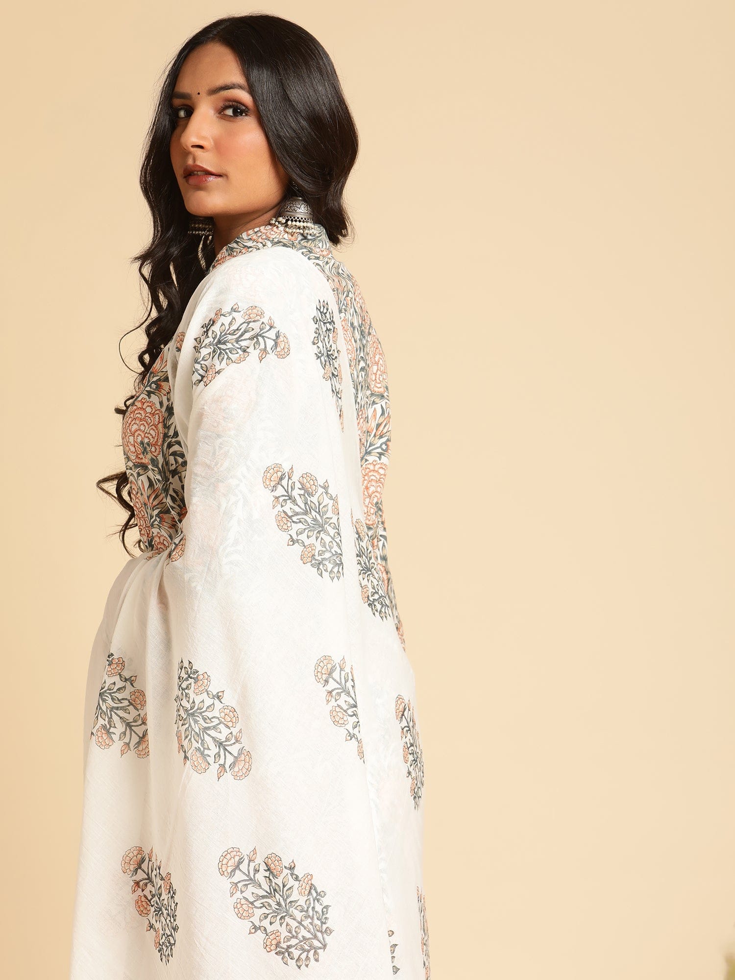 Yumi's Artisanal Clothing is hand block printed on fine organic cotton by our artisans. The set of a beautiful Kurta and a Dupatta is hand printed in an all over peach marigold floral pattern. There is simple finishing details on the ensemble.