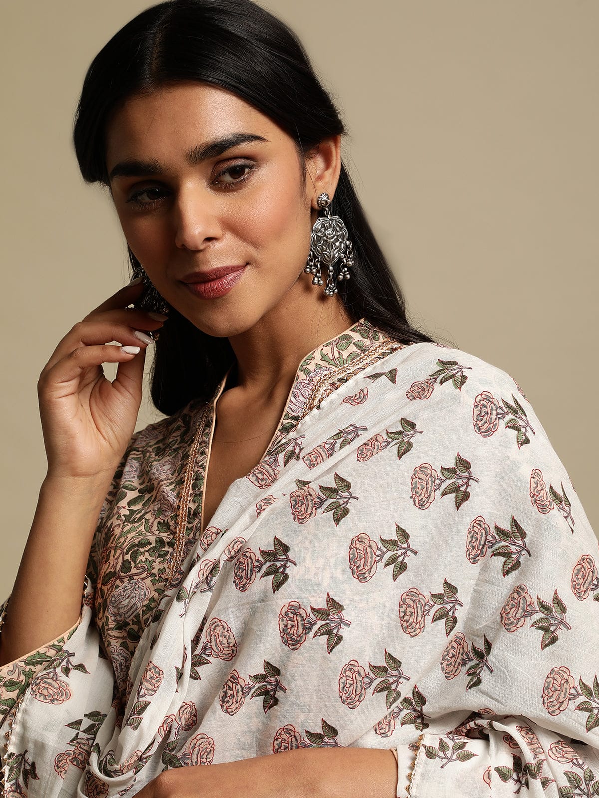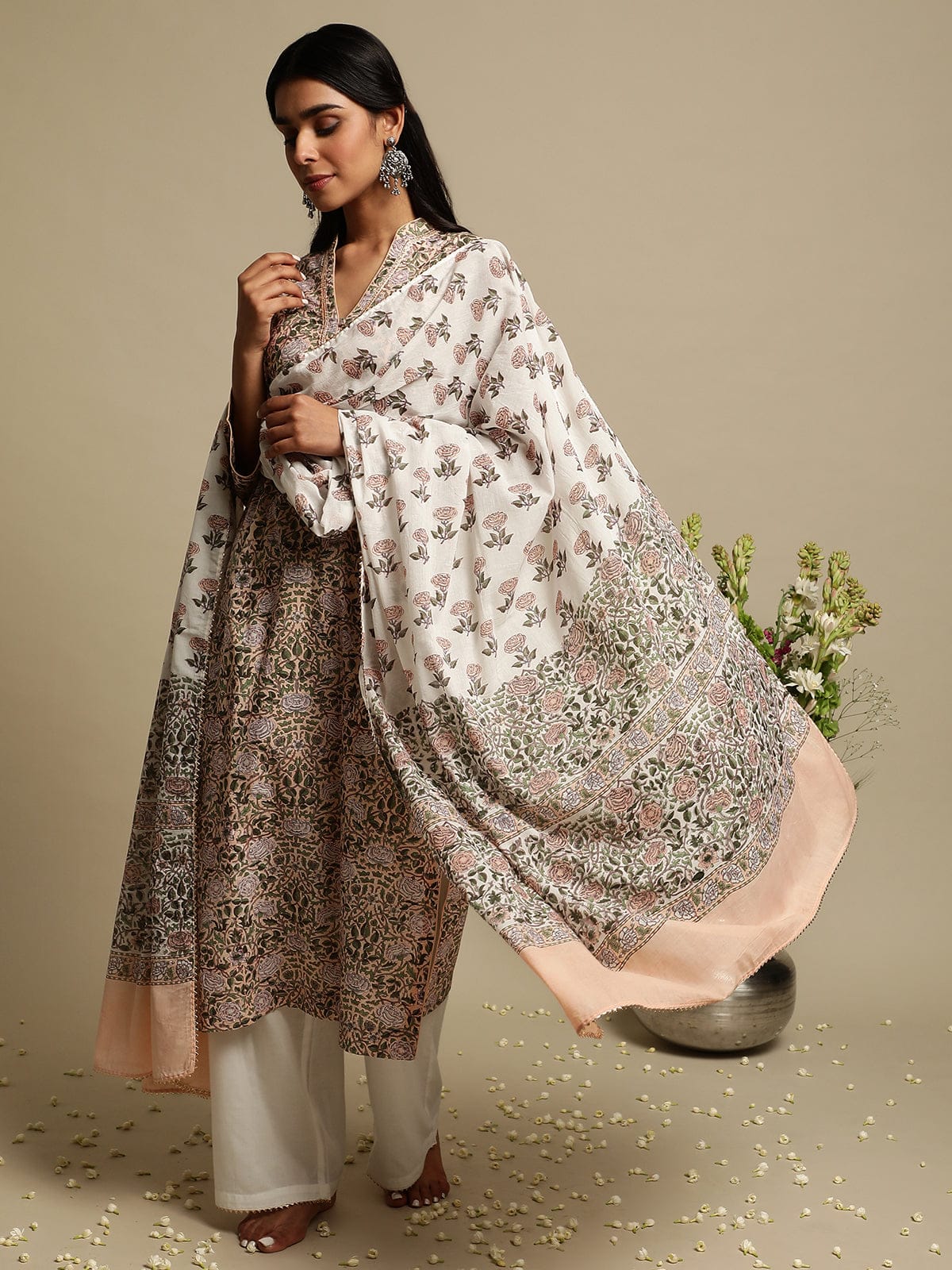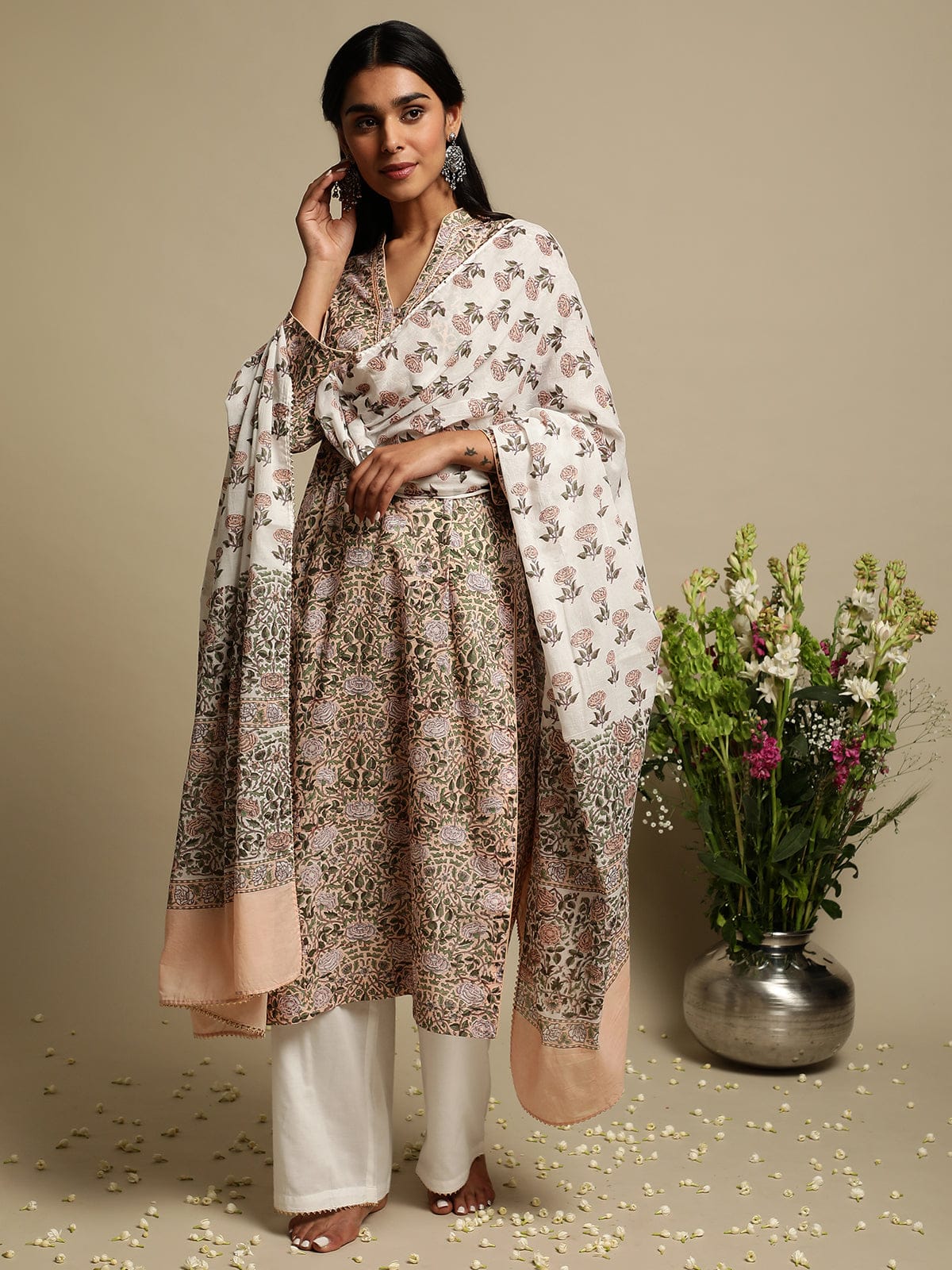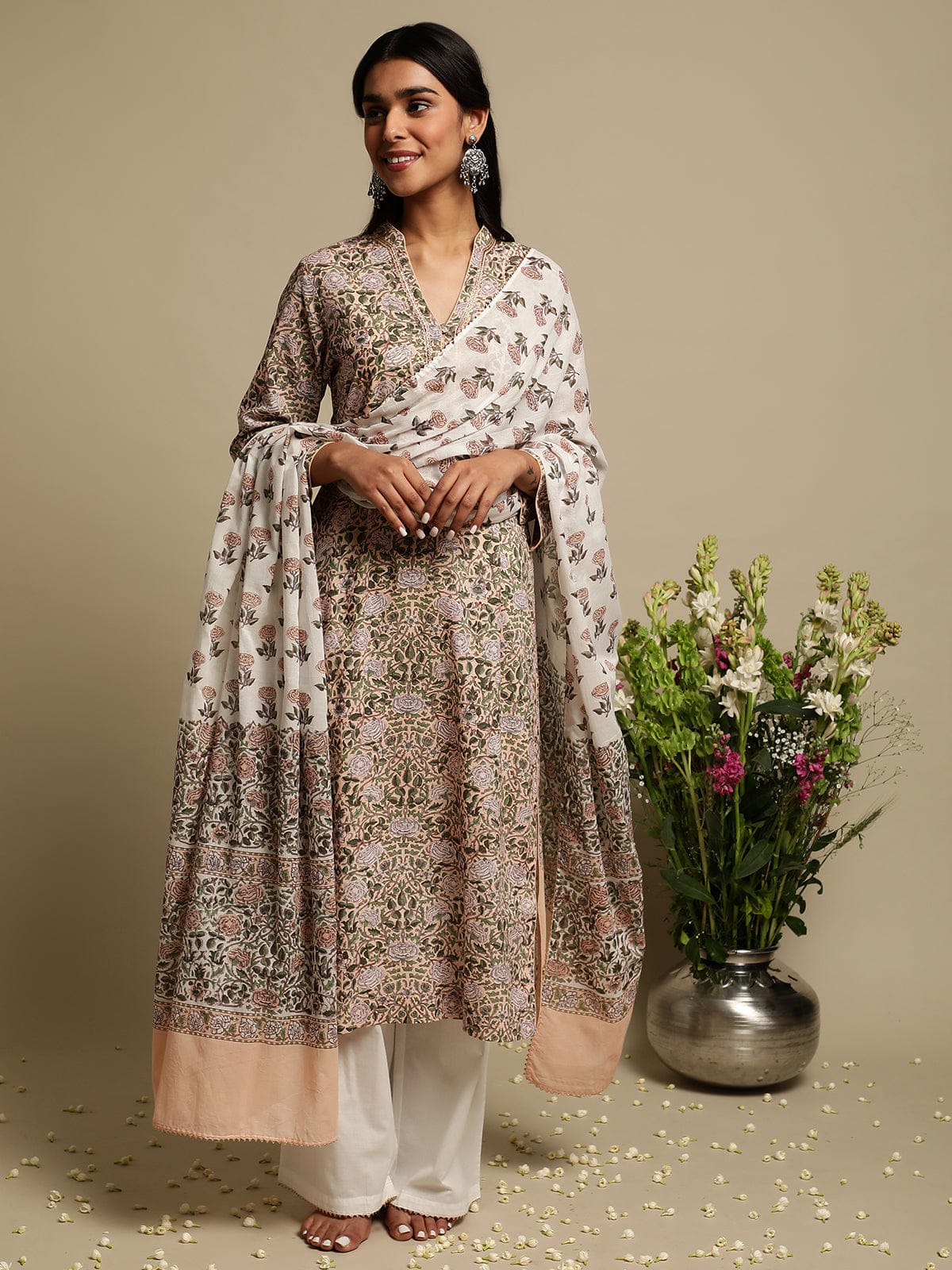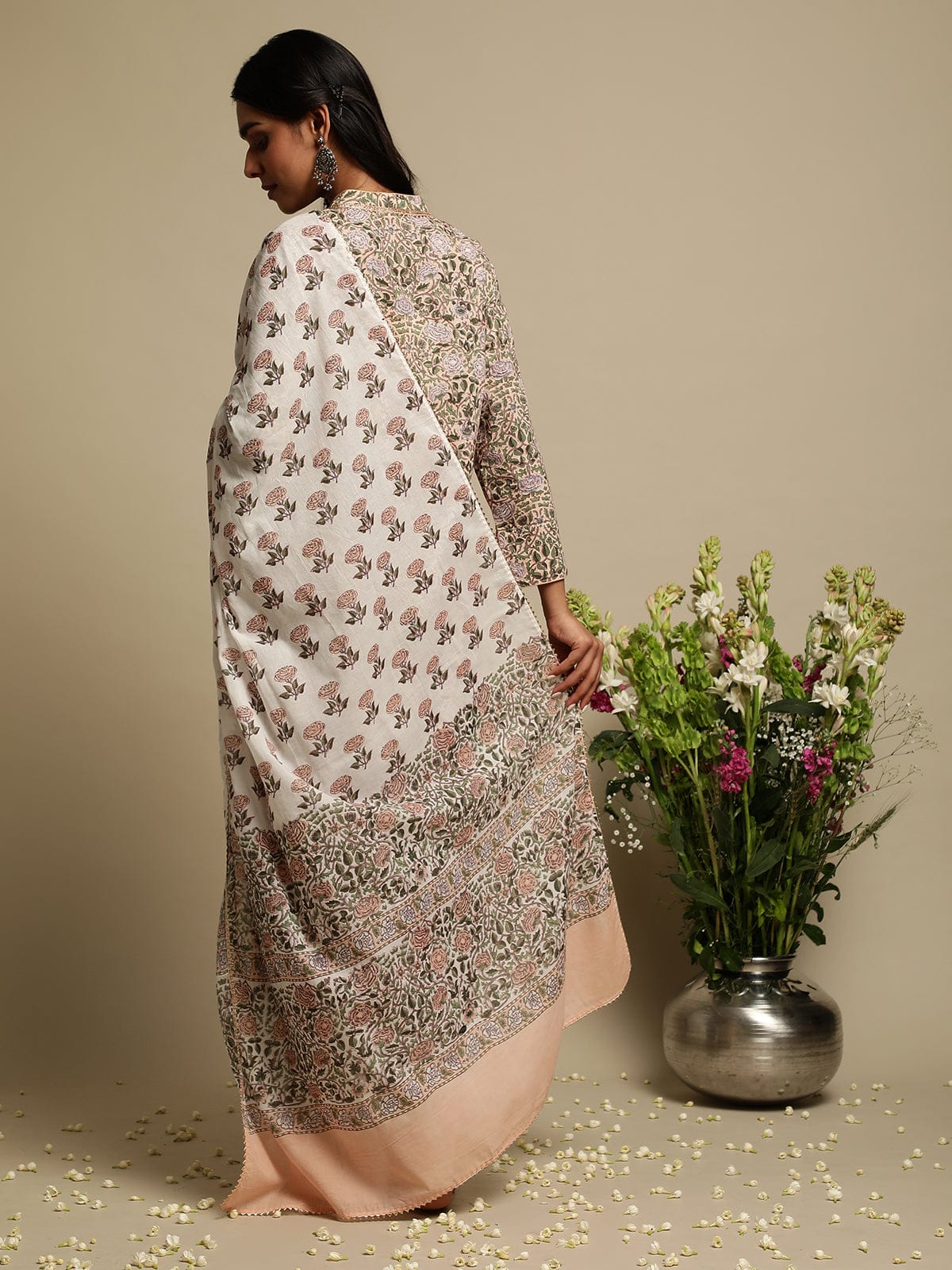 Yumi's Artisanal Clothing is hand block printed on fine organic cotton by our artisans. The set of a beautifully crafted Kurta and a Dupatta is hand printed in our soft pink rose jaal.