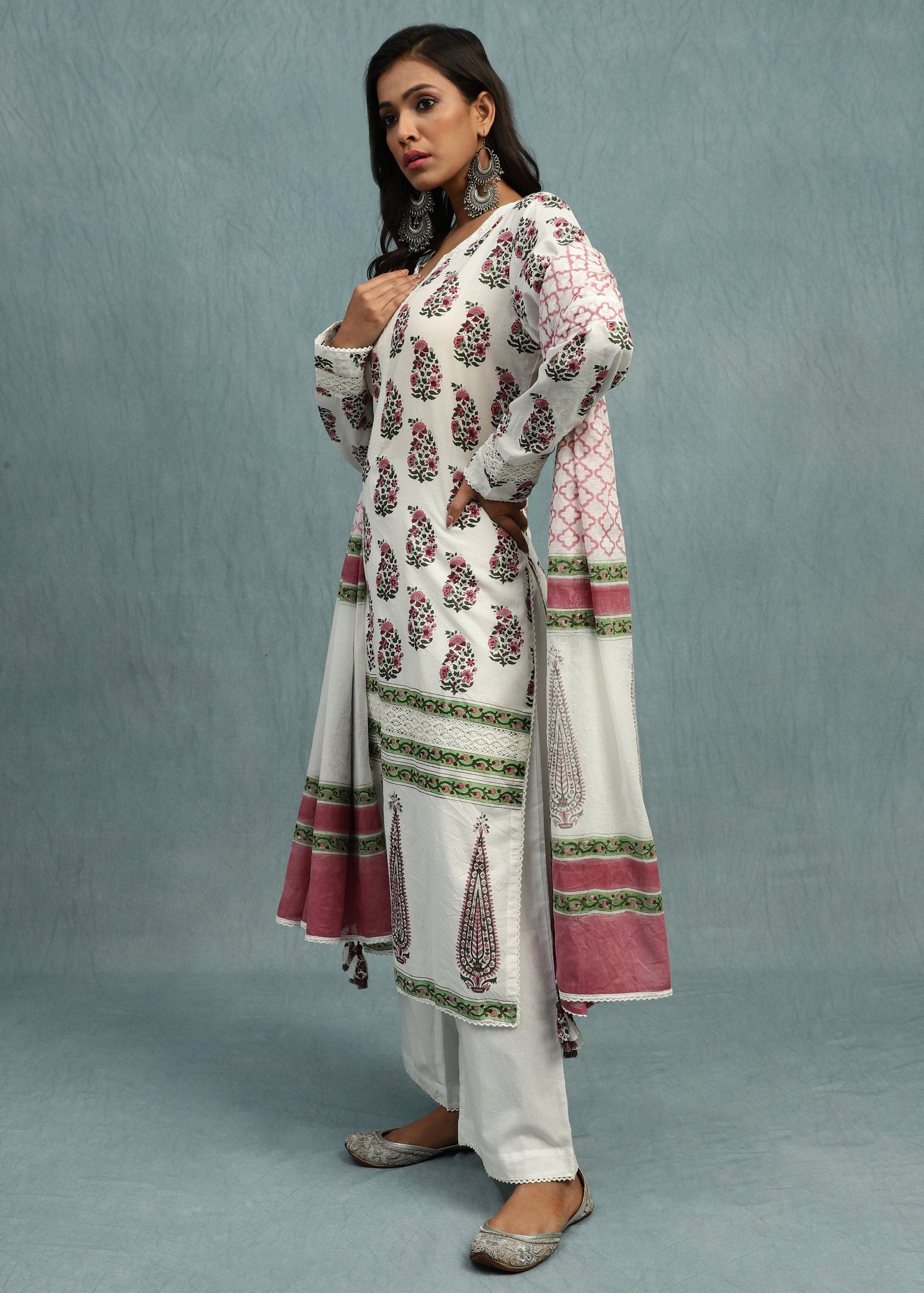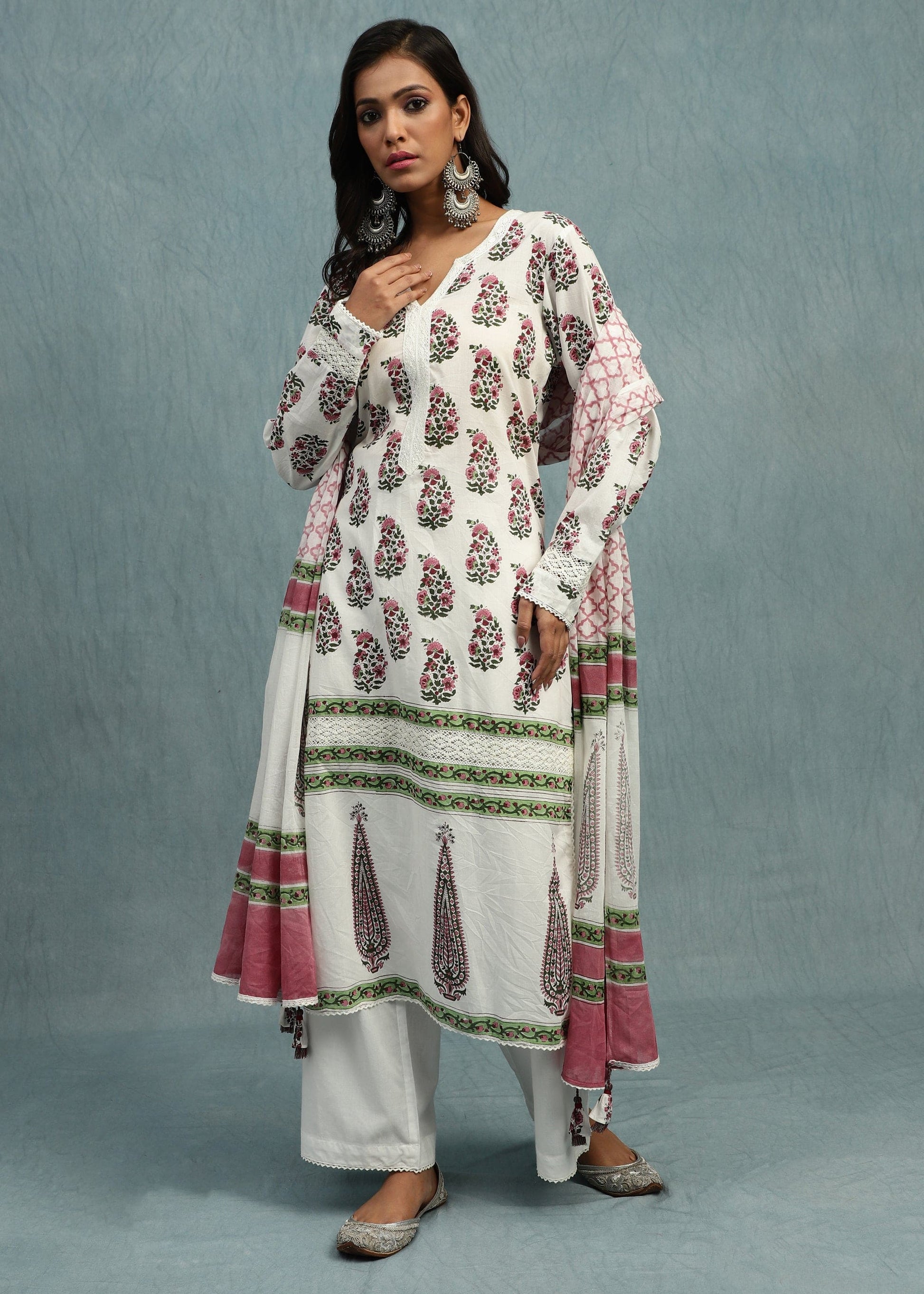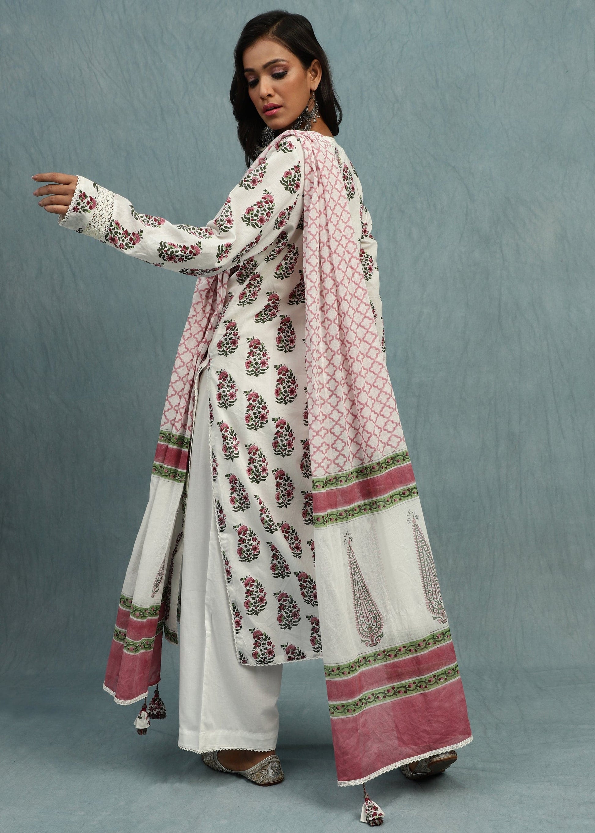 Pink Paisley Bootie Organic Cotton Hand Block Printed Kurta - (3 Pcs Set)
