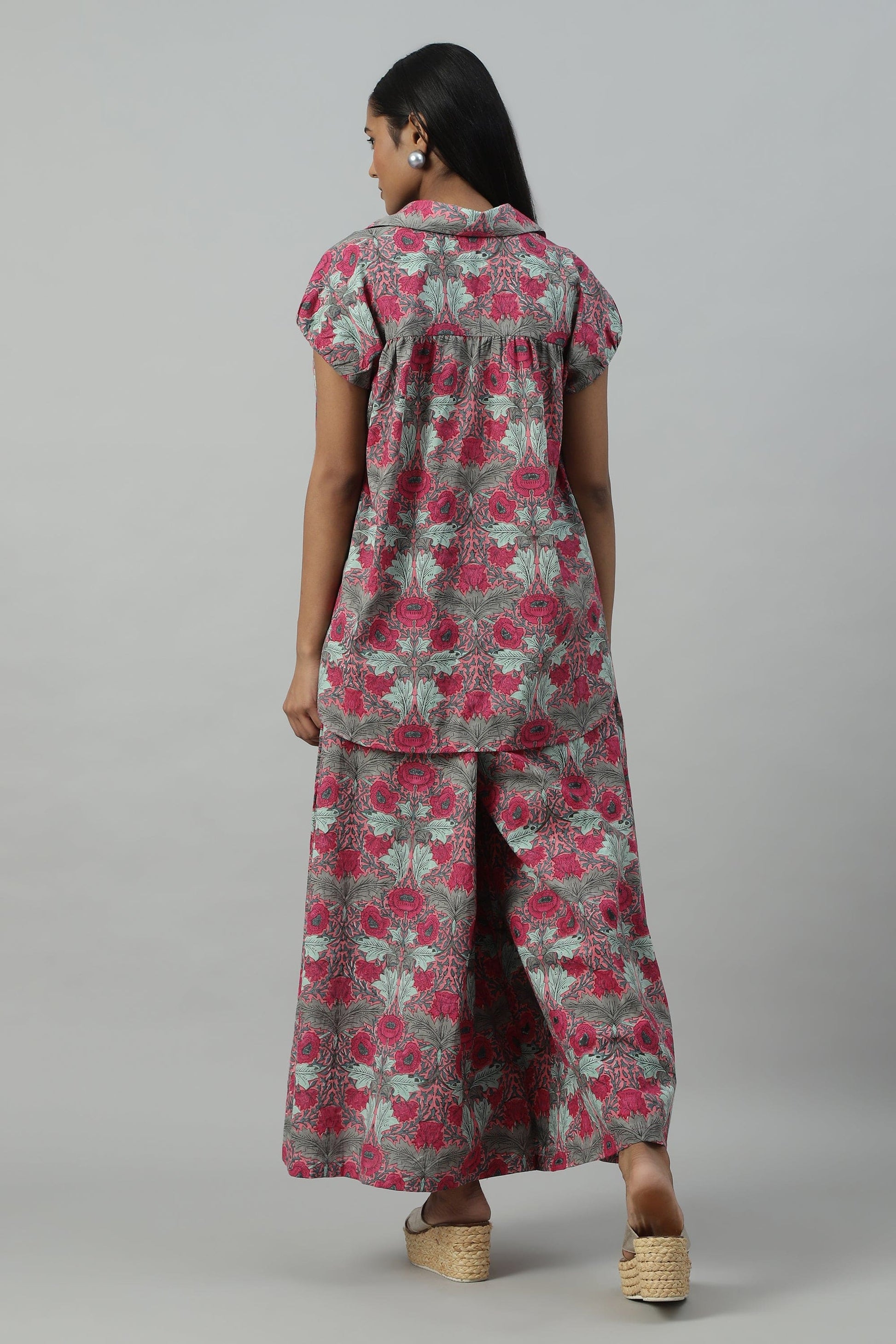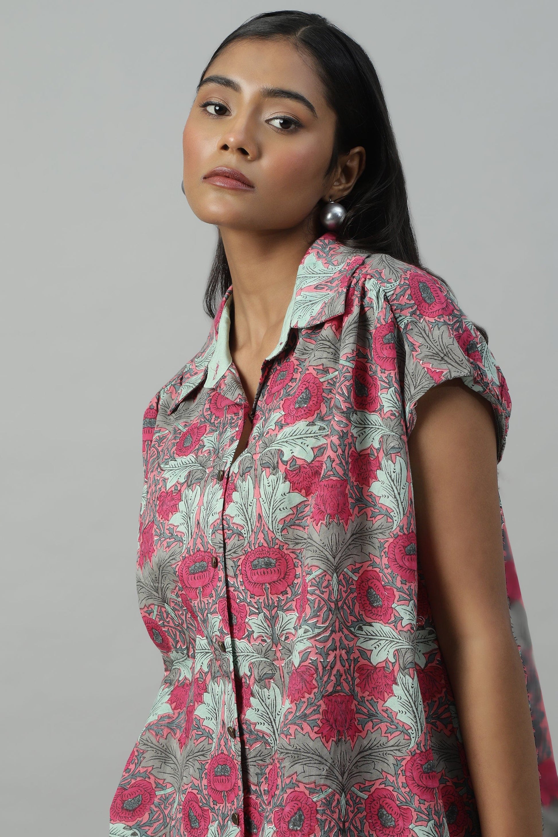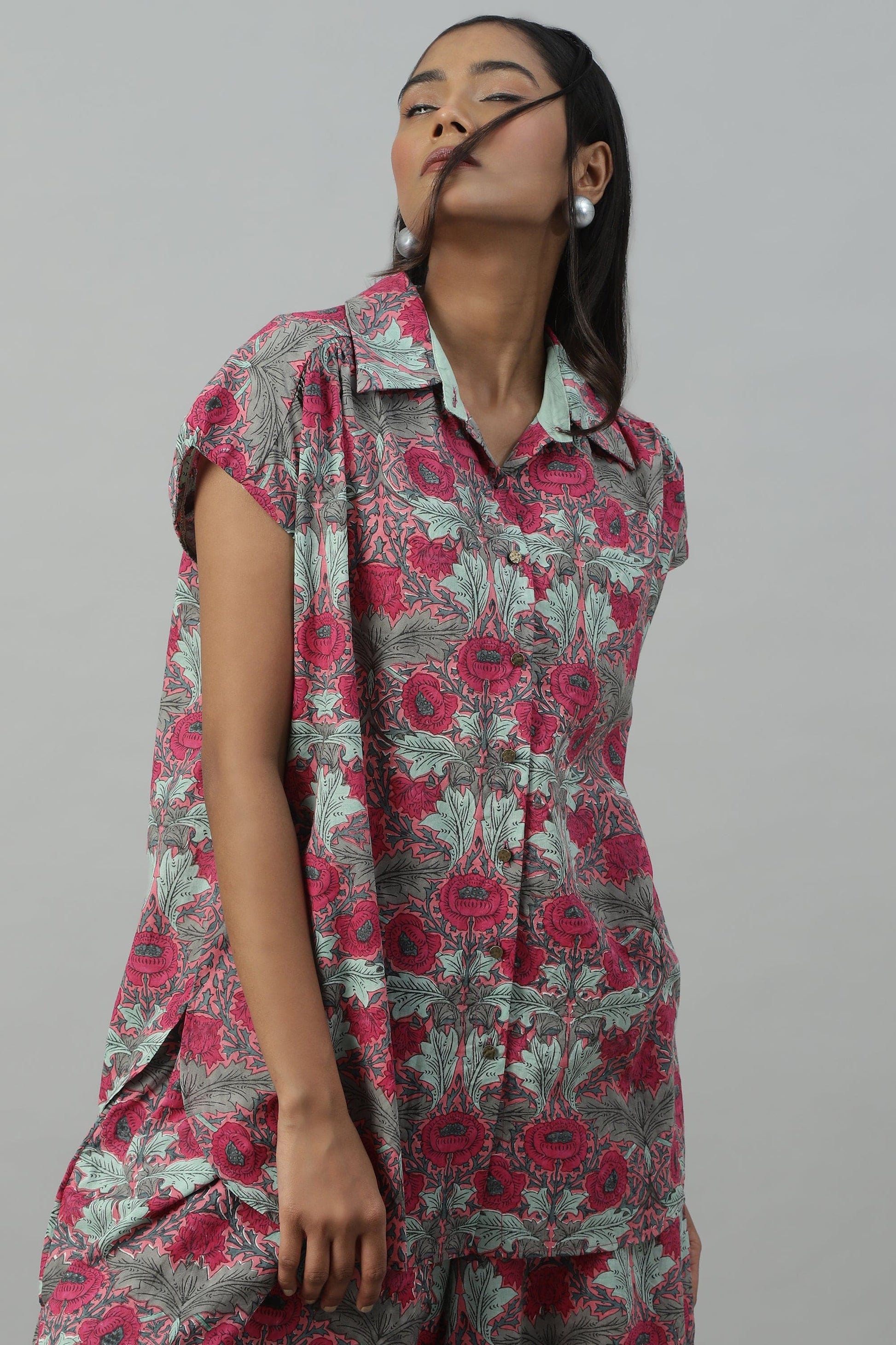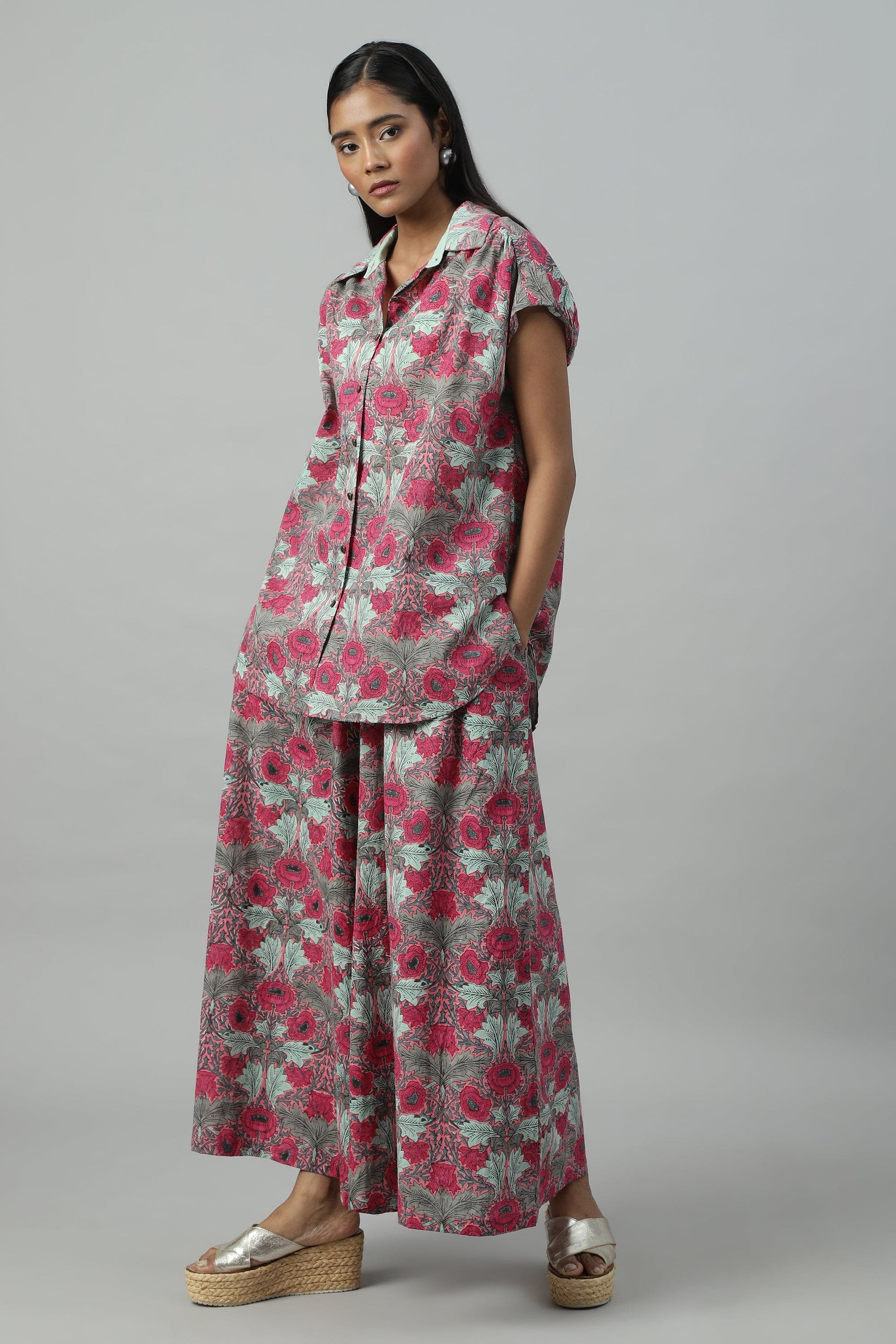 The pink poppy shirt and flare pants set in soft organic cotton has been designed to sustain the continuity of support for the hand block print women artisans