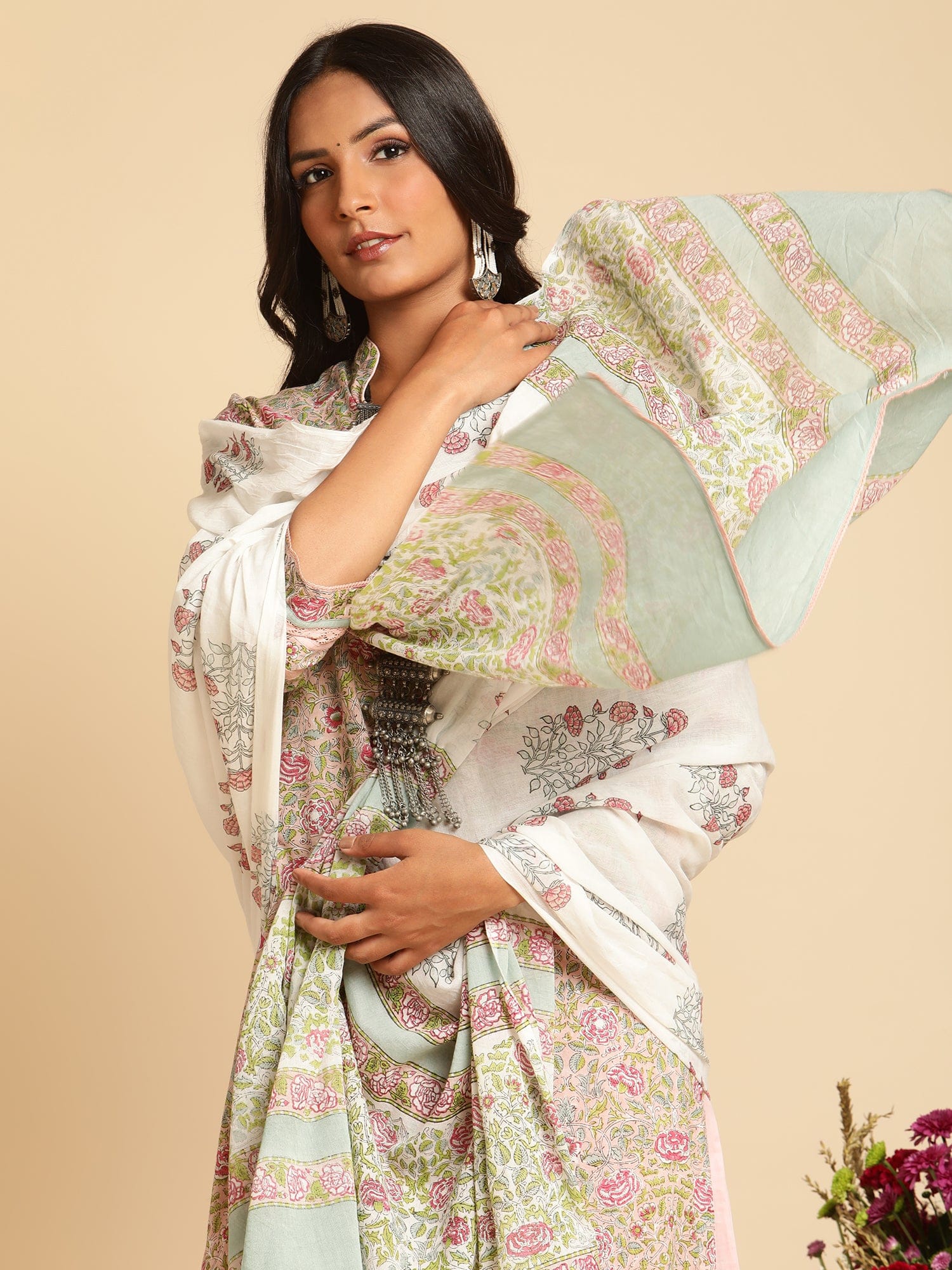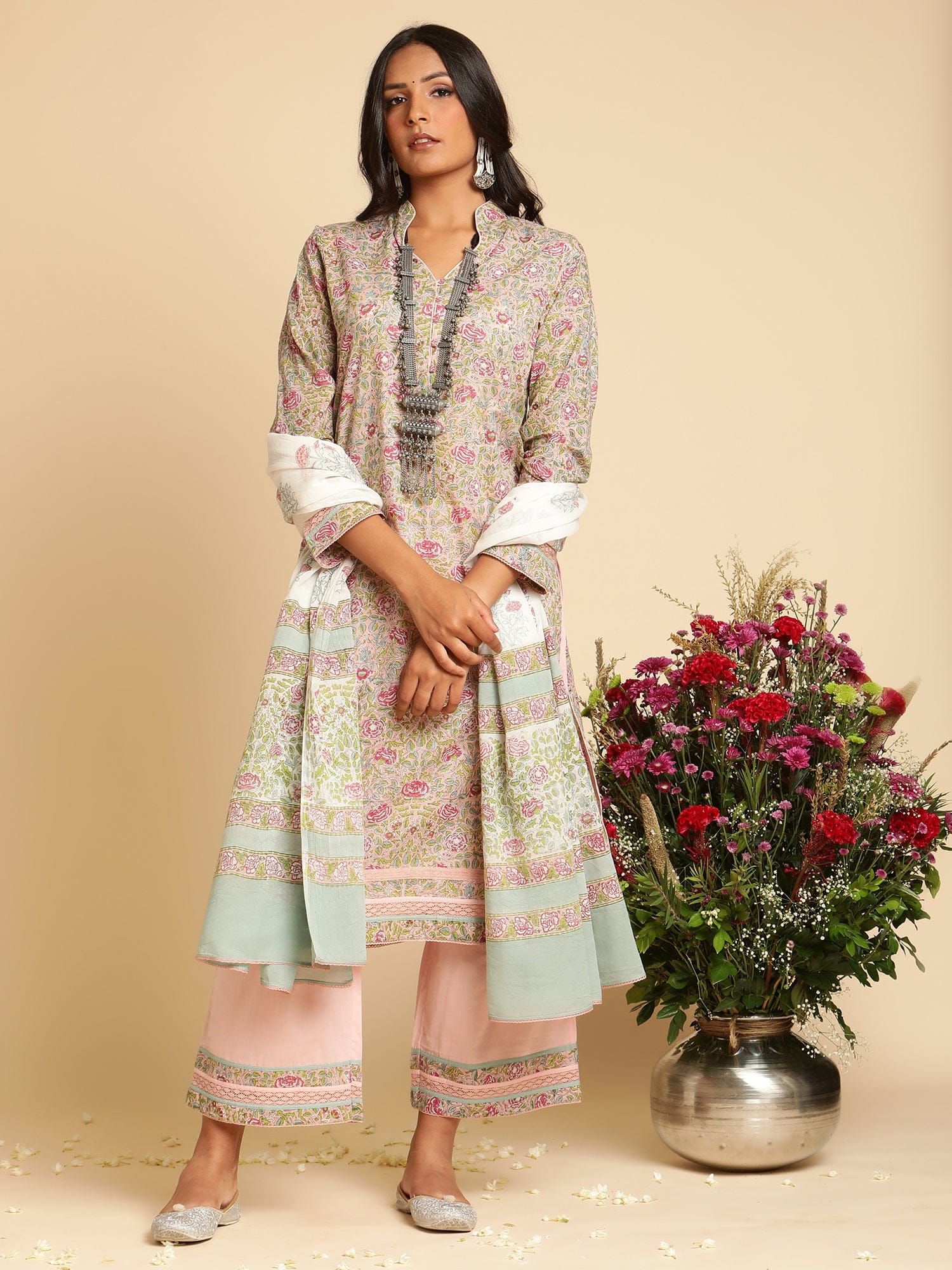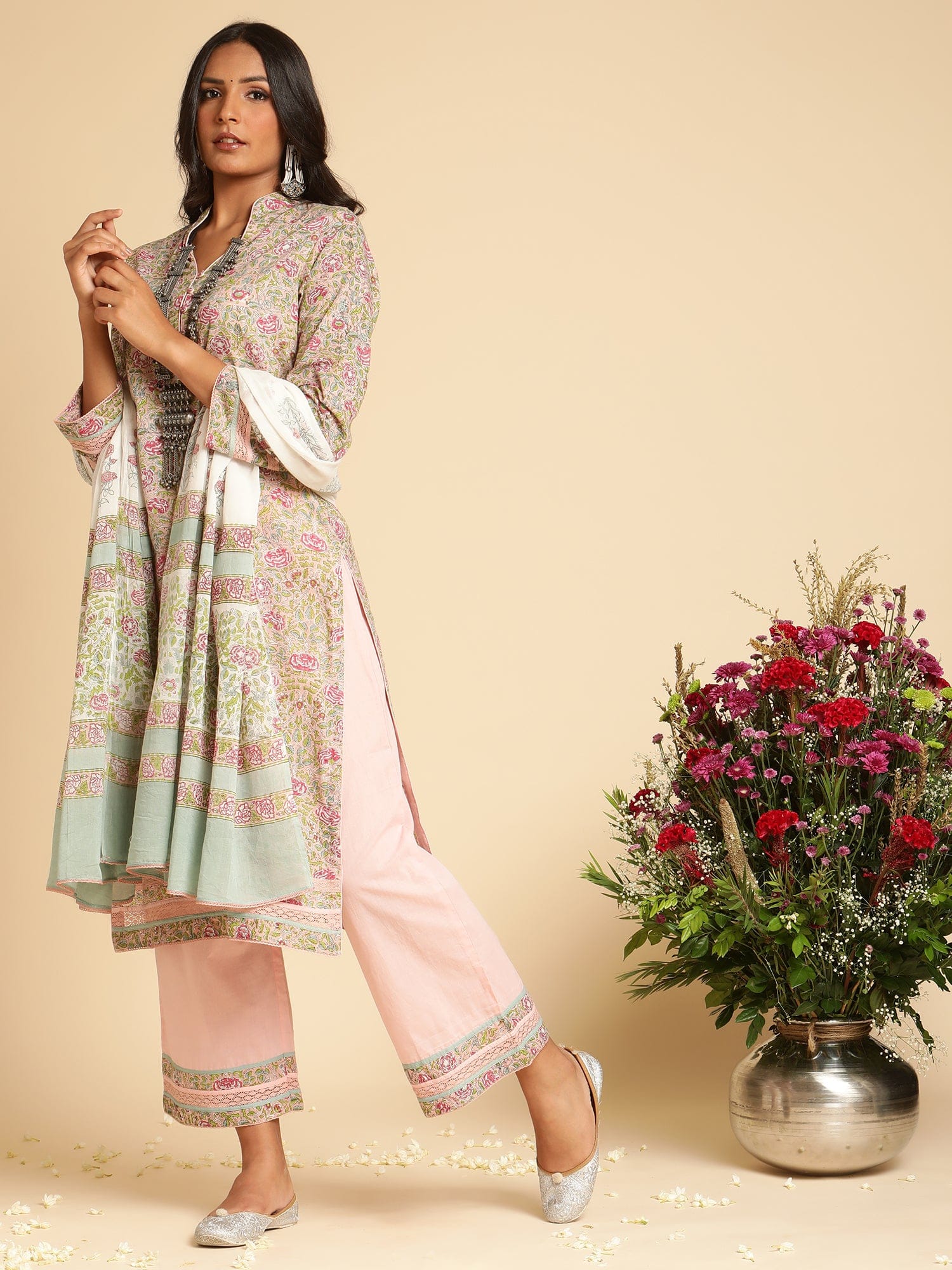 Pink Rose Jaal Lace Organic Cotton Hand Block Printed Kurta - (3 Pcs Set)