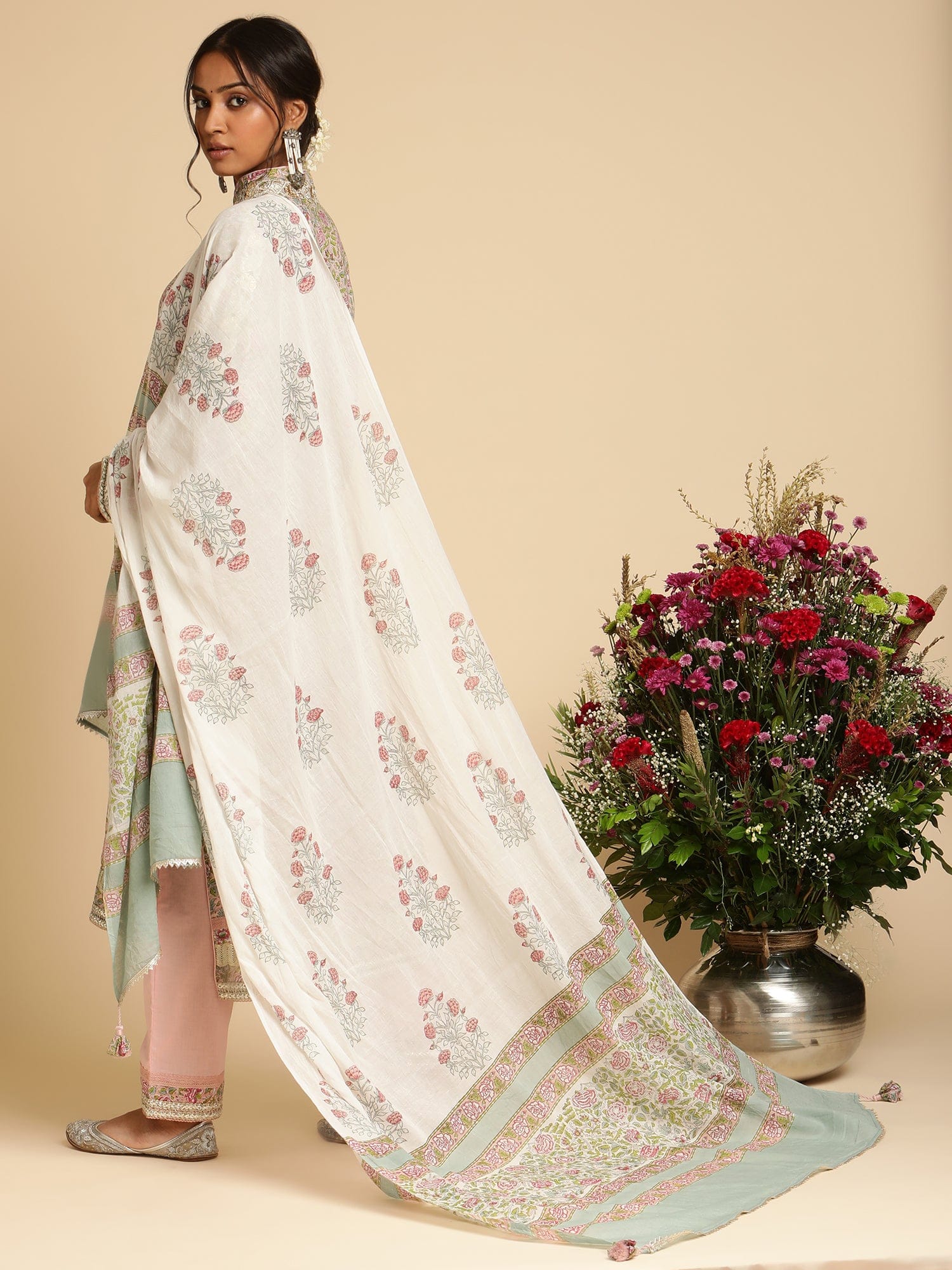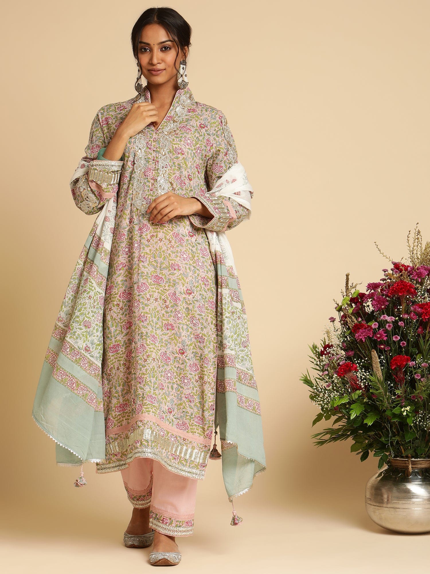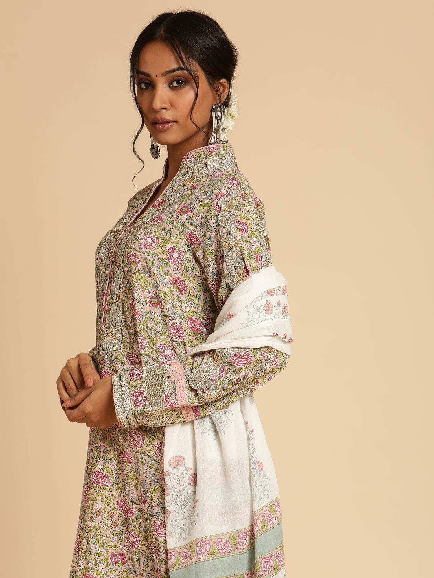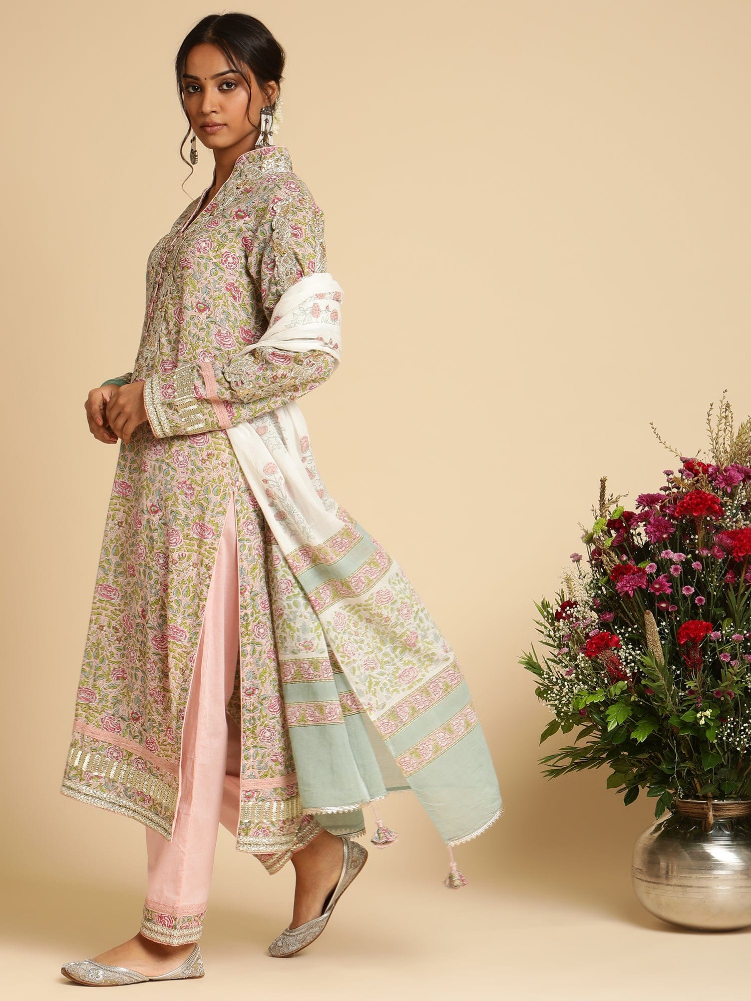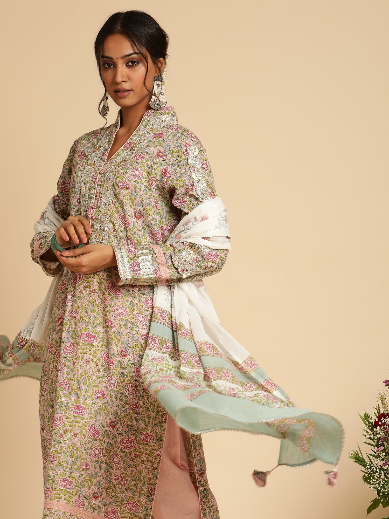 The set of a stylised Kurta and a Dupatta is hand printed in an all over fuchsia pink rose jaal and pastel leaves on rose pink . There is exquisite gota and pink lace work by village women on the ensemble.