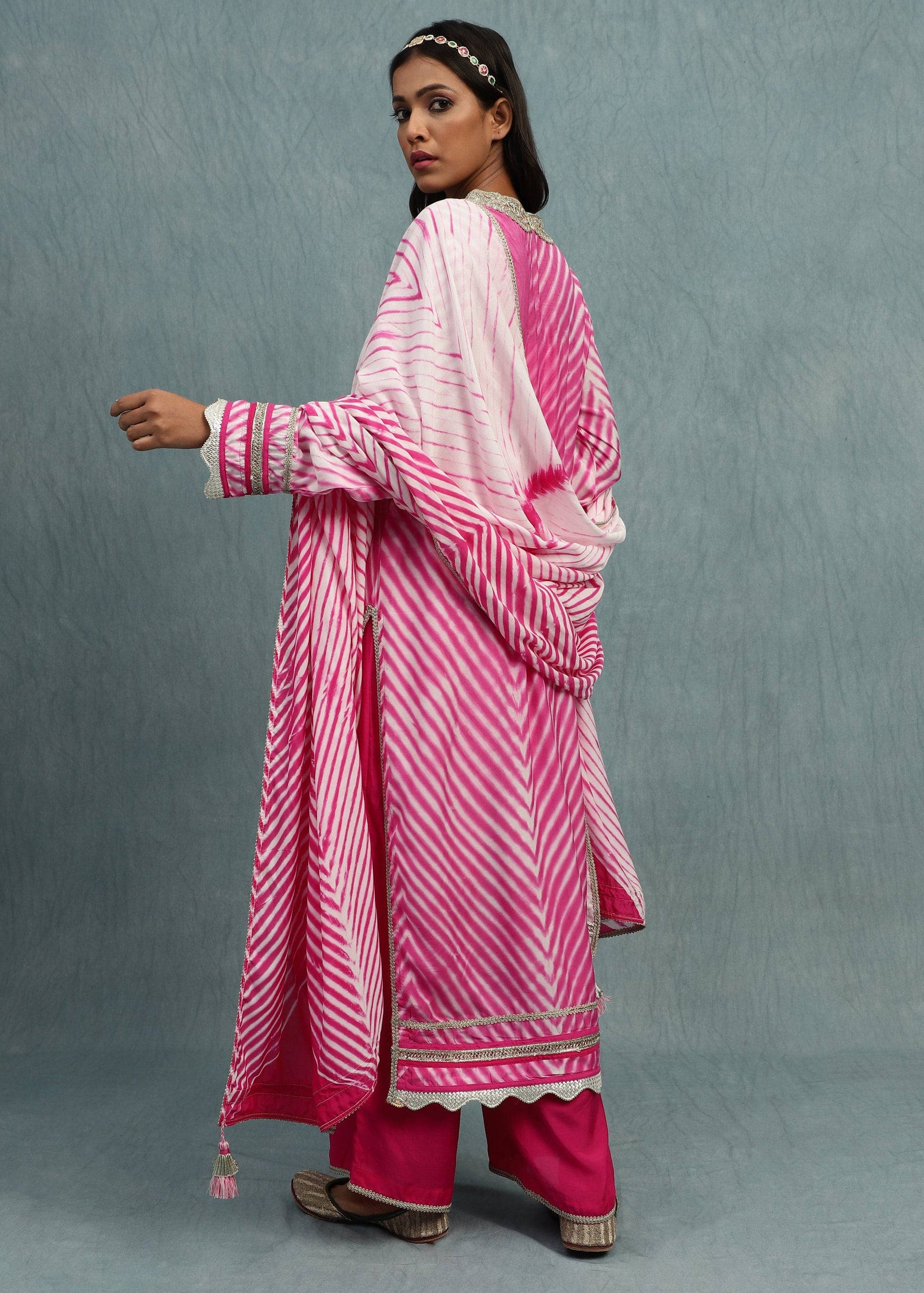 Yumi's Artisanal Clothing is hand dyed Shibori on fine cotton silk by our women artisans. The set of a stylised Kurta and a Dupatta is hand dyed in the Yumi signature shades of fuchsia. There is exquisite cut work gota and details by the village women on the ensemble. Stunning hand crafted thread tassels adorn the dupatta. The plain bottom is finished with the gota.