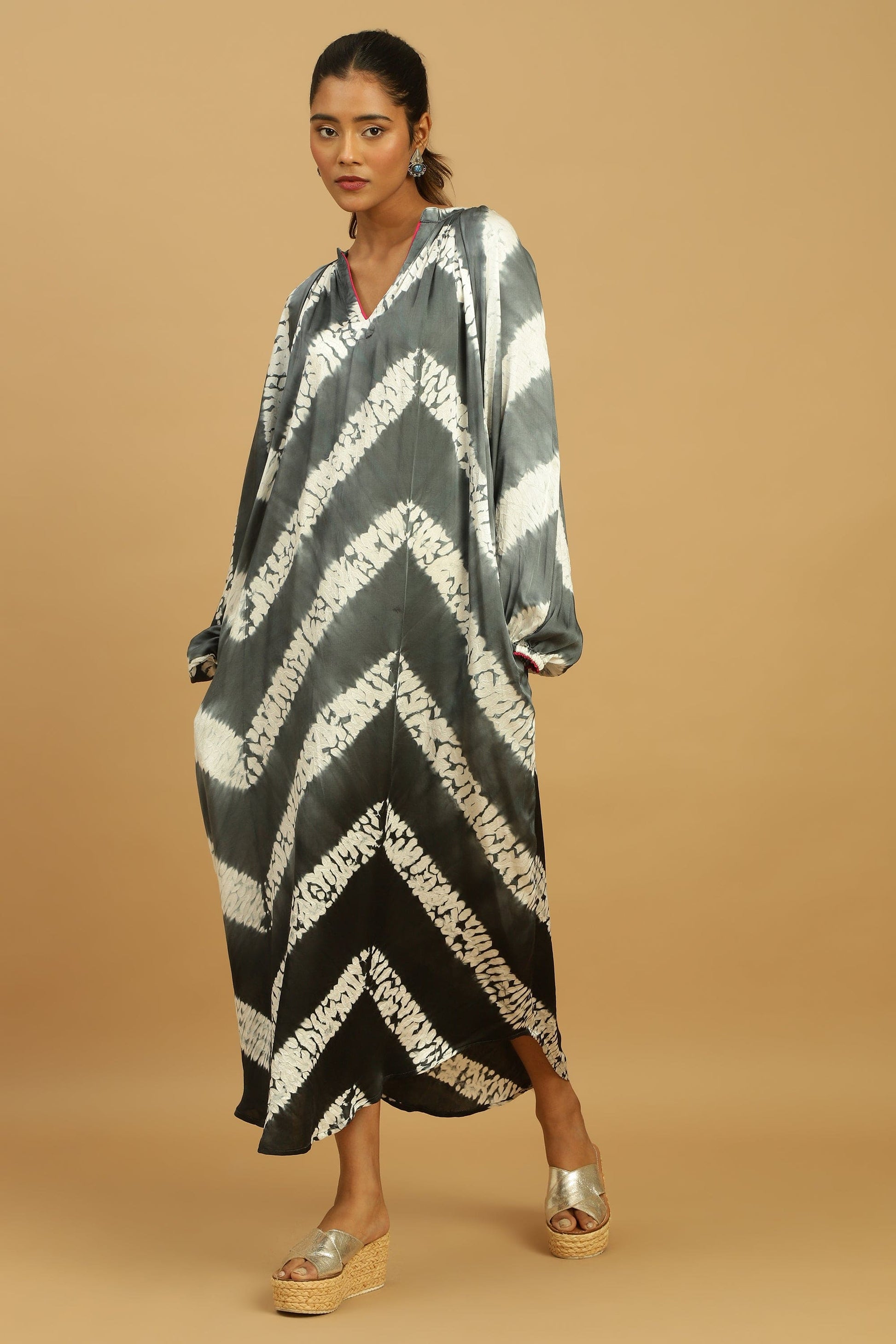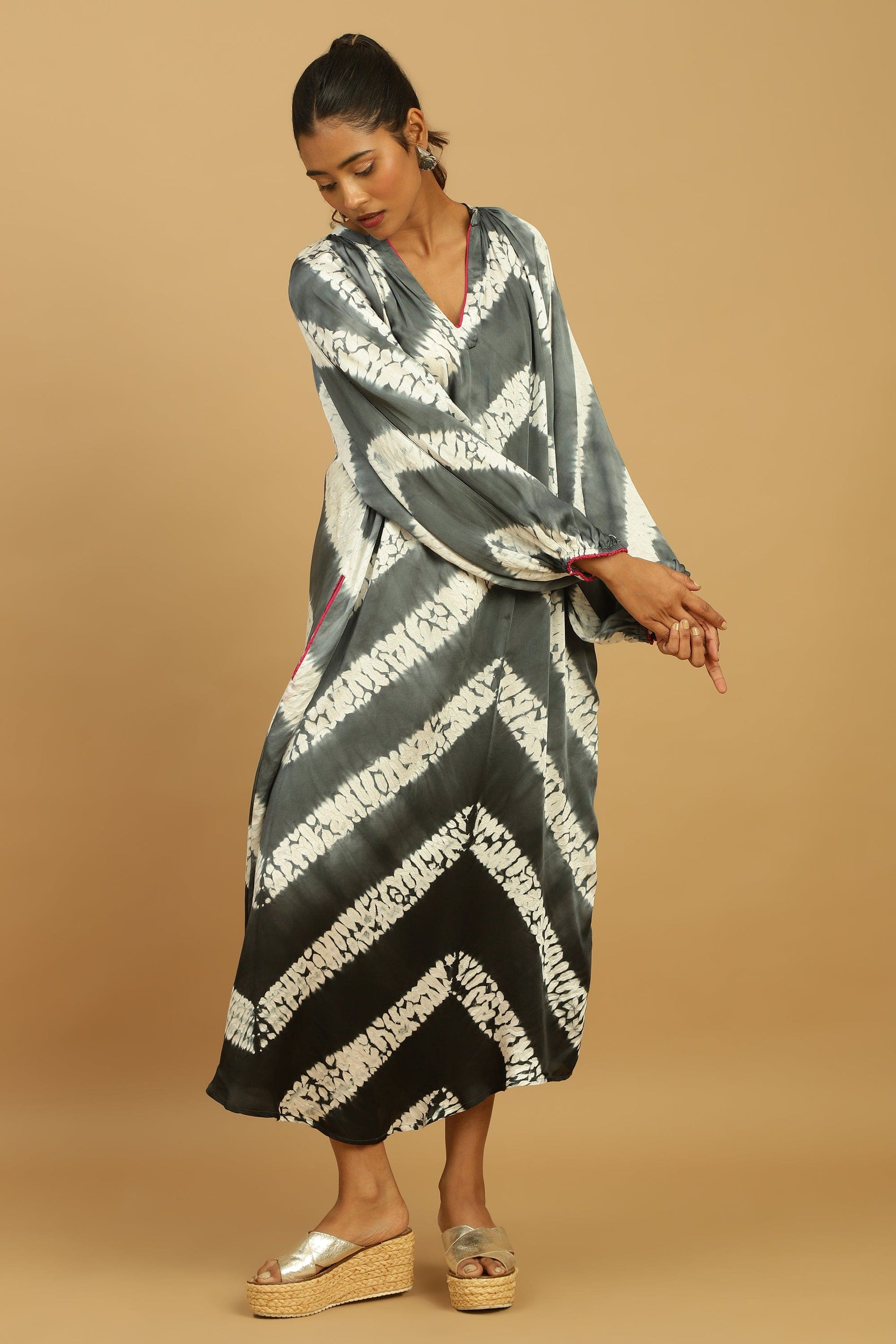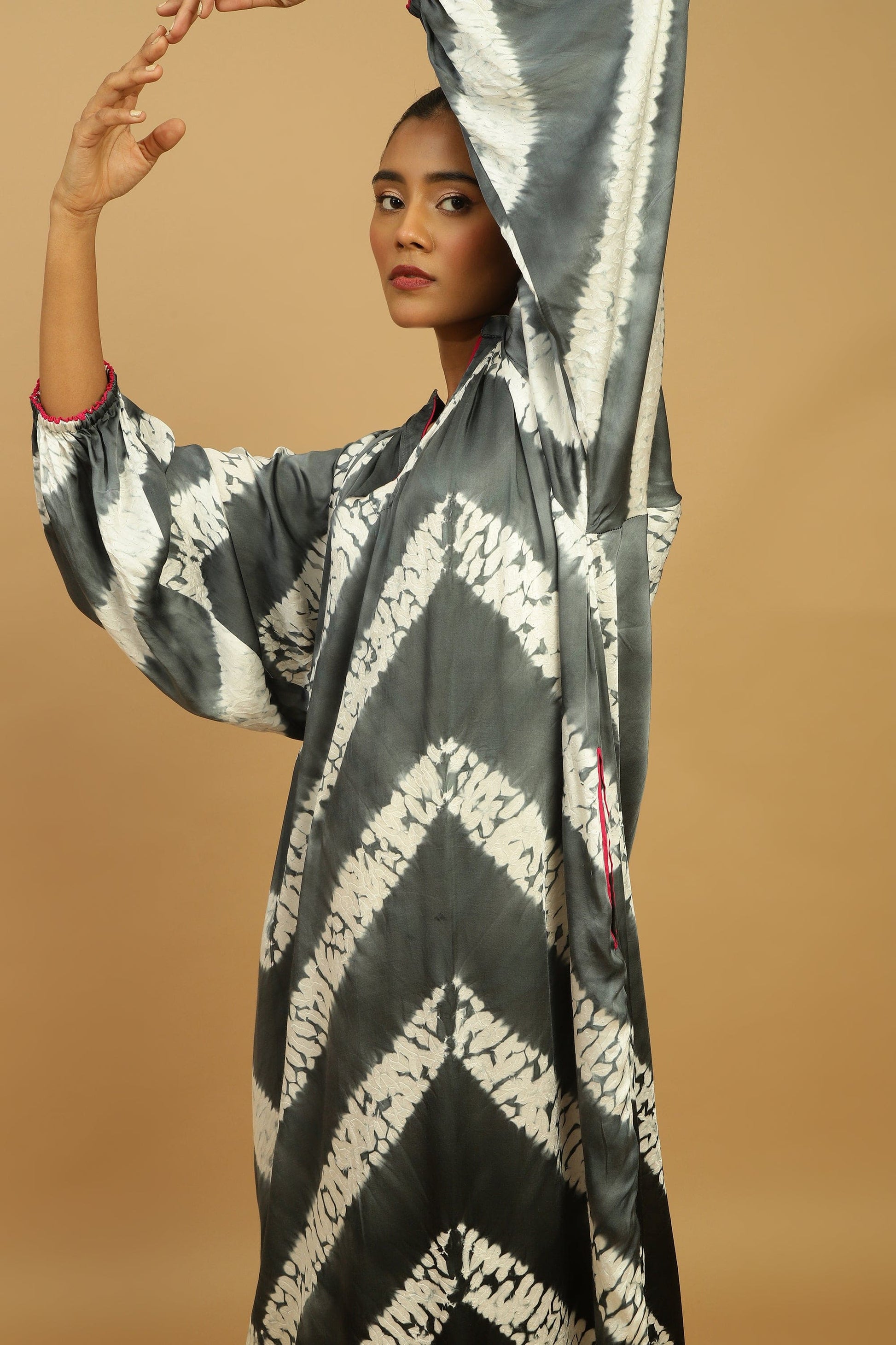 Yumi's Artisanal Clothing is hand dyed Shibori on Cotton silk by our women artisans. The Shibori Dress is hand dyed in Ombre shades Grey and Black.